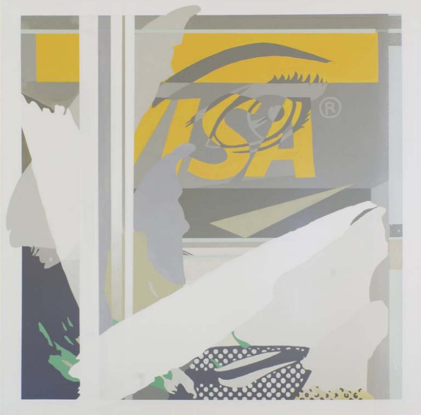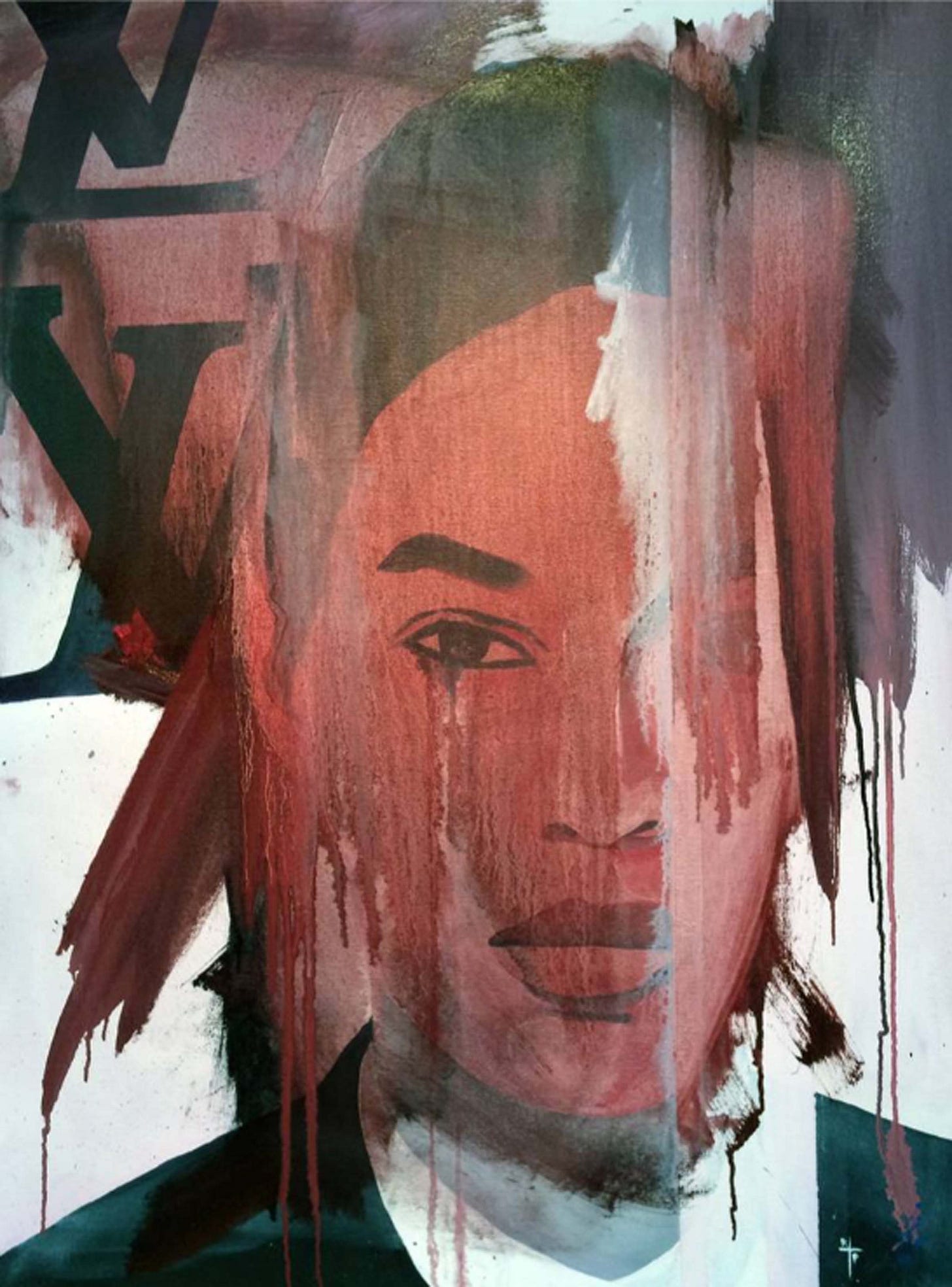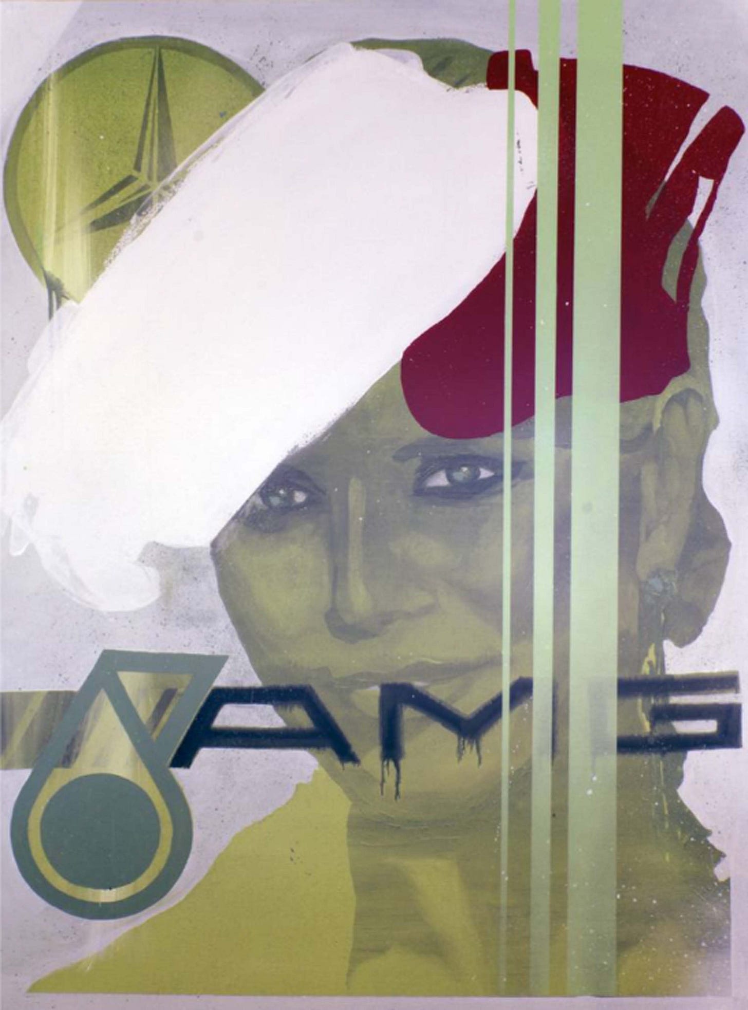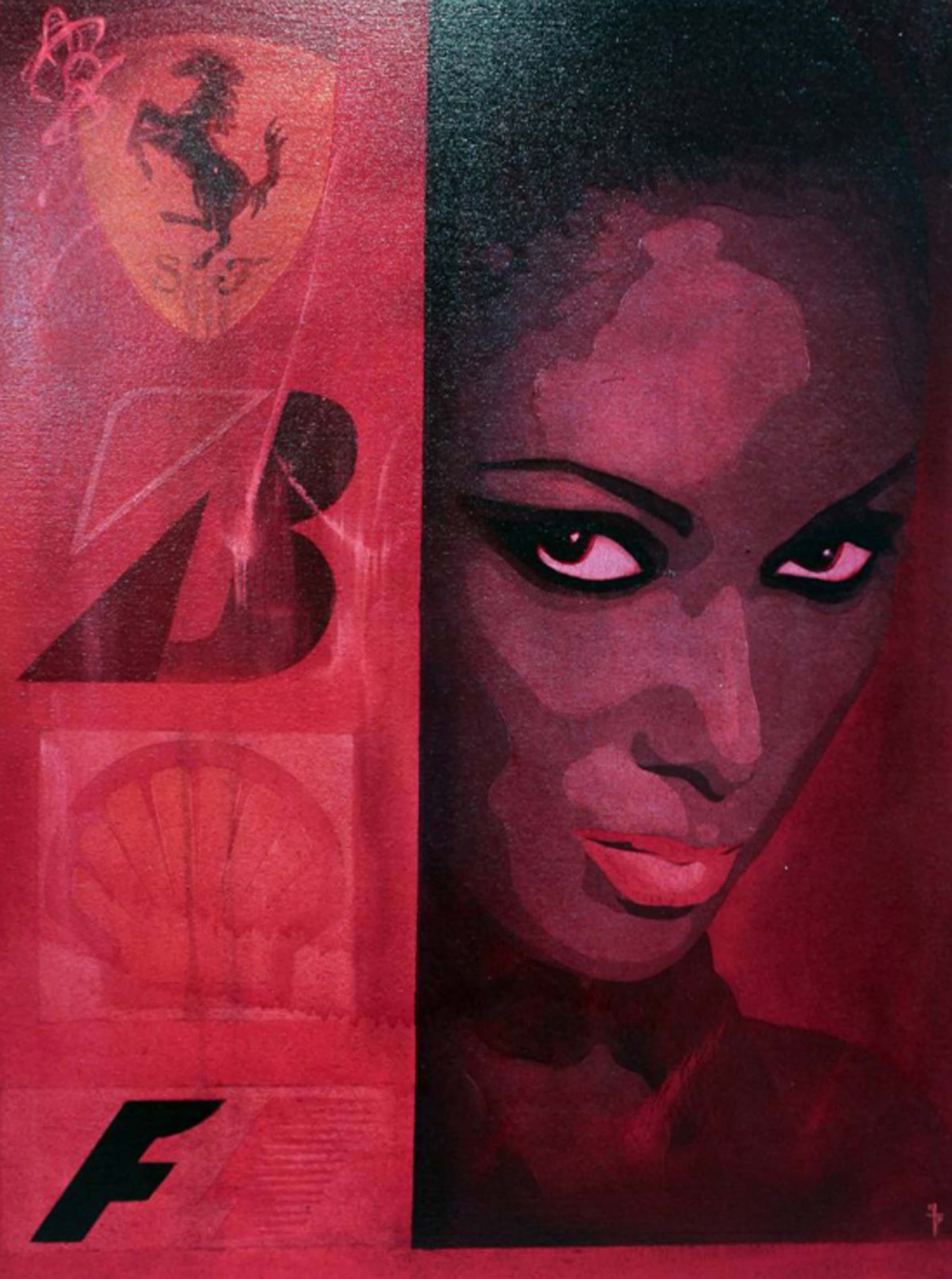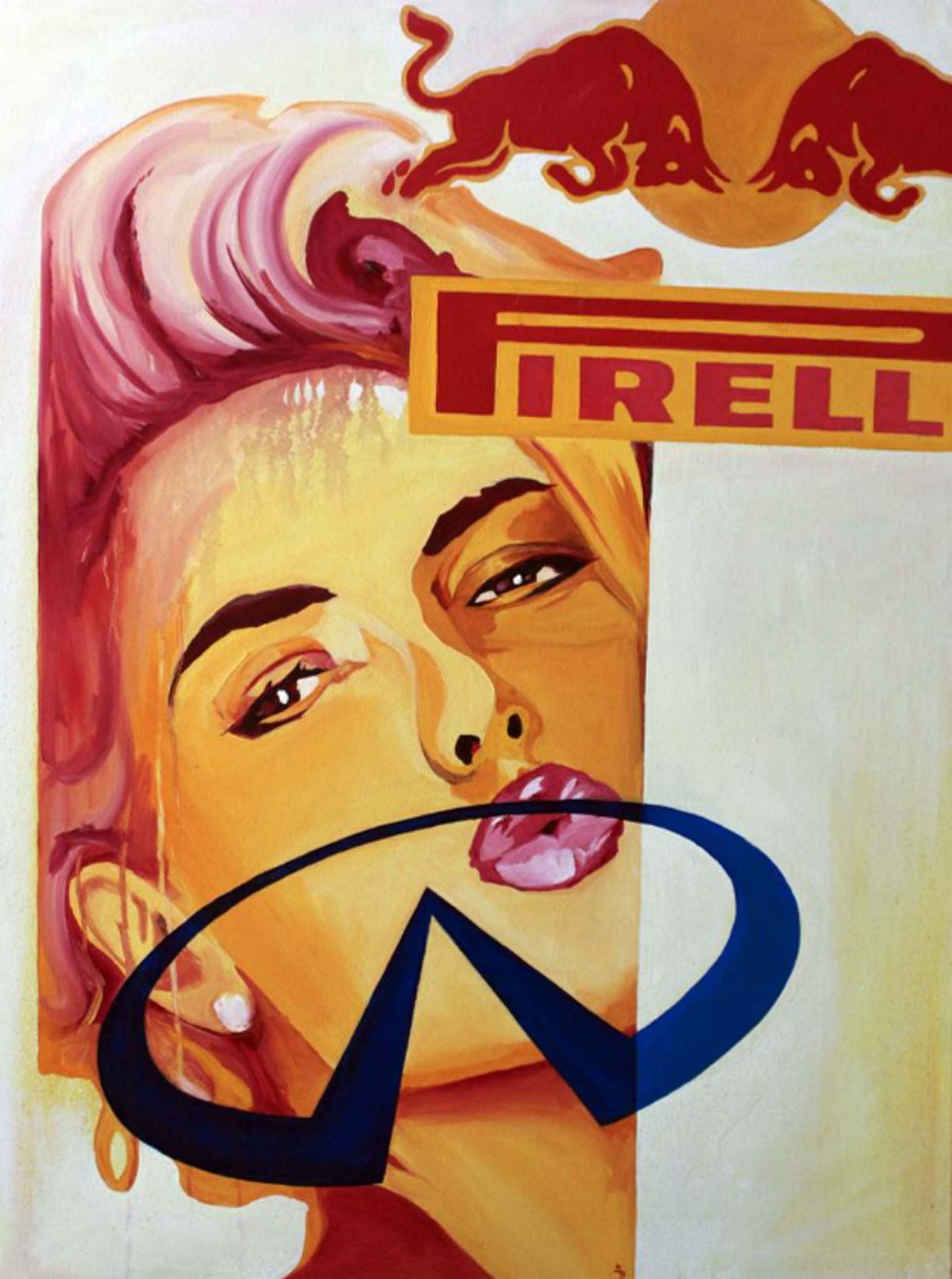 Red Horse (pictured below) represents an almost retro 1980’s or early 1990’s magazine cover with dated make up and aged imagery. The woman offers a striking pose of confidence followed by several corporate logos of car manufacturers and oil companies such as Ferrari and Shell. The painting almost represents a celebration of the excesses of capitalism, even if not celebrating the system itself. With a deep red monotone painted throughout the composition and heavy contrast, Red Horse portrays the message with just red, black, and hints of muted yellow. Geometric and incorporating publishing design elements, the painting comes off as a more refined interpretation of popular culture.