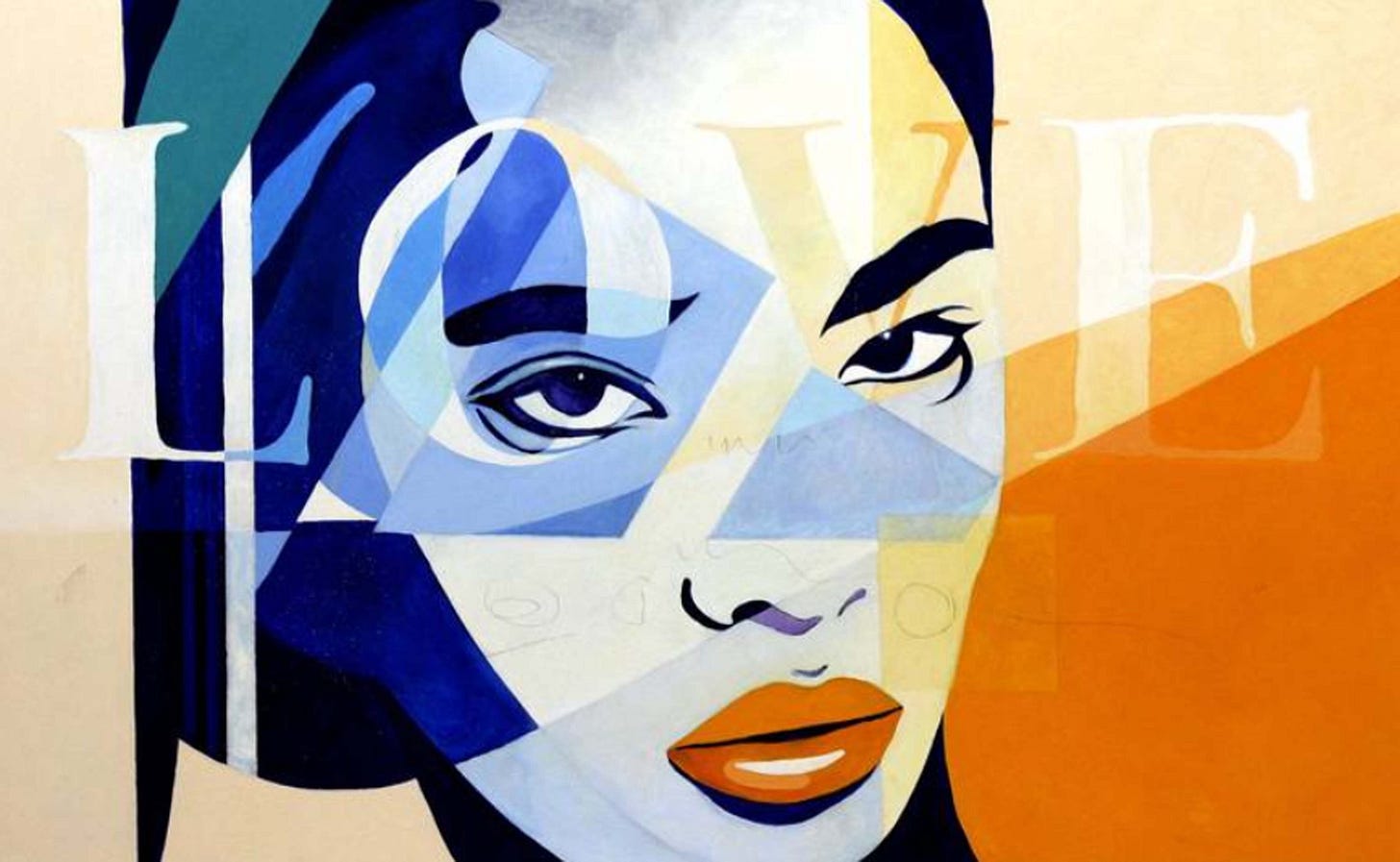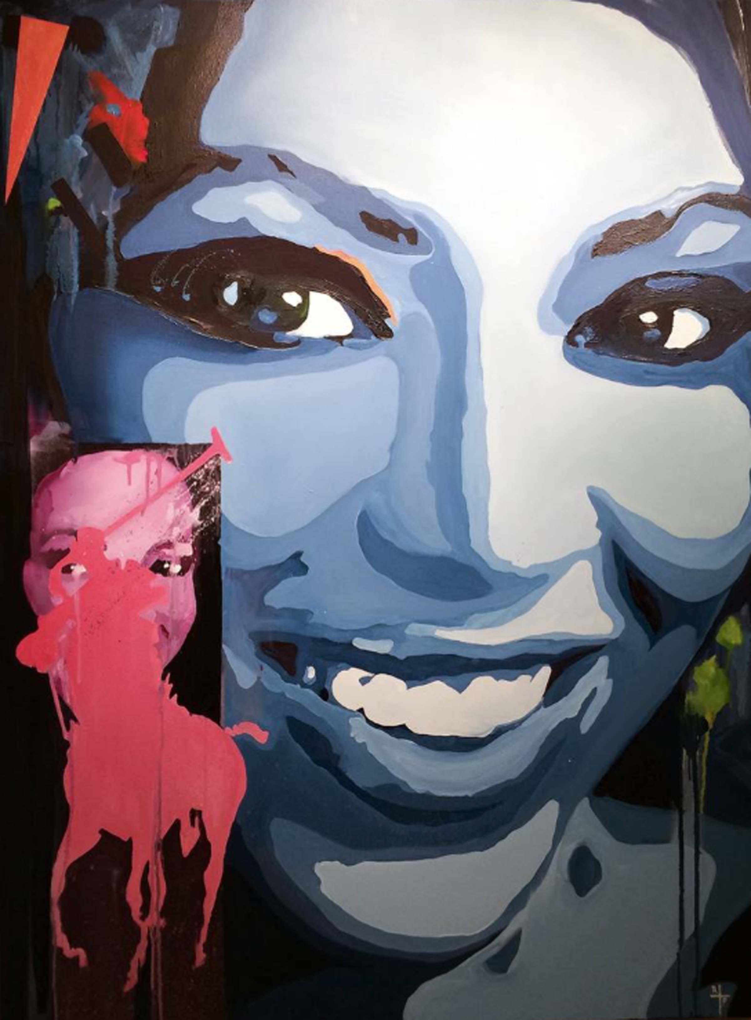 Two notable and striking works would be Her Blood is Joy (pictured above) and Madison Park (pictured below). Using extreme expressions in contrast and blinding glares of highlights the paintings represent several repeated images of the subject in a collage or magazine type format. These beautiful models represent varying degrees of emotions in clear distinct facial expressions with the one below expressing a flirtatious smile while the painting above conveys cocky and serious confidence. Executed with cool bluish grays on their skin tones with swirls of muted pastel colors in abstracted form, the paintings offer a pristine finish and variation in expression.