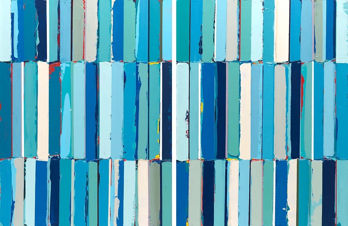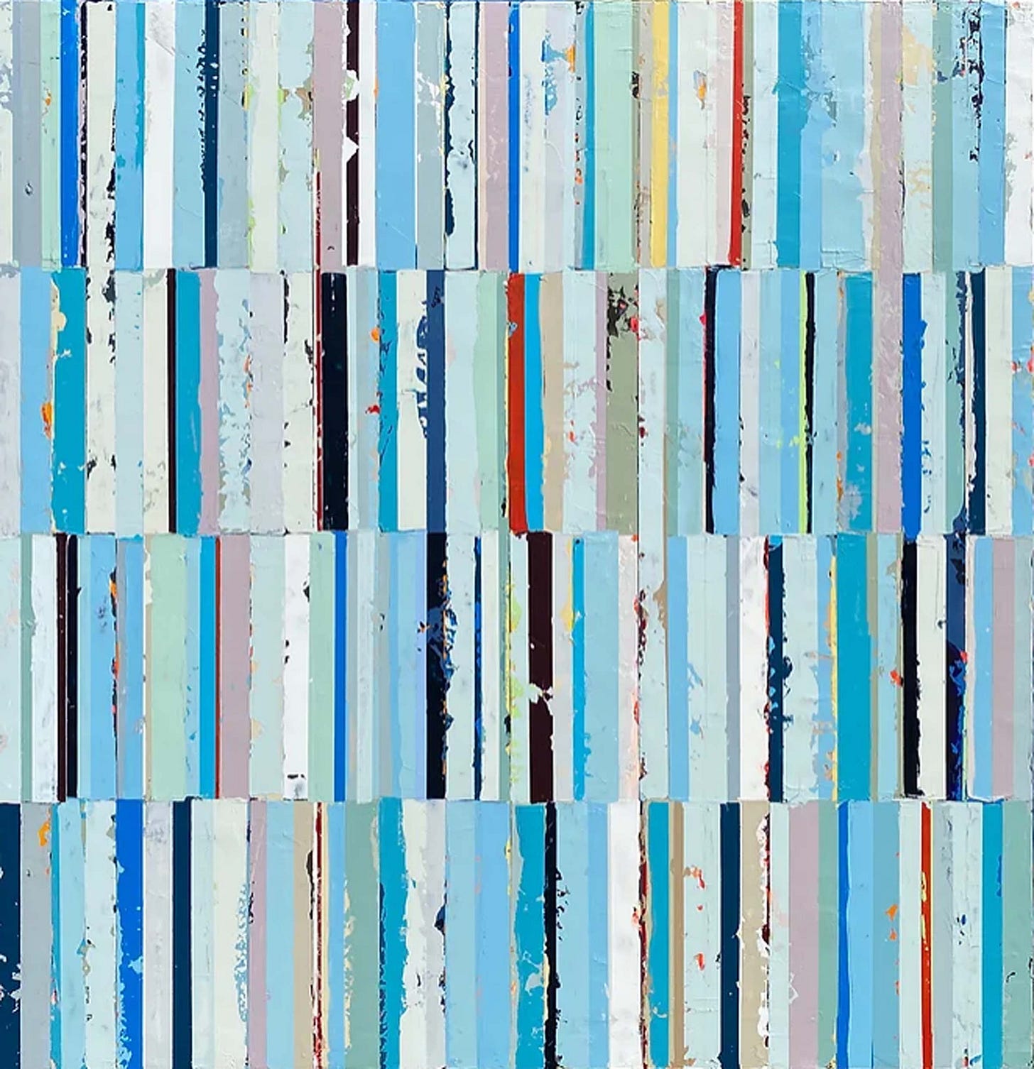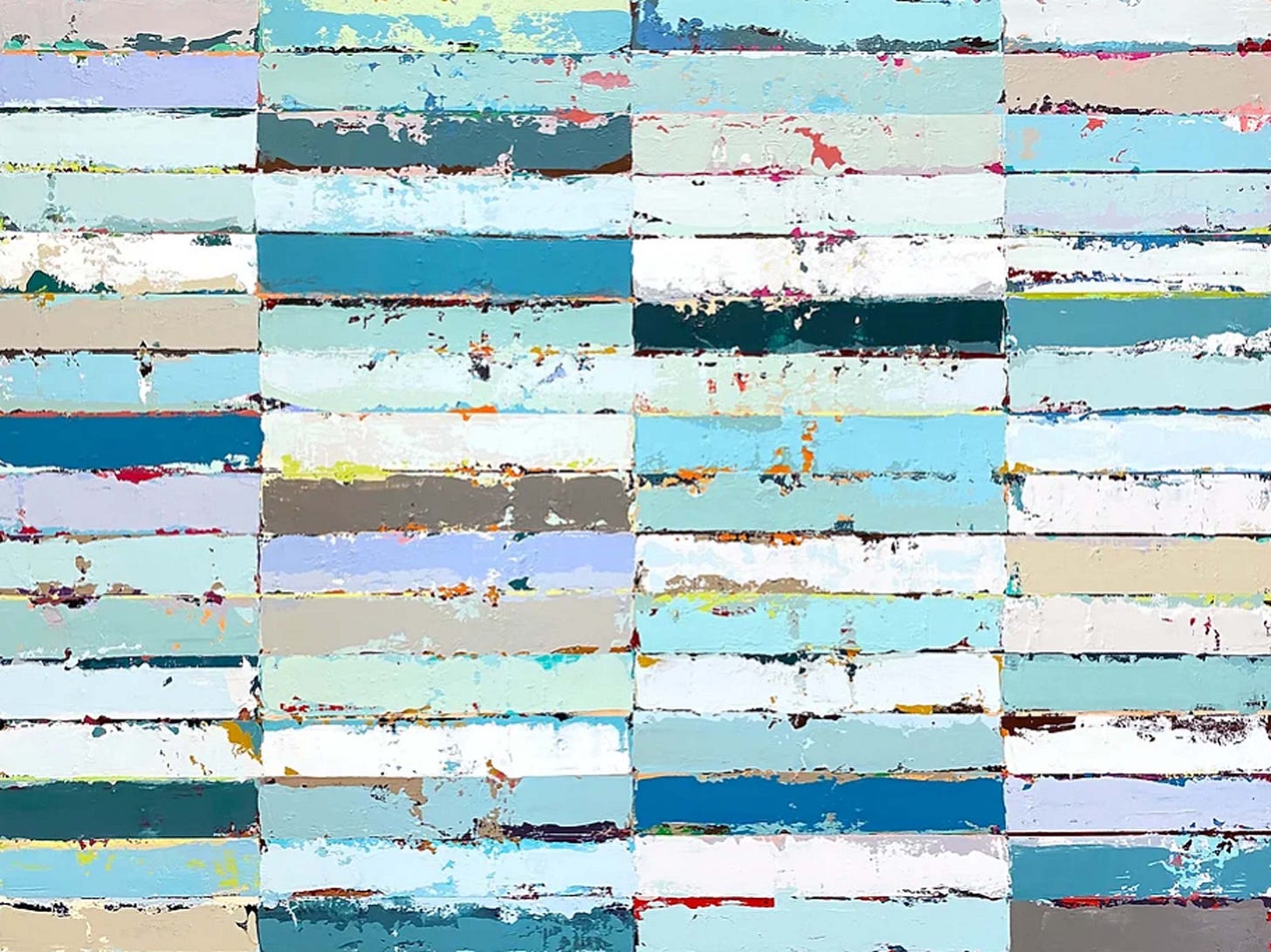 With a sense of grit and compositional expertise, the paintings, although roughly applied, come off clean, crisp, and holistic towards an intricate design. Some of the works may appear almost monochromatic while others reflect careful color formations to reflect a concept such as pale and rustic pastels to emit the notion of a beach boardwalk. Usually non-objective, the paintings convey emotionally-inducing palette knife strokes which reflect a grainy smear and atmosphere of layered constructs of paint and surface.