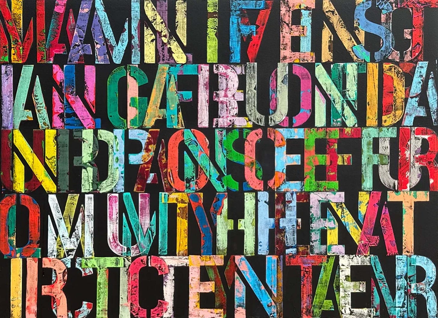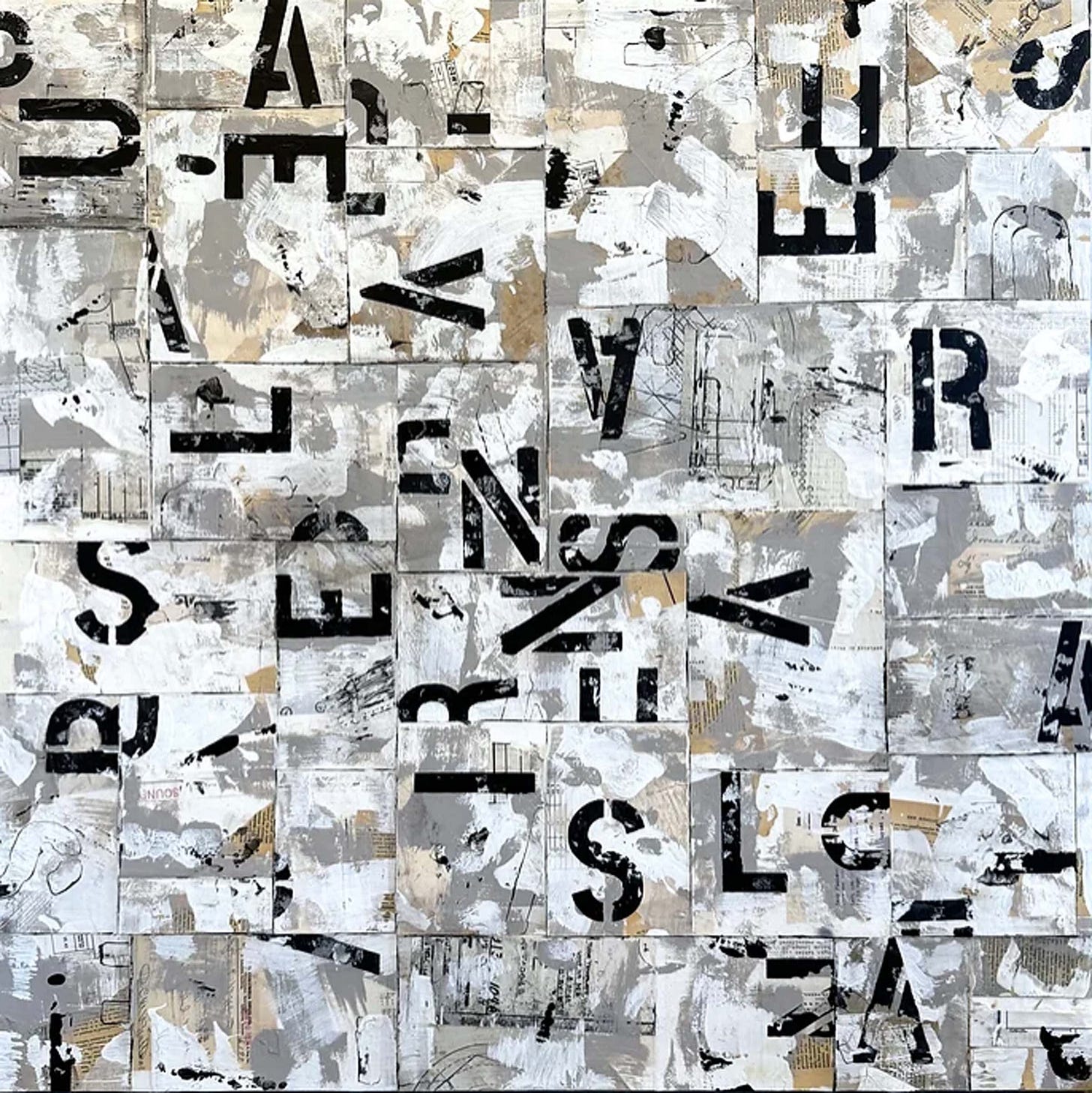 Universal (Law of Attraction) (pictured above) remains a painting of deep complexity with carefully arranged letters strategically placed with each other. These letters are laid out either vertically or horizontally and sometimes in portions. The cool, pale background of grays and whites contrast sharply with the stark black of the stenciled texts. Vintage paper underneath the paint almost appears like newspapers or mechanical engineering drawings as we can vaguely view intricate line work which could also be portions of grids from various forms. With a sense of ambiguity and mystery, the painting could be interpreted as an aesthetic in texture and contrast.