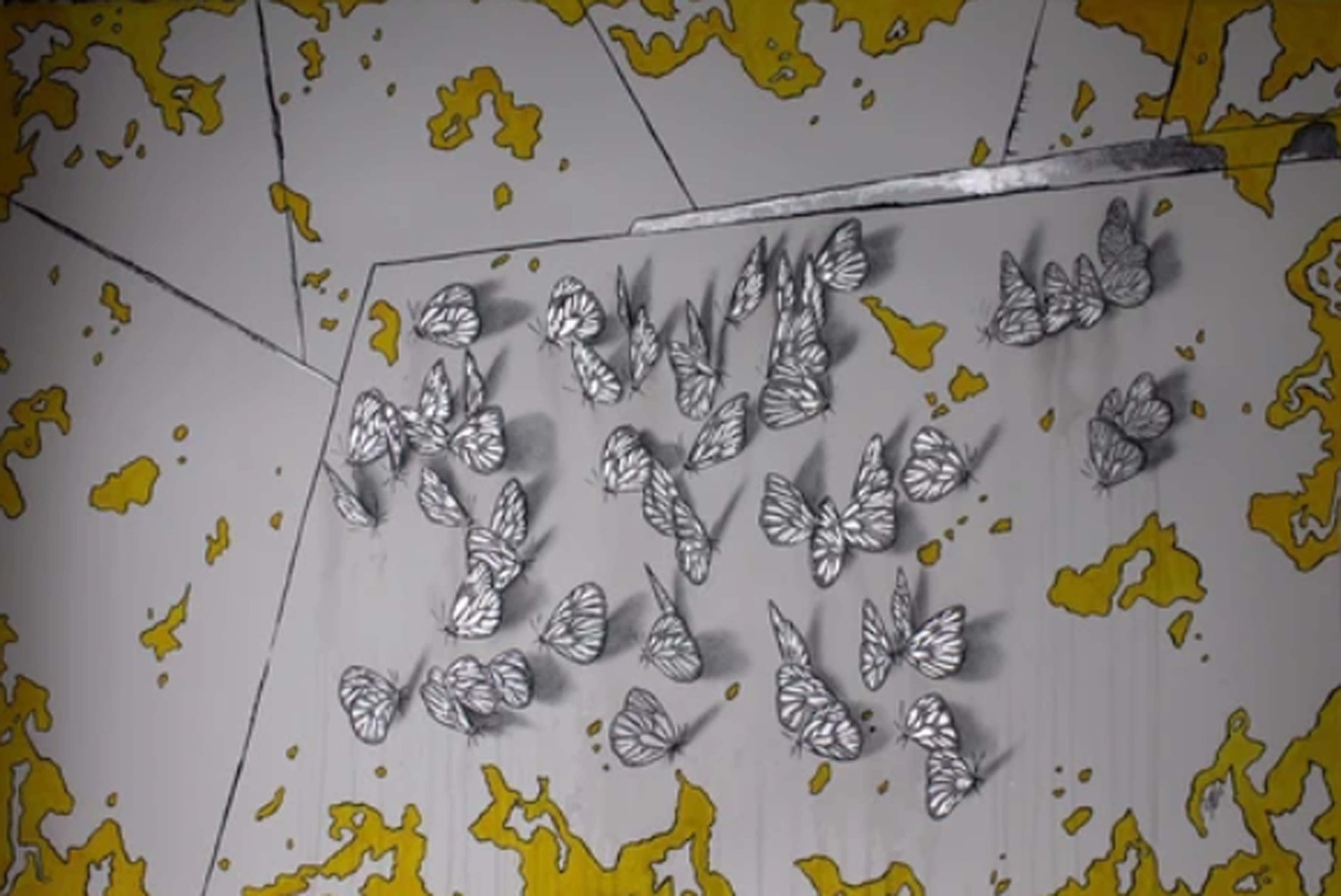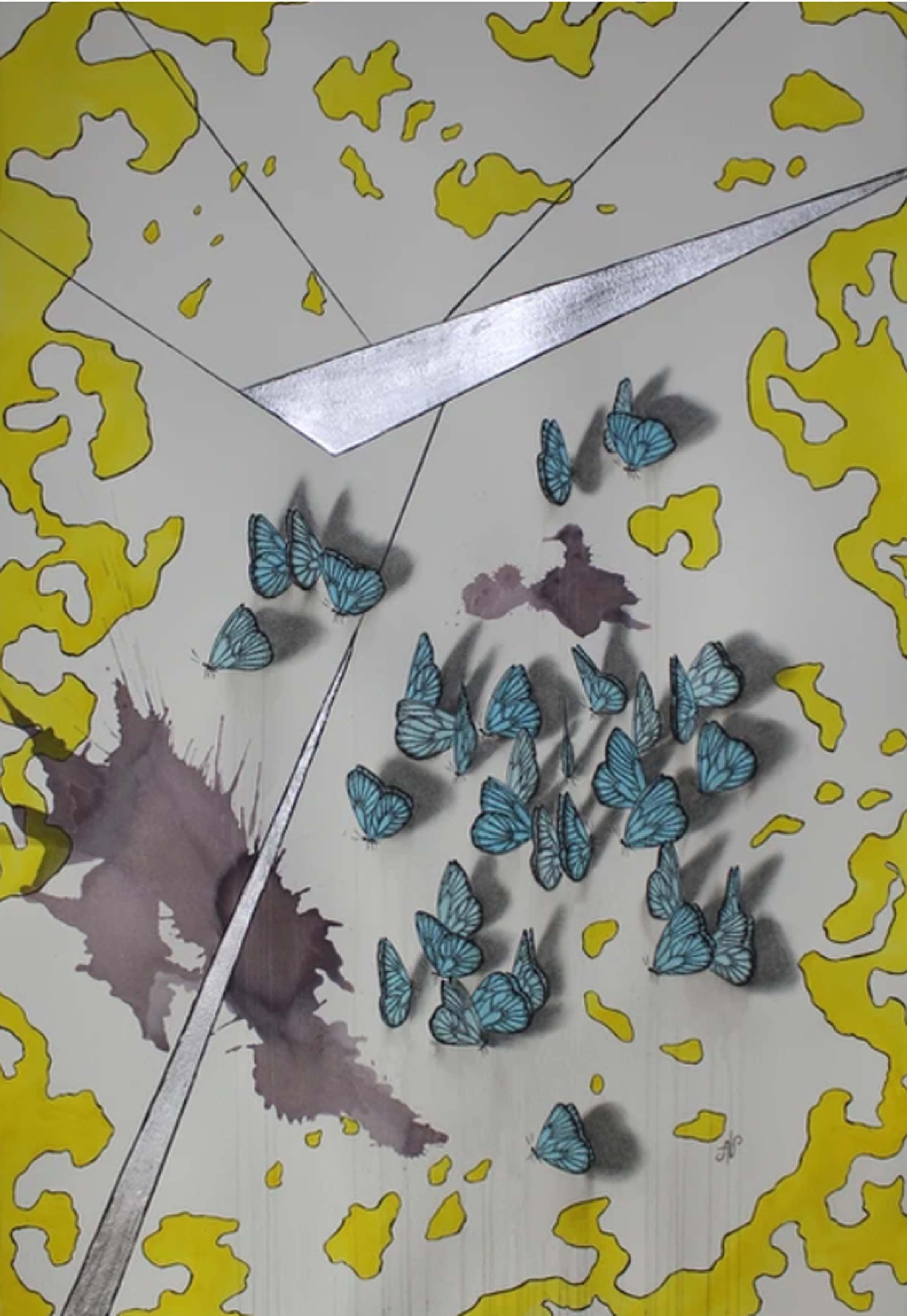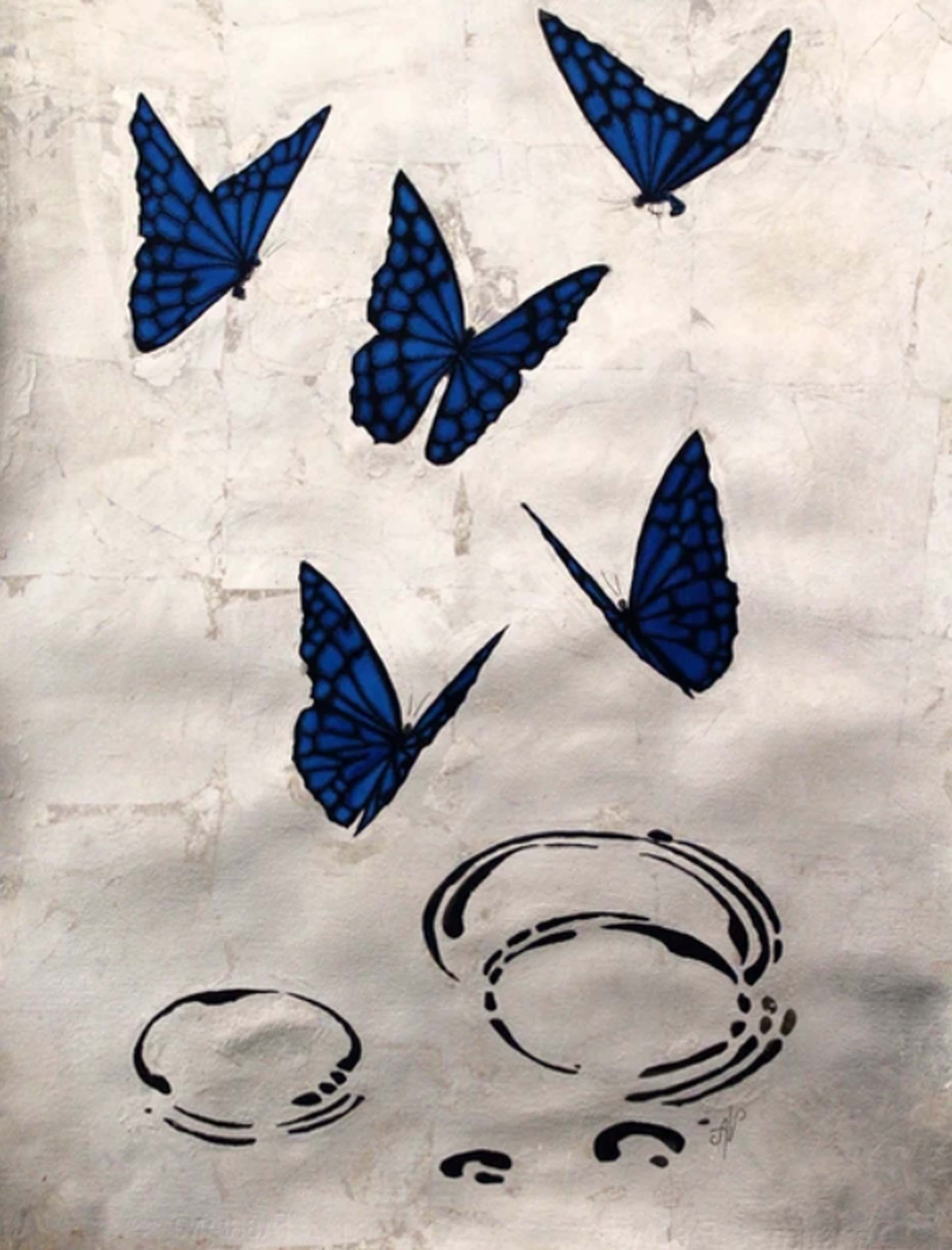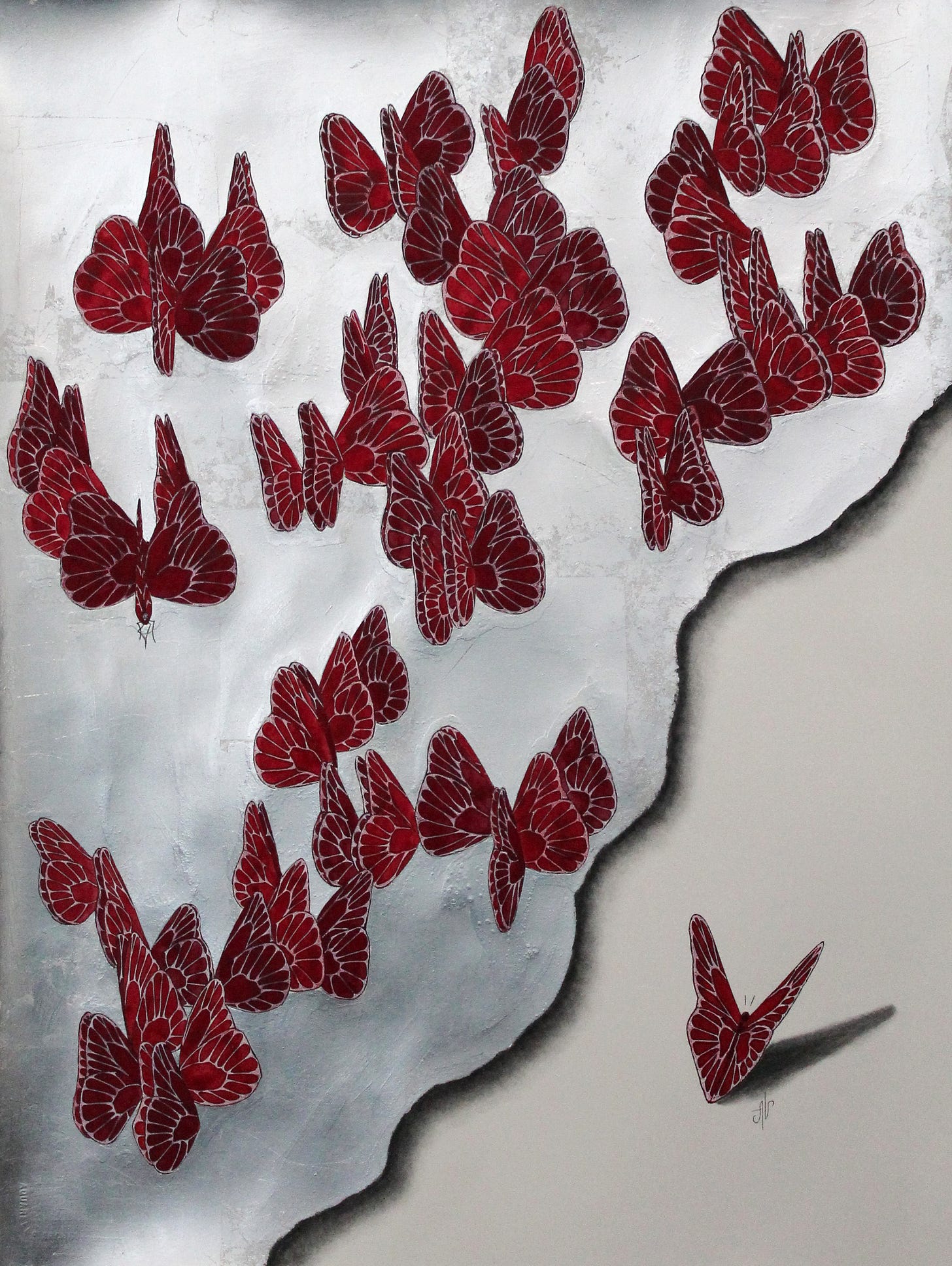 Observing Butterfly Series #27 (pictured above) we come across what almost looks like the shape of a continent in silverleaf spread across the surface, perhaps the eastern seaboard of the United States for example. What we have are two distinct surfaces separating a swarm of butterflies from a single one. Collectively, the butterflies frolic so closely together in over a dozen groups to the point of various X-shaped-forms. While all the other butterflies are happily socializing and flapping their wings, the lone butterfly to the right side of the painting sits idly by resting on the surface as if she just landed from flight. In a sense the work could be interpreted as a metaphor for socialization and solitude. Reflecting a sense of introvert to extrovert commentary.