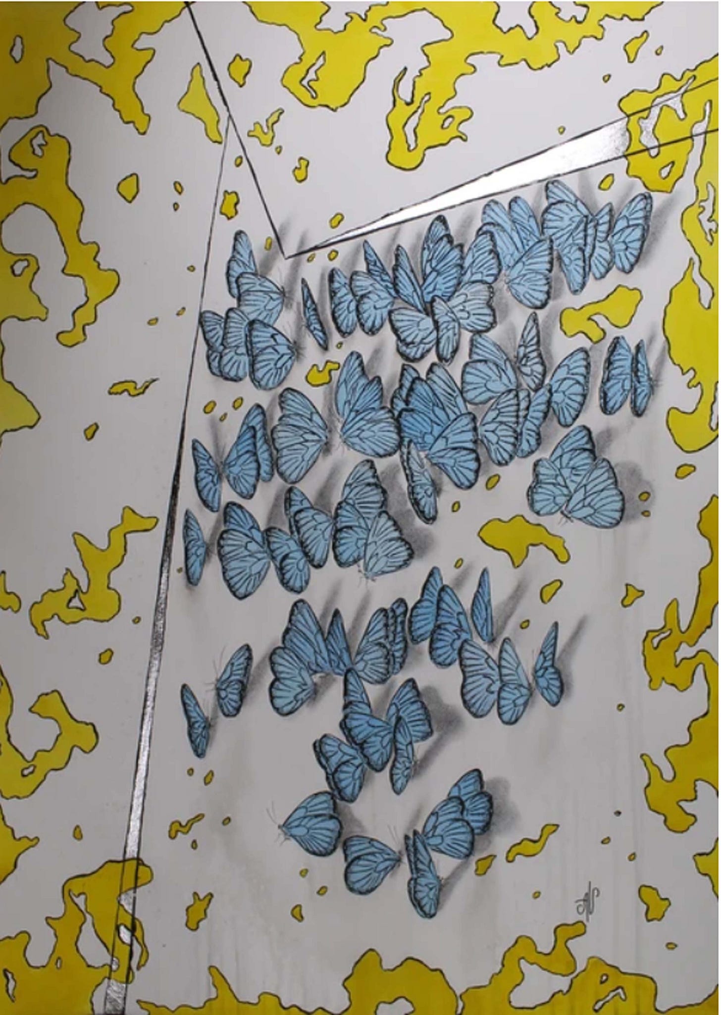 Butterfly Series #23 (top of article) reflects a rough, minimalistic surface with a swarm of blue butterflies spread out in an asymmetrical diamond shape. Perhaps Alena’s best example of execution in design, the viewer may notice the rare occurrence of blue and silver being the main tones within a painting, and surprisingly just how well they go together. Both reflecting cool tones, the butterflies almost look as metallic as the surface in which they fly above. The butterflies are most concentrated slightly off-center flying around in an impressive vertical cylindrical spiral.