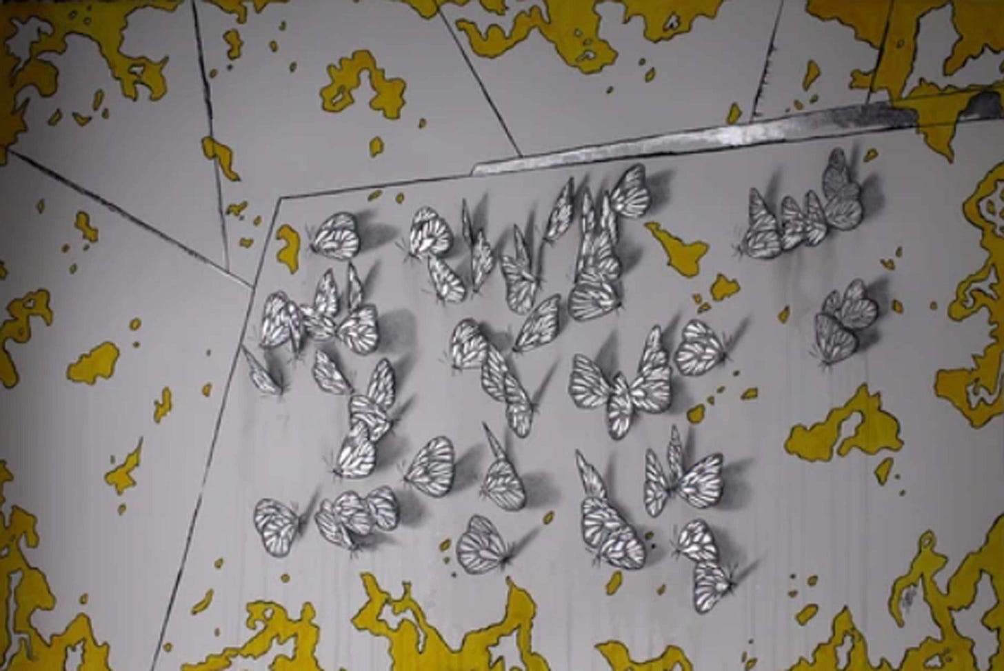 Often incorporating precious metals such as silverleaf and / or goldleaf in her works, Alena often rotates through watercolor, ink, charcoal and usually mixes all the elements together. Her most interesting works on paper tend to have silverleaf because of the metallic sheen which sometimes reflects on the butterflies. In some works, the butterflies almost appear like machines with lines of silver, black, or white hues in their wings complimenting the pristine sheen on the precious metal on the paper. Without focusing too much on the subject matter, the paintings may come off as perfect layouts in design, often incorporating asymmetrical diamond shapes leading the eye geometrically across the surface.