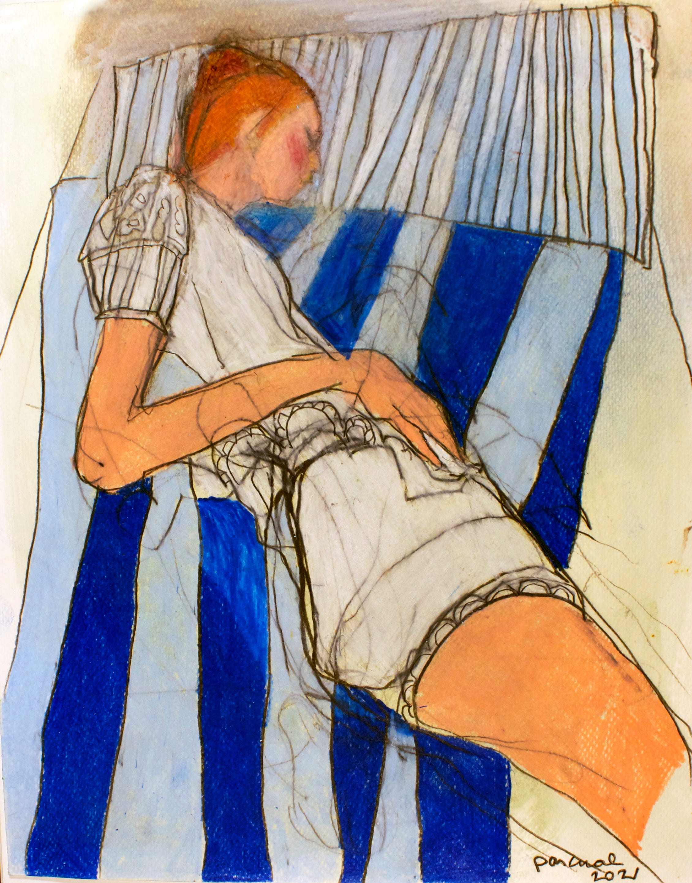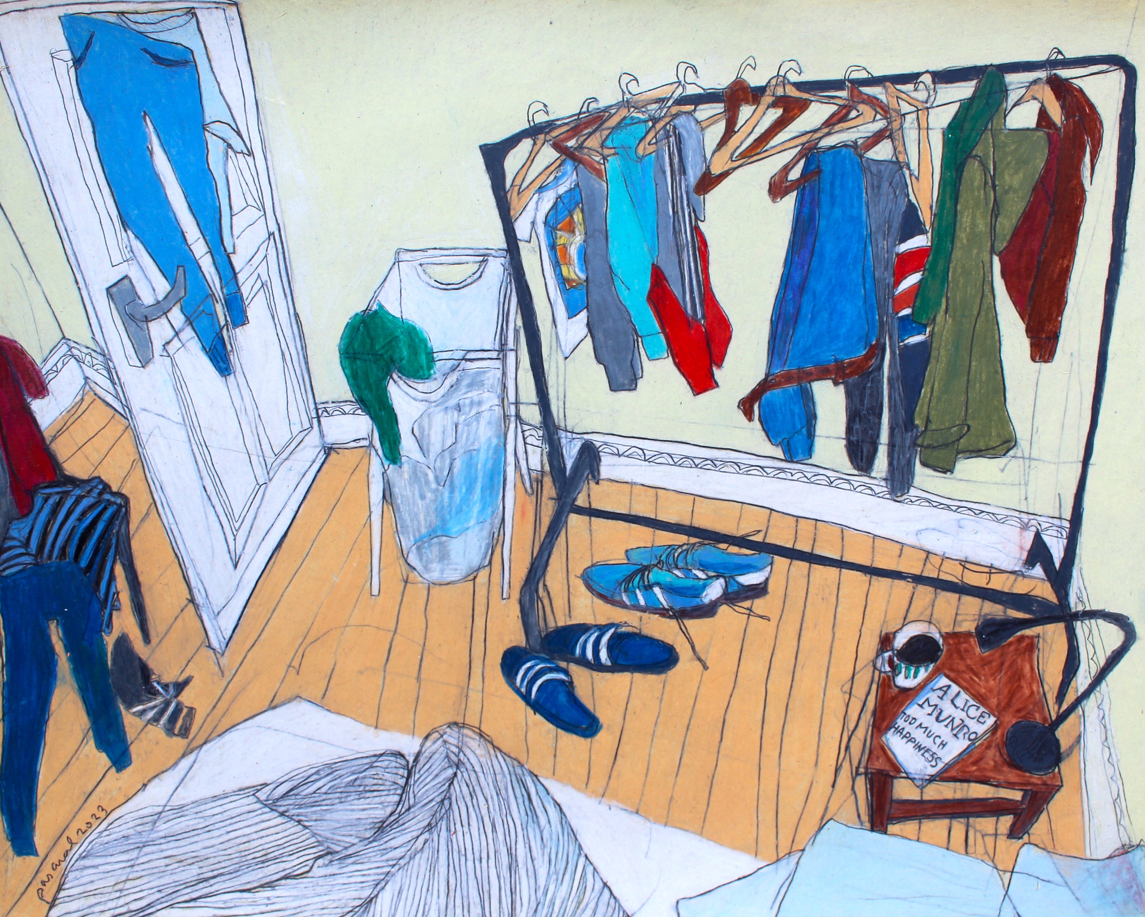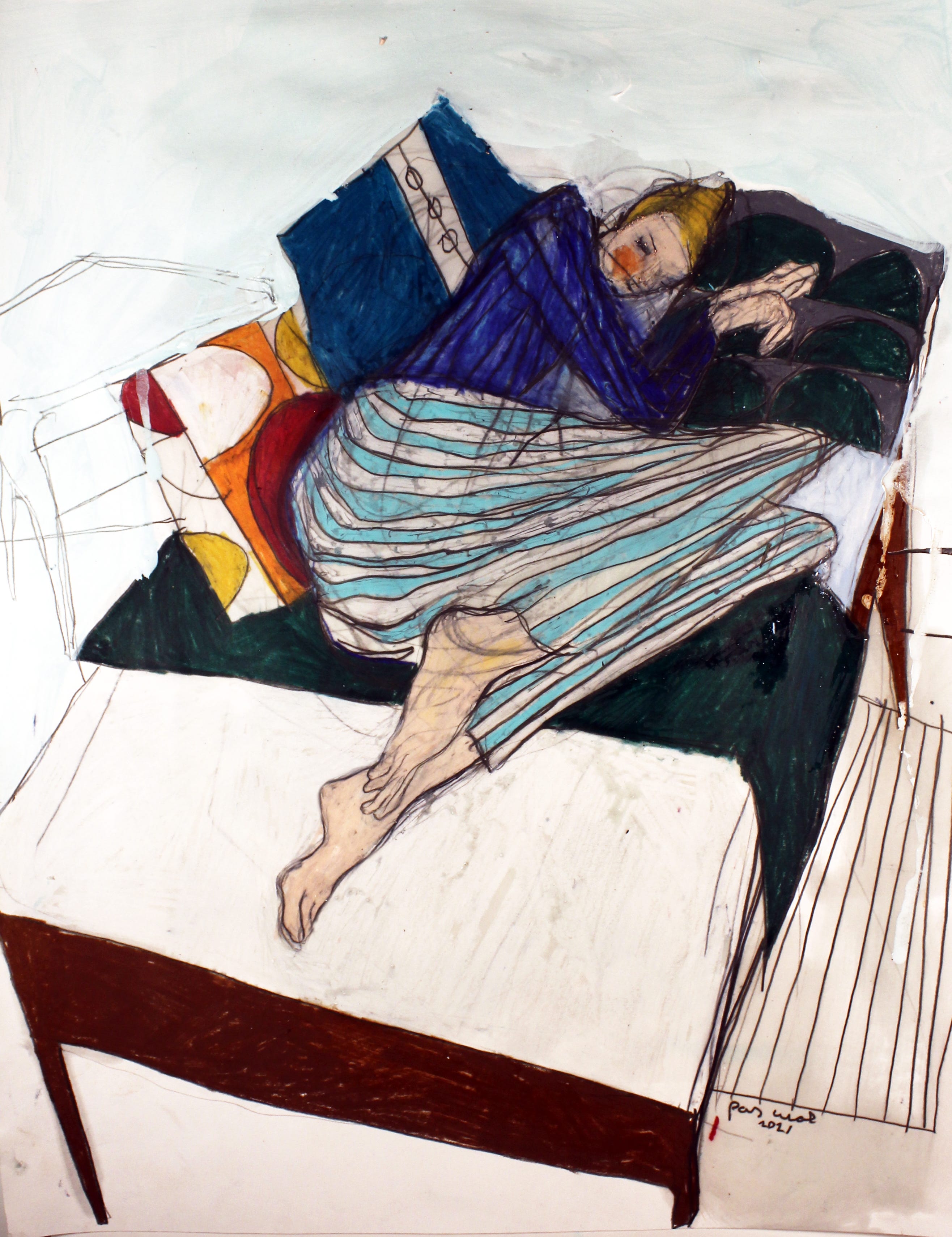 Inspired by great 19th century masters such as Pierre Bonnard and Éduard Vuillard, Alex applies his own personal interpretation of how figures interact with their environments. Wearing contemporary attire with modernistic interiors , the women in Alex’s drawings are a reflection of current times. From depictions of skinny jeans hanging in a closet to lingerie as well as Adidas slippers and shoes placed on the floor, the interiors remind us of their contemporary inclinations and references. These sketchy and expressive interiors and women contain a variation of color derived from the imagination and design elements rather than of observation. Alex’s subjects contain a smooth blend of pale hues followed by thin irregular outlines of black indicating a separation of form. The play on perspective remains quite interesting with rooms and beds appearing to distort in ways as if to follow the angular limbs of the figures or to enhance the composition. Through stretching and weaving, the planes are guided towards angles which remain flat as well as directed towards our attention.