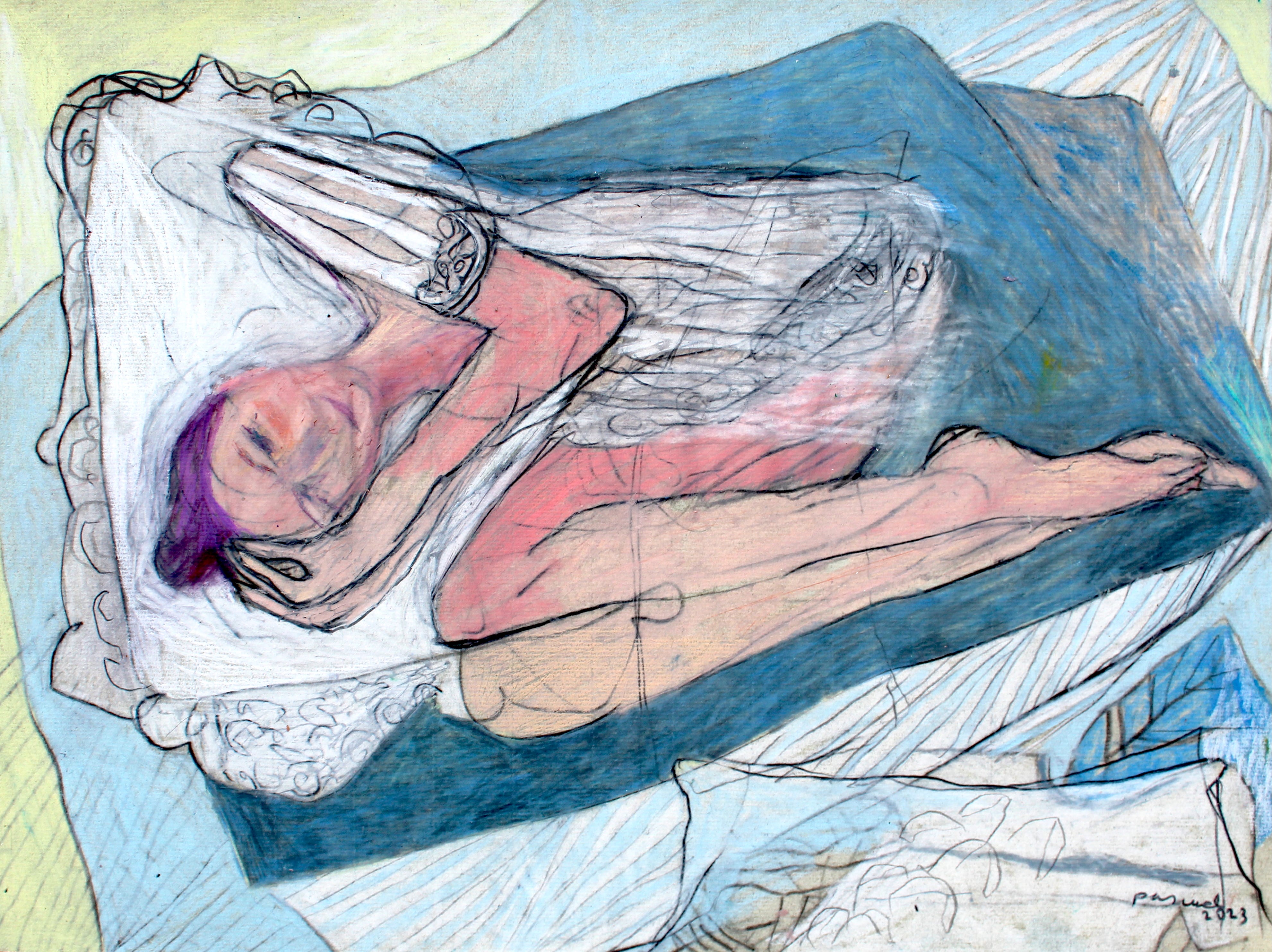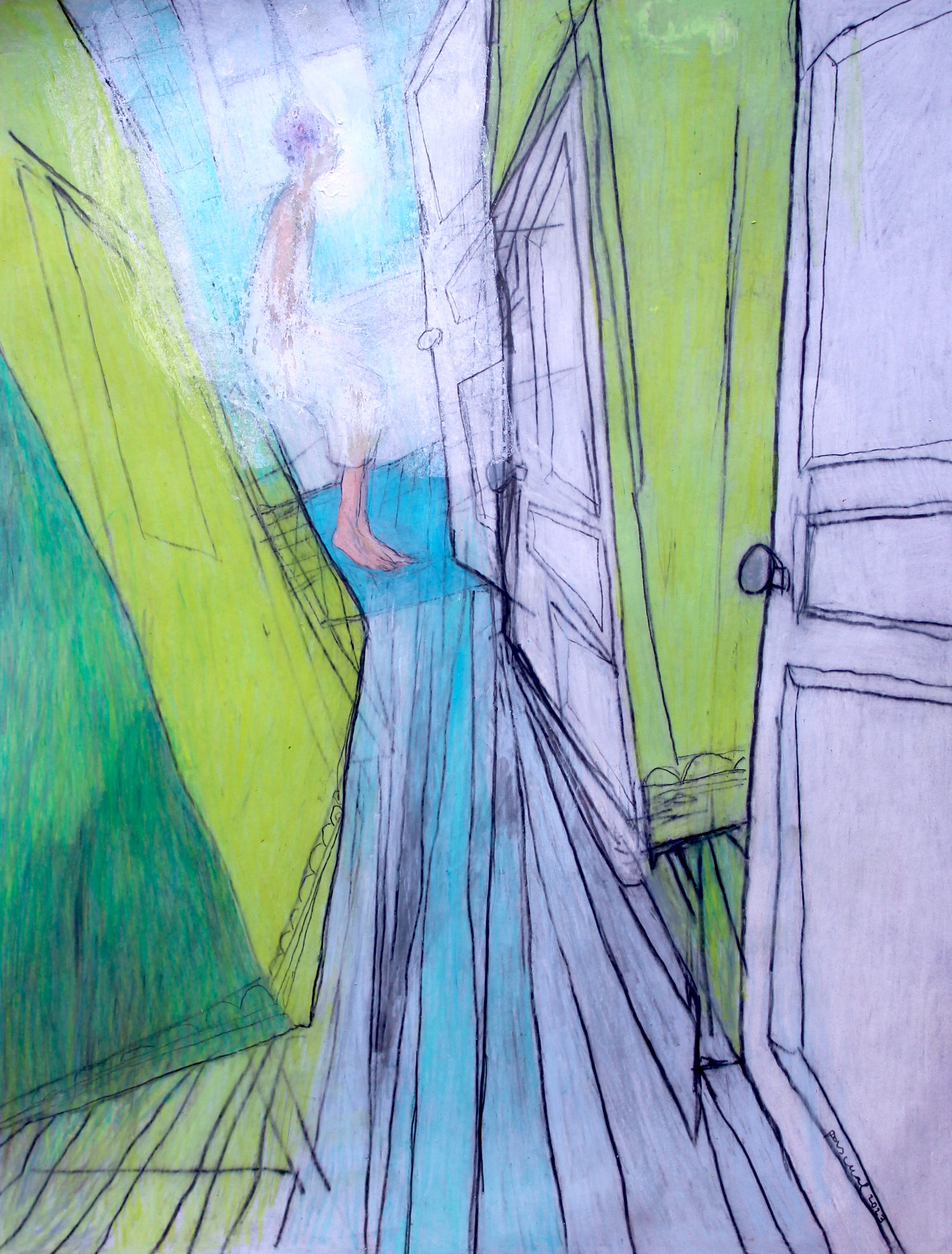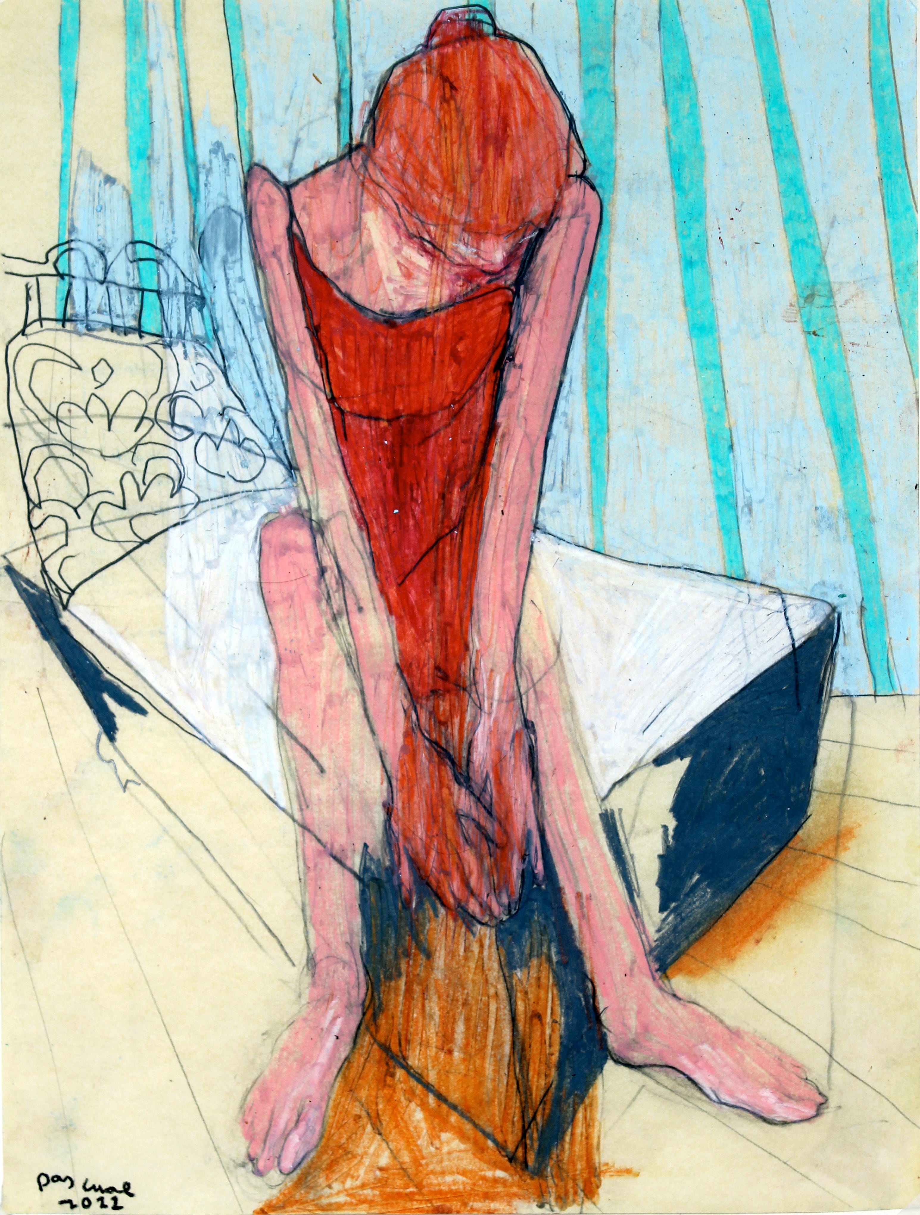 These color pencil renderings tend to depict women in isolated and enclosed interior spaces. Alex’s interiors and figures are highly distorted as if the image were pinched from a corner, containing elastic and angular curvature and focal points. His colors are often muted and toned down followed by strategic spaces filled in with white and subjects outlined with black lines. The women contained in the compositions convey body language which evoke melancholiness, sadness, despair, mourning, and perhaps even trauma. Such body language includes curling up in a ball on the bed, placing their heads down, or closing of the eyes.