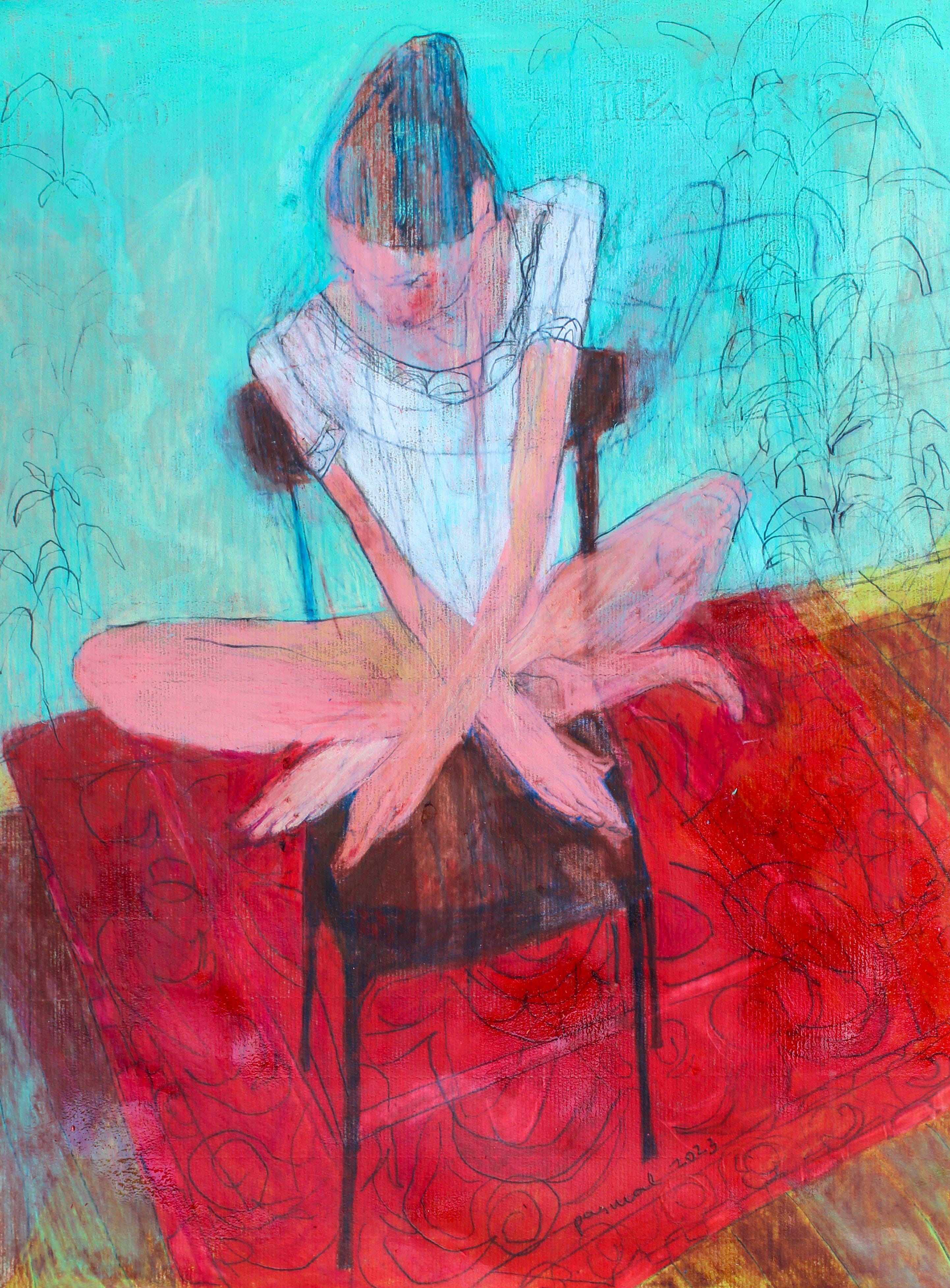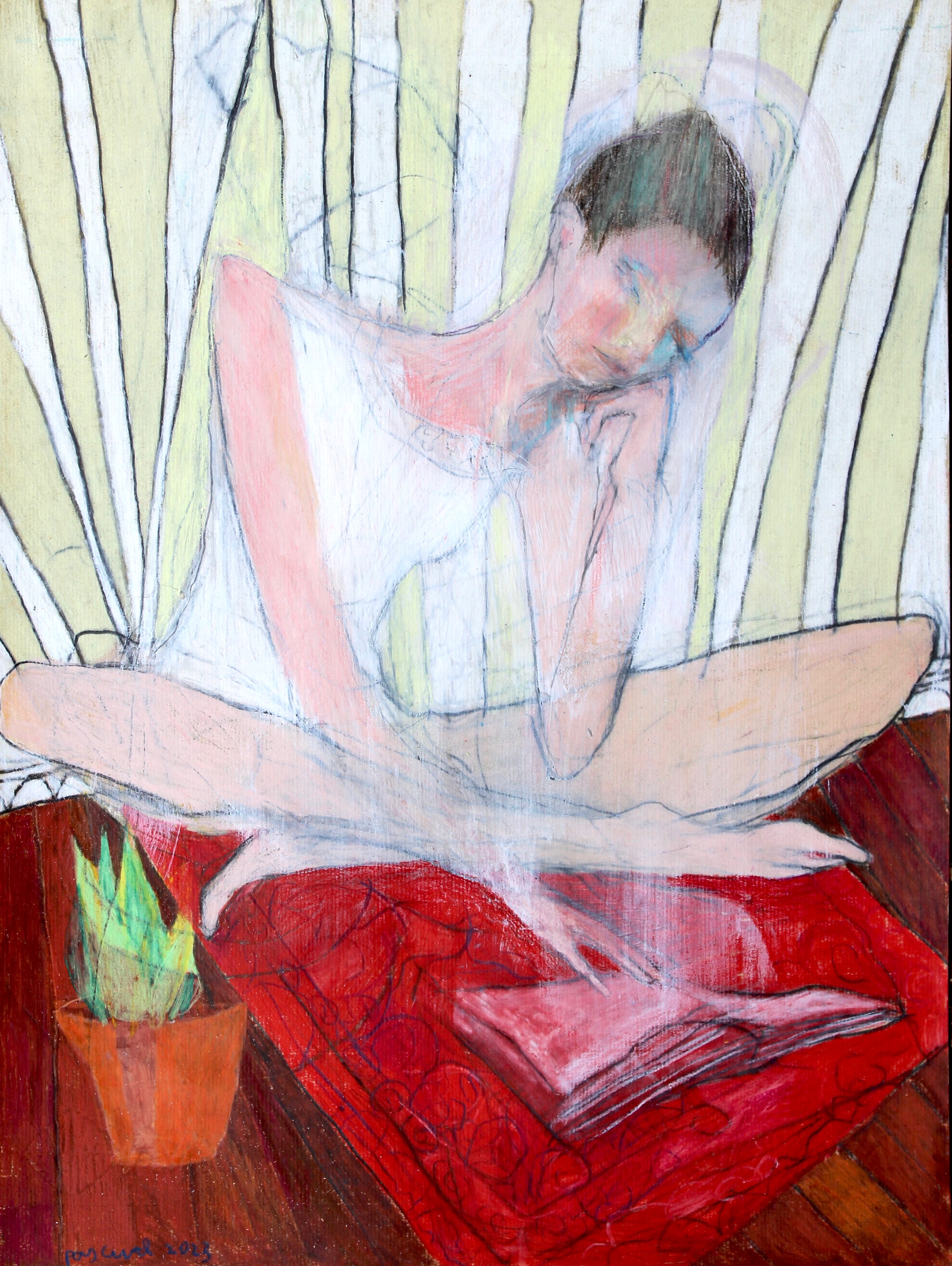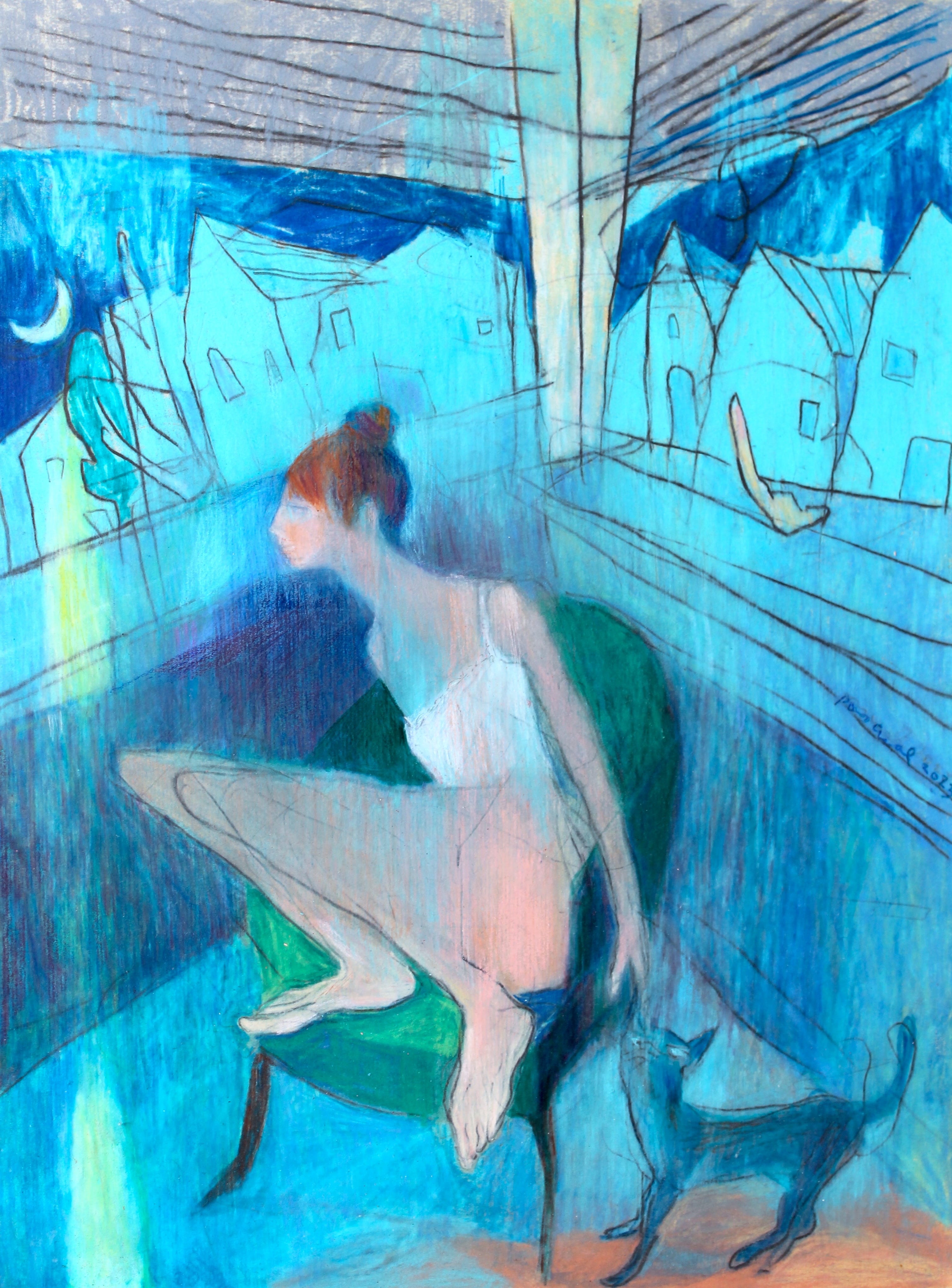 Alex Pascual’s drawings are deeply expressive gestures in figurative language in regards to expressing sorrow and pain. Instead of depicting darkness, he chooses subdued, pale colorful tones to reflect these moody works along with spaces which reflect hallucinogenic, elongated visual interferences. With a sense of poetry and a reflection of everyday life, he chooses to express beauty and psychology in the forms of delicate, beautiful women interacting with enclosed interiors. Through isolating body language and sharp, penetrating perspective, Alex balances out his roughly sketched subjects with a soft color palette reflecting a balance in subtlety and sensitivity to light.