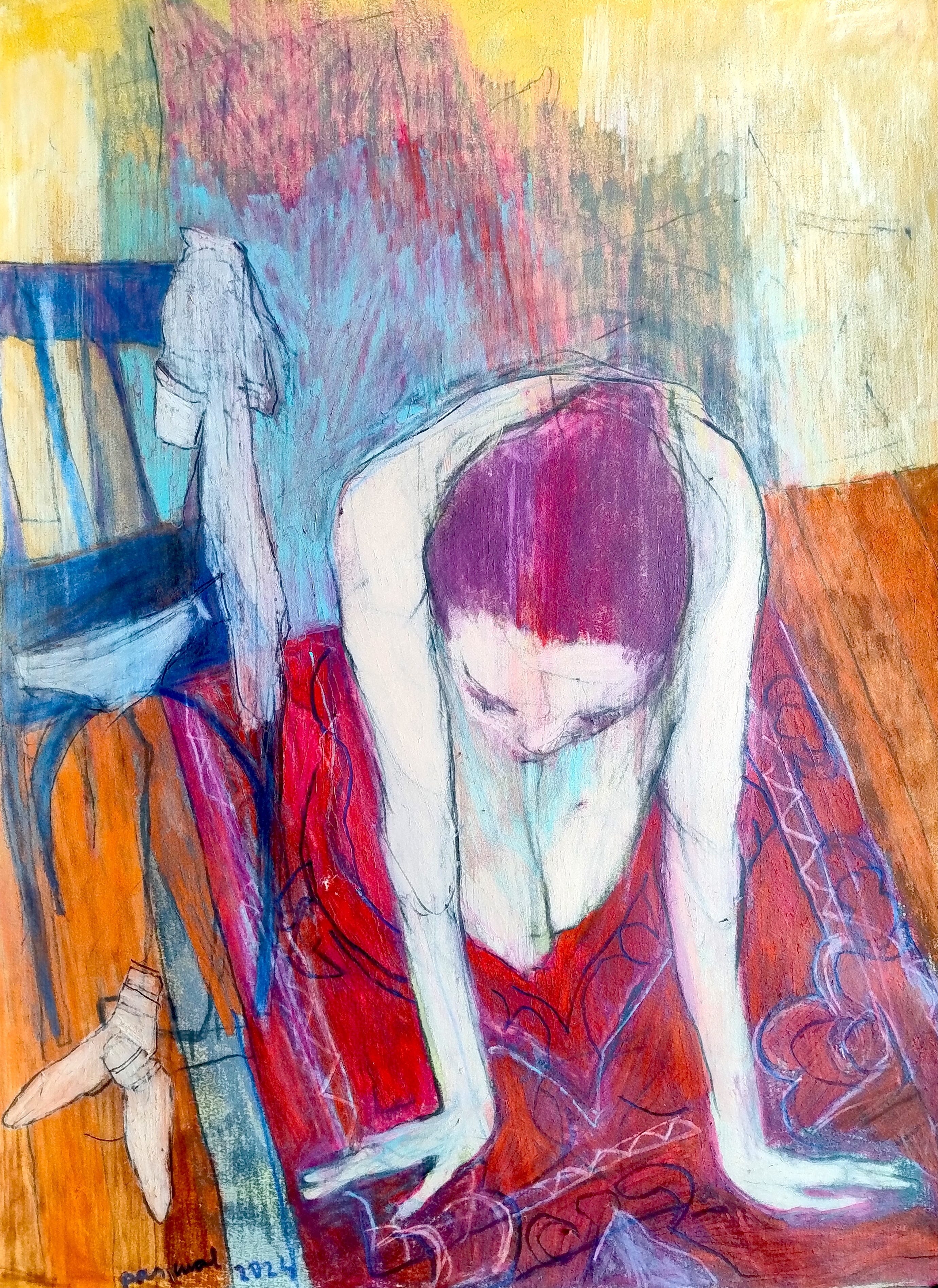 Sleeping on a Striped Blanket (pictured above) remains one of Alex’s most distorted figurative renderings. The woman, with her comfortable home attire, lays on a bed in a stiff position, however due to the angle of the bed she appears as if standing at an angle. Her cool tan, bright red cheeks, and bright red hair indicates she spends much of her time outdoors, whether at the park or the shore. She places her hands towards the stomach as if she were in the early months of pregnancy or expressing a mood of discomfort. The figure rests peacefully despite her hand gestures as the erratic bed follows the angular proclivity of her form.