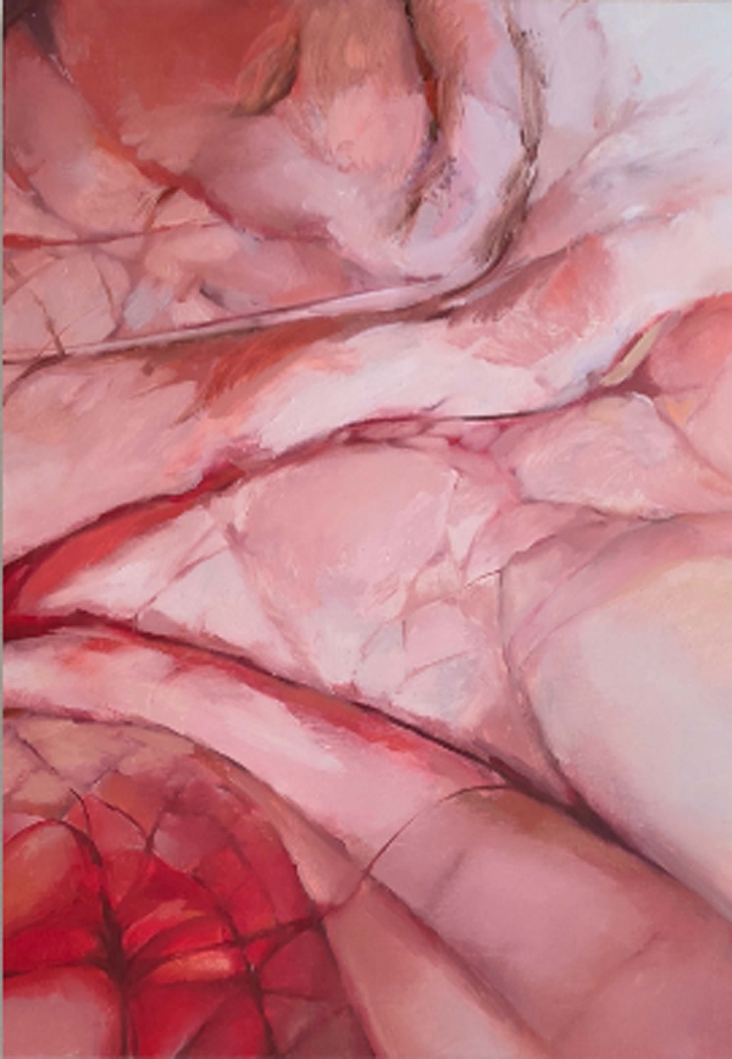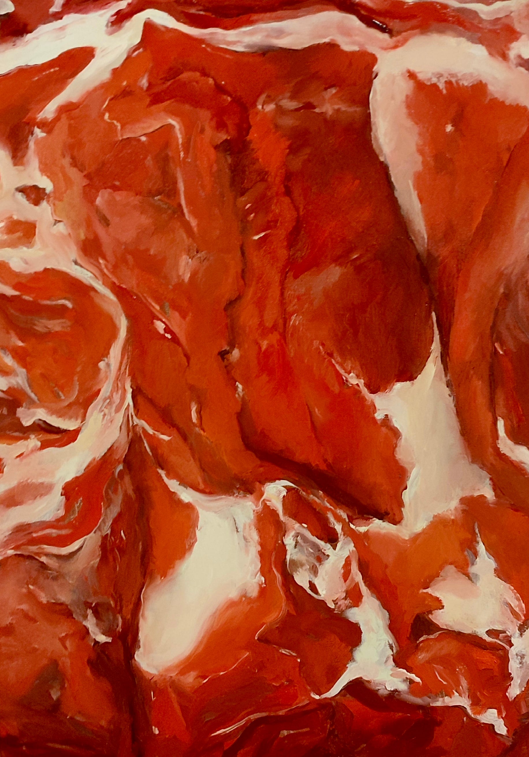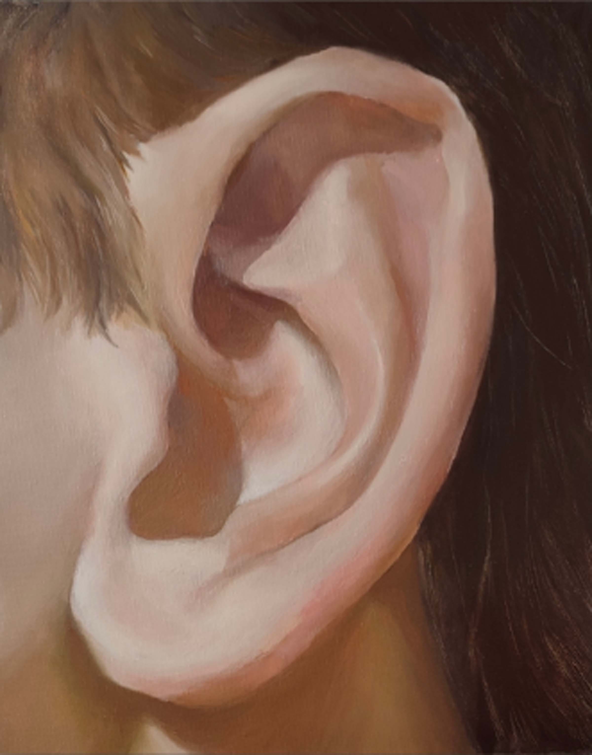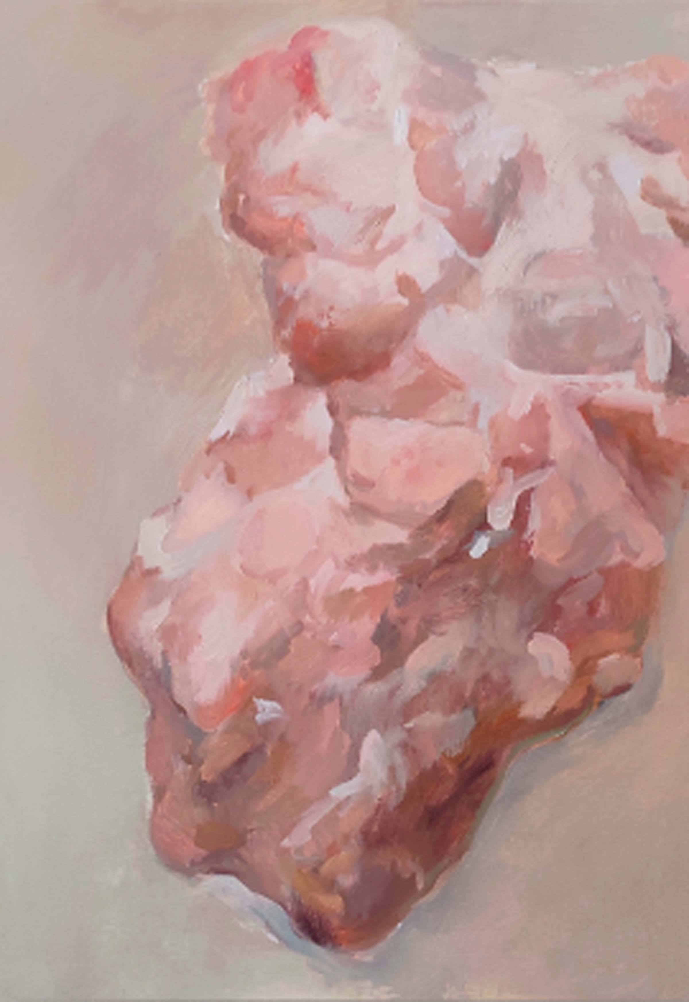 Often containing rich fleshy and painterly brush strokes and color, the paintings reveal an artist who wishes to convey the human condition. Alexa’s self portraits reveal a sense of vulnerability portraying herself with unflattering globs of muddy hues, aging, and an appearance of being worn down. The flesh on the portraits and some of the figurative paintings may resemble rugged and old pieces of leather stitched together. Alexa’s anatomical paintings can come off as grotesque and unsettling as she portrays the interiors of intestines and various organs and unattractive close ups of portions of flesh. Sometimes the viewer may wonder if the paintings are disgusting or aesthetically beautiful in their forms and unified compositional colors. Some of the paintings may come off as more elegant such as her depictions of hands and ears, harkening a focus to our senses. Alexa remains a complex painter and three-dimensional character who communicates variations in interpretations of human form.