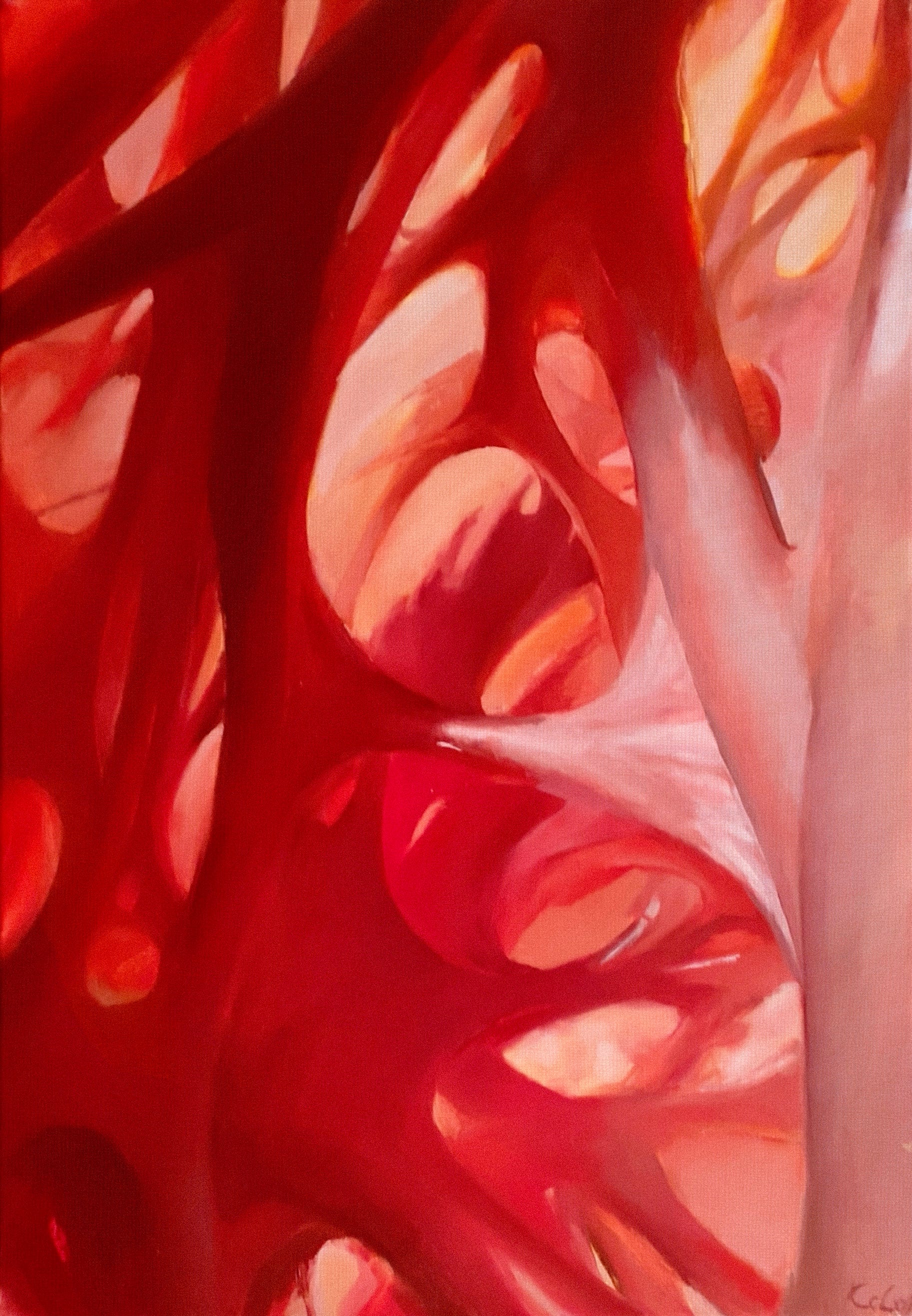 Alexa Kolos’ anatomical pieces convey grotesque qualities and discomfort while at the same time laid out in designs which are compositionally pleasing to the eye with monochromatic undertakings. The push and pull of various organs reminds us our lives are governed by our internal self as well. An unflattering sense of oneself would be to break our own identity into chunks of anatomy, bone, and pieces of flesh. Perhaps a commentary on the cheapness of life considering all the bloody conflicts going on in the contemporary world. A deeply sociological and psychological artist, Alexa Kolos brings us on our journey beyond the comprehension of our direct senses and what remains only known to the mind and studies in science. As a young artist with a bold and unforgiving body of work, her artistic career appears promising and has huge potential for dynamic growth.