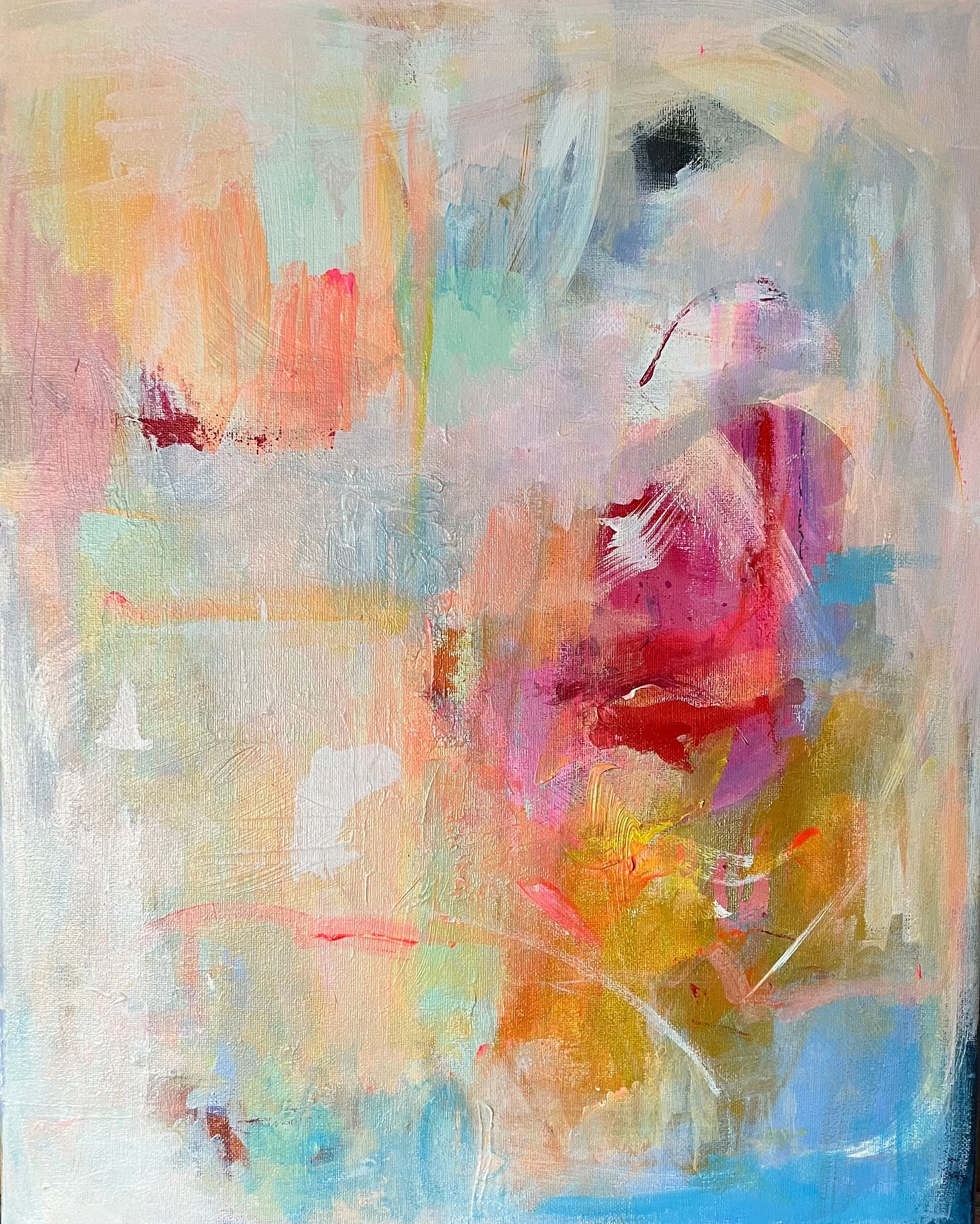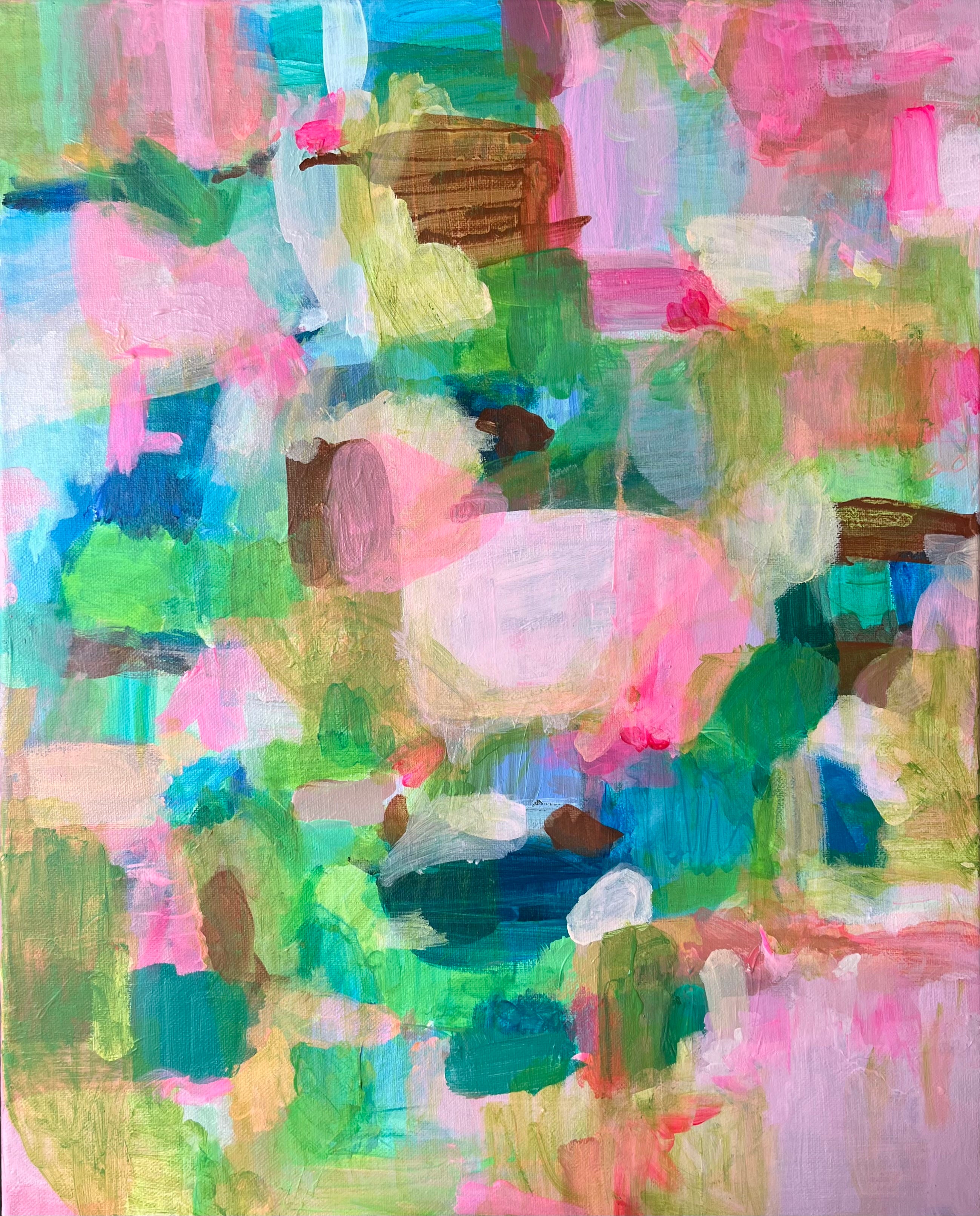 The more colorful paintings reflect a sense of joy and gracefulness with deep pastels such as various forms of peach and neon tones, specifically of hot pink. Coming off as a cross between pop art and contemporary abstraction, these compositions bloom towards holistic approaches to reflecting a varied yet unified surface. Seemingly improvised, the brushstrokes are sporadically spread out asymmetrically and geometrically simultaneously.