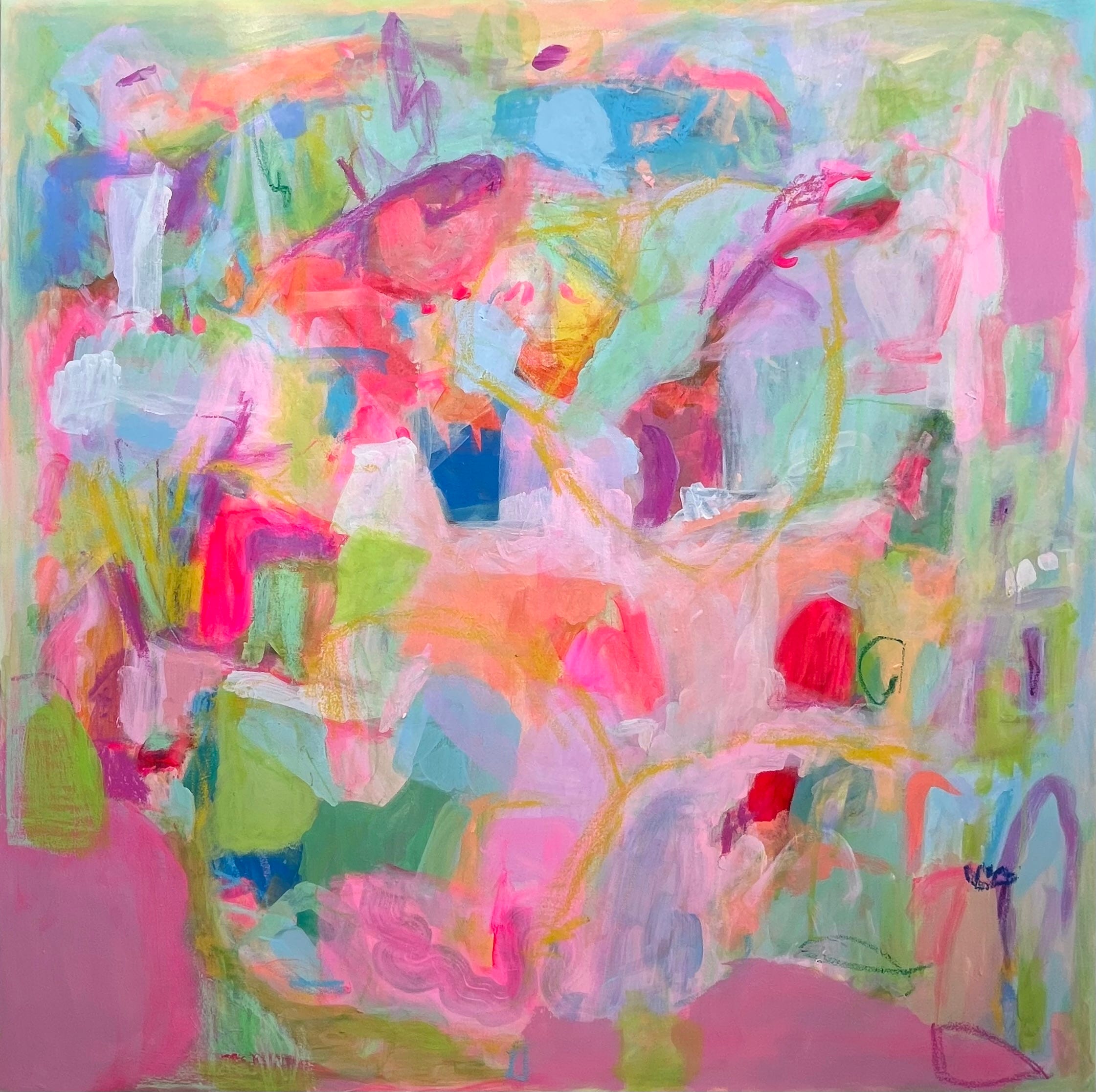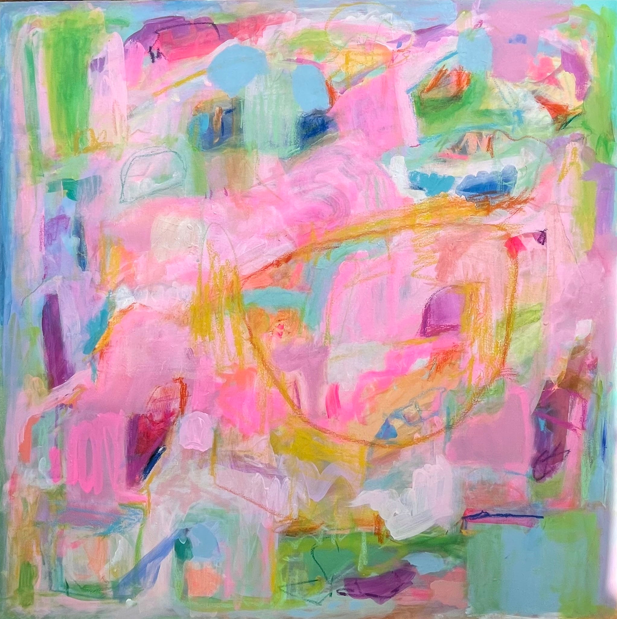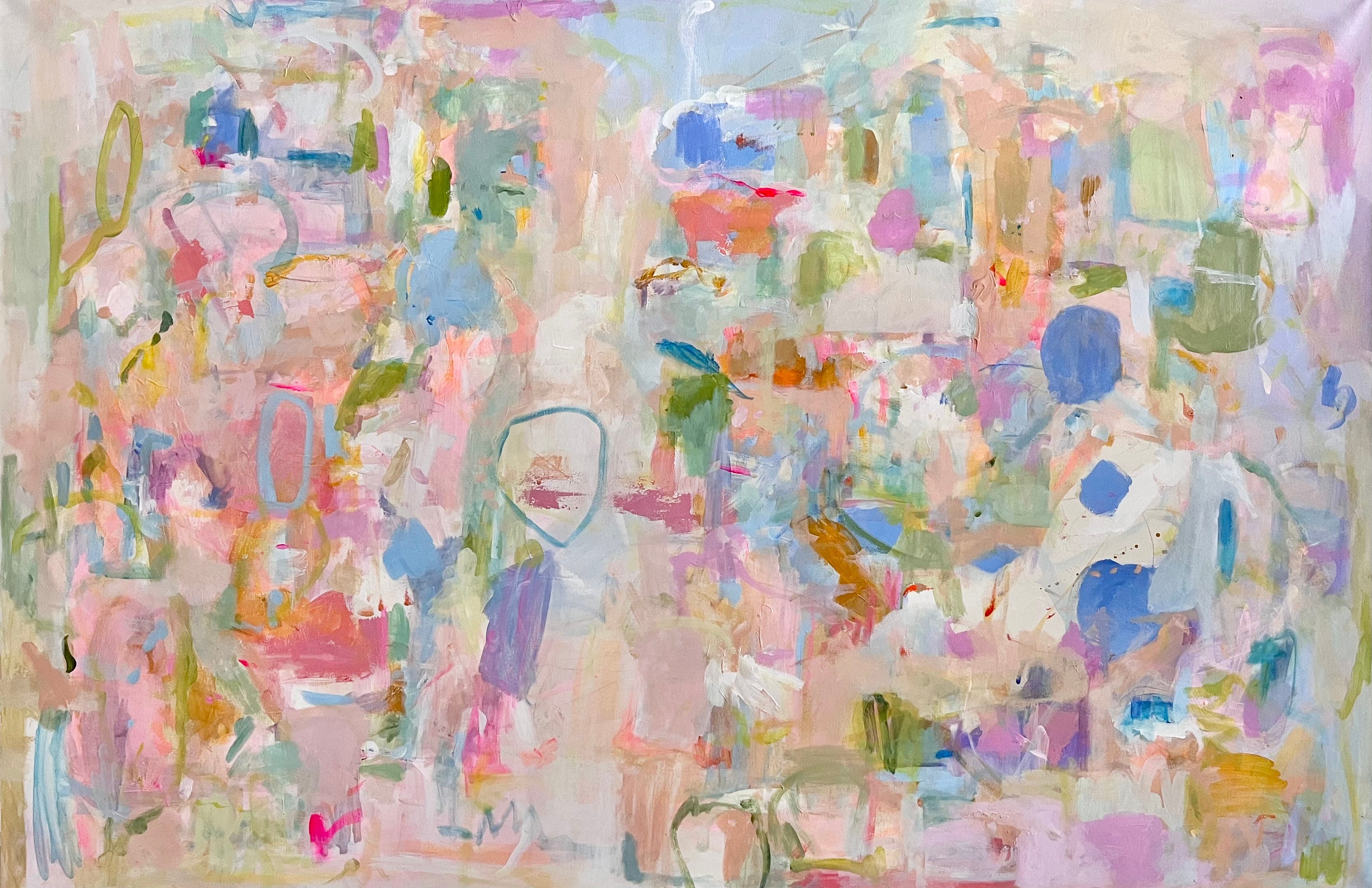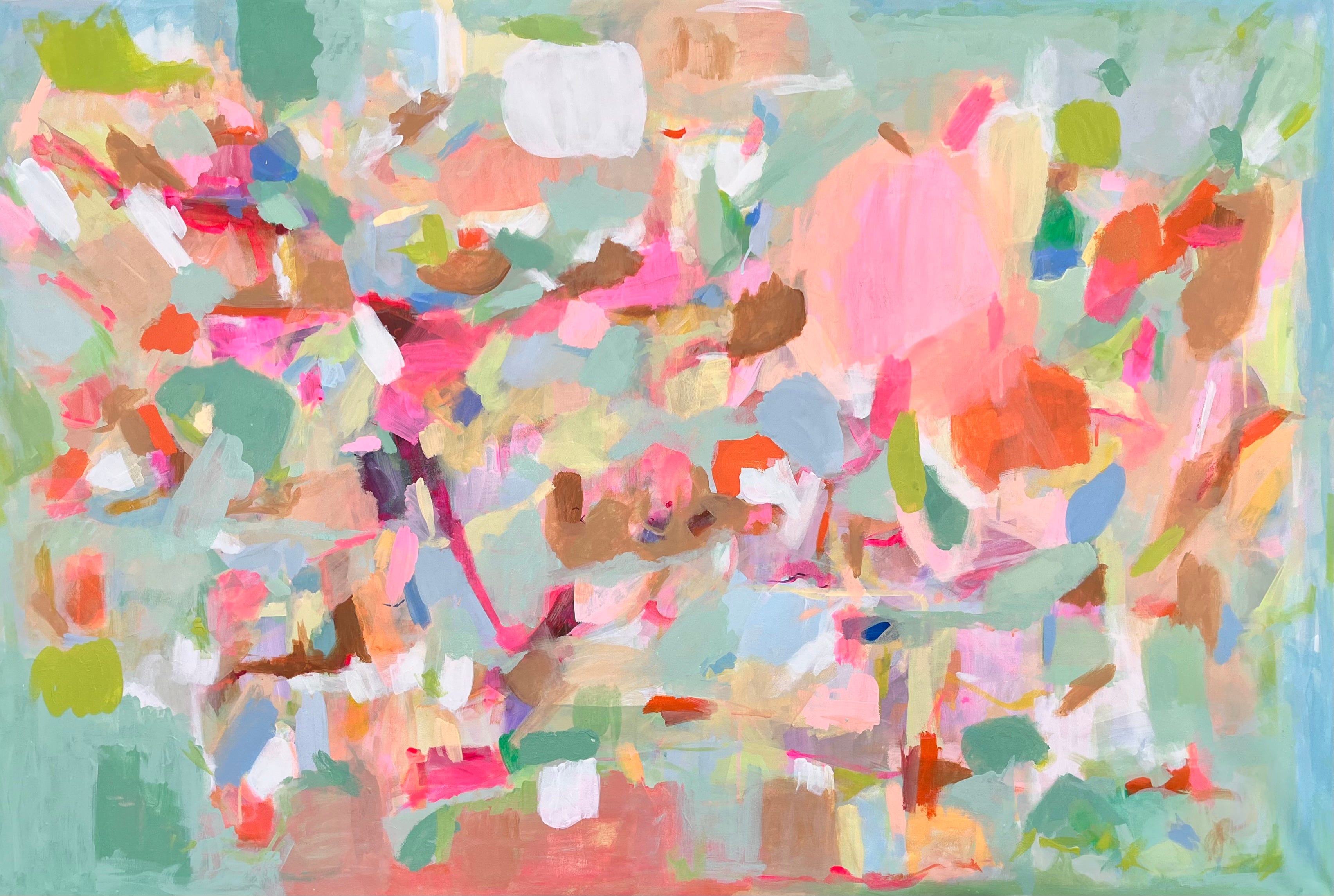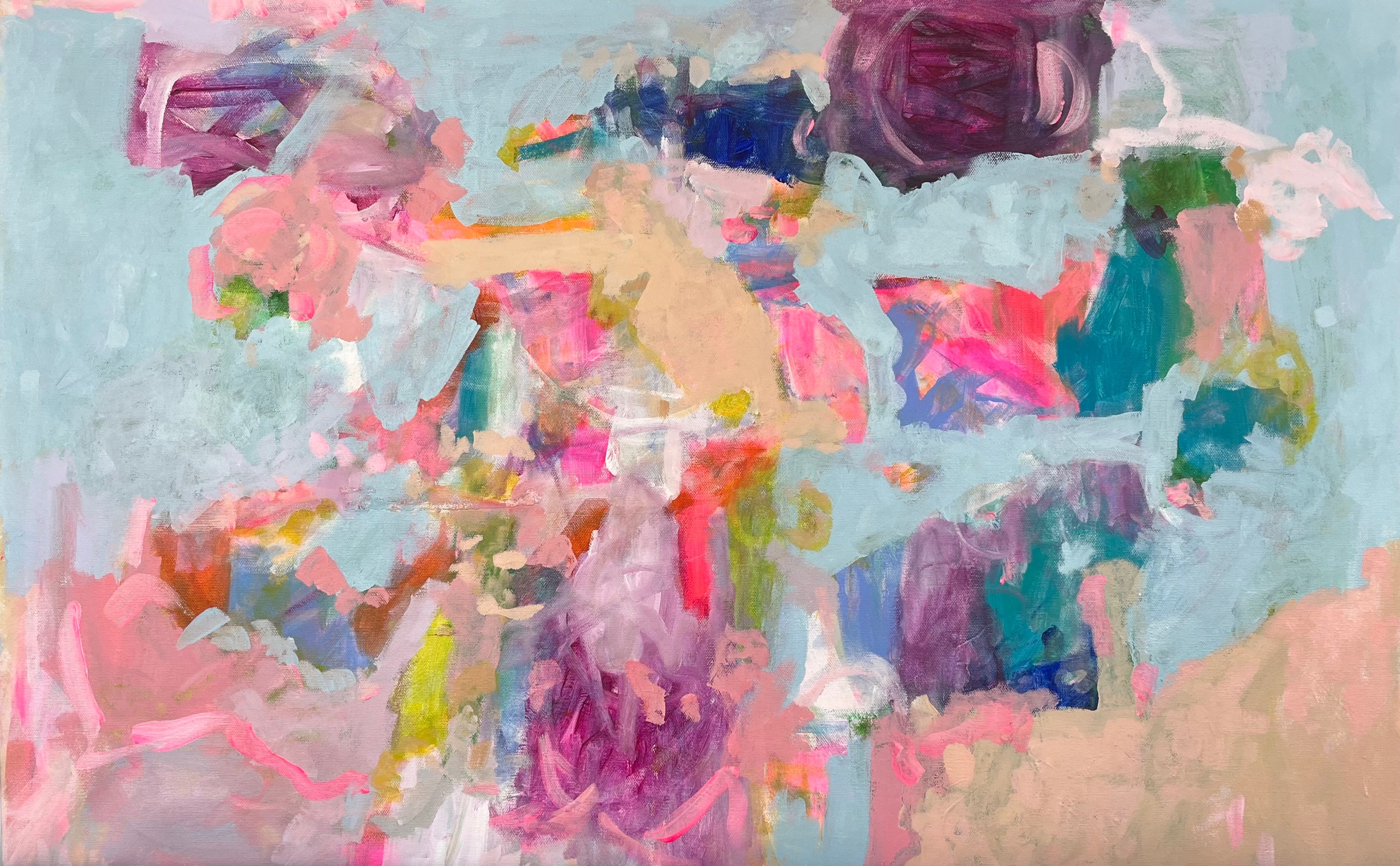 Everything In Its Right Place (pictured above) remains one of Allie’s most structured pieces. With a lucid and quiet pale blue background, an orchestra plays across the planes of latitude, placing peaches, purples, and hot pinks in strategic locations across the canvas. The work contains a summation of a majority of the paintings which contemplate brilliant and bold brushwork sliding the paint into slabs of movement.
