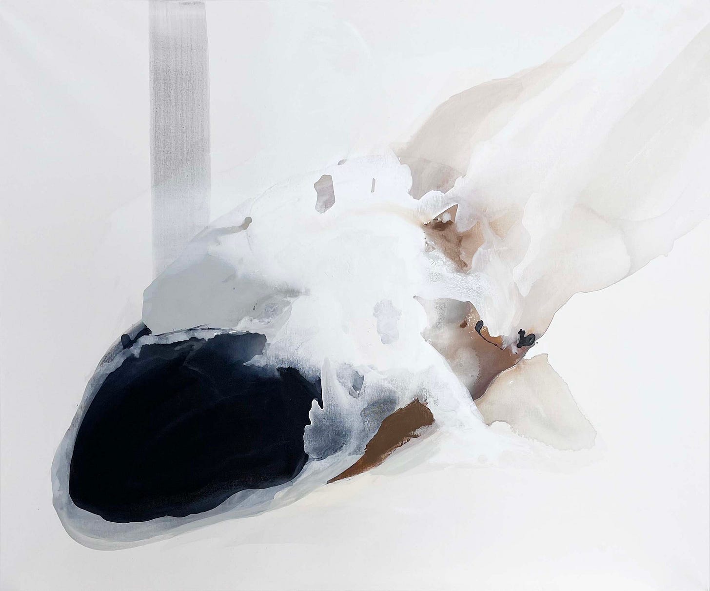 Contemplation (top of article) comes off as almost figurative despite being intended as an abstraction. The painting may seem as a depiction of an orca whale with black and white markings, fin, and slithering wet body. Although a number of interpretations may be reached, the painting reflects like Rorschach art used for projective psychological tests. An ambiguity yet familiarity permeates throughout the organic-like form centered on the canvas and anchored to the left with a vertical rectangle. Contemplation remains Allie’s most unusual painting in her entire body of work, no other painting reflects such a vast quantity of neutrality in determination of the subject or lack thereof.