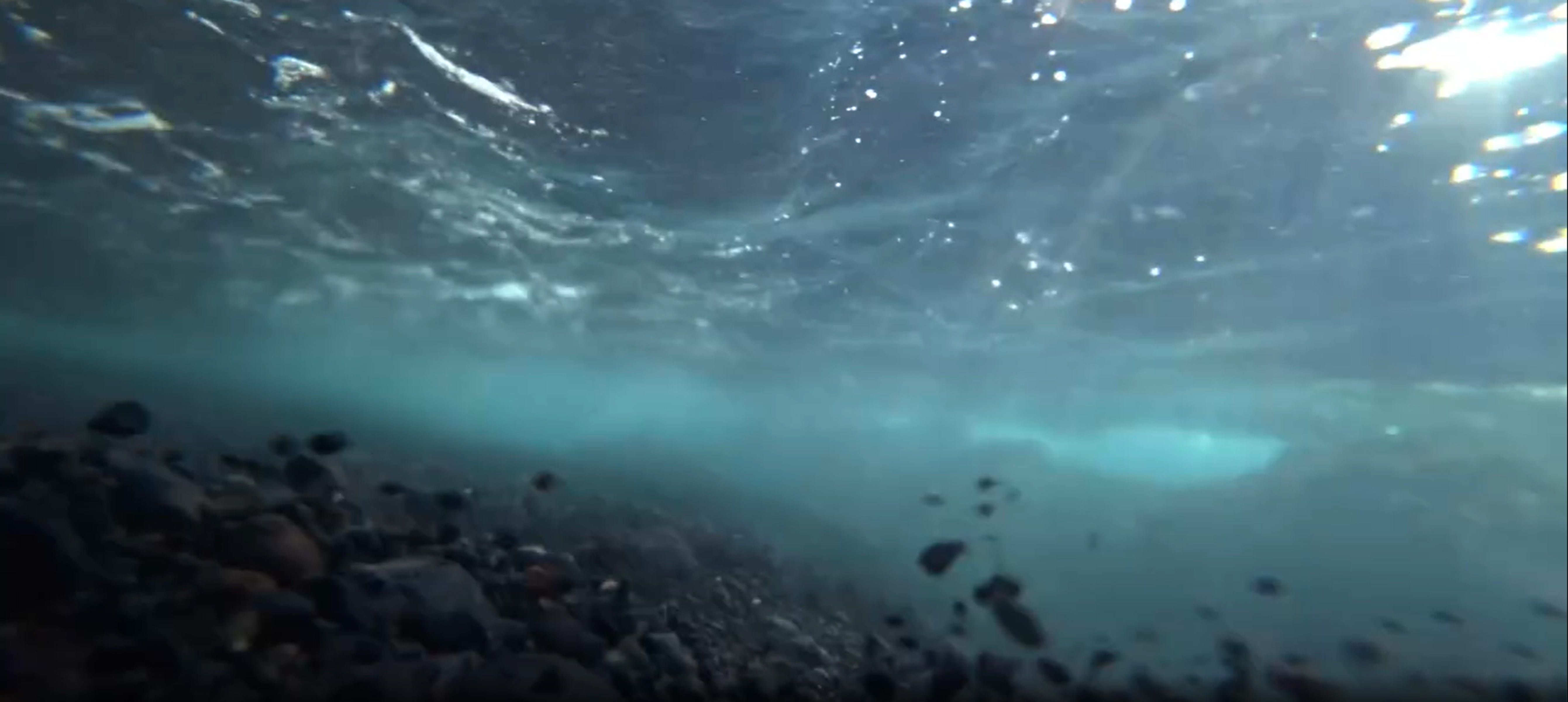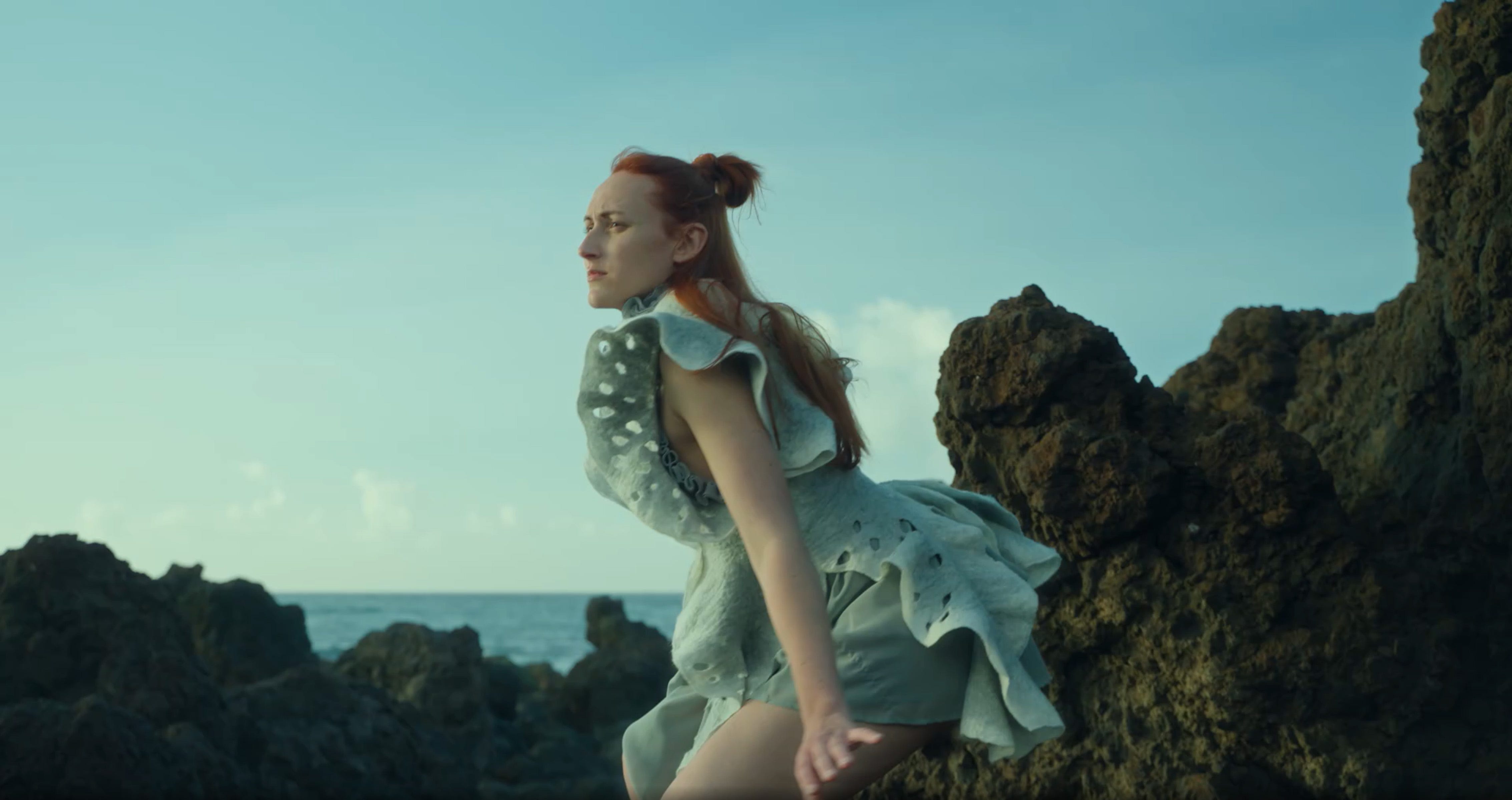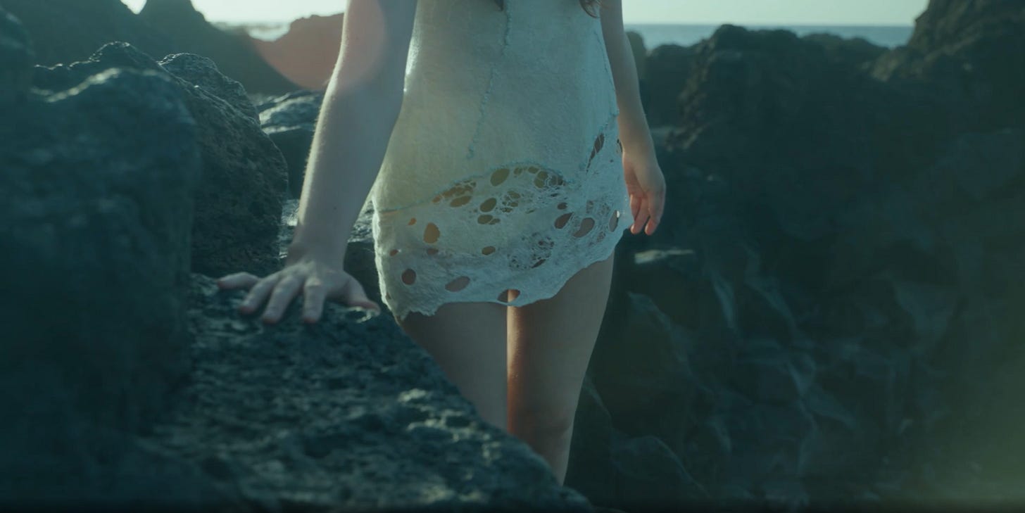 Listening to the Ocean (pictured above) remains Anastasiia’s most playful work. The short arthouse film revolves around the investigation of the open shore through frolicking with the sand, engaging with rock and stones, and even wondering about the purpose of the actor’s own isolation, as if she expects to be interfered with. The film starts with a dashing of shallow submerged water being rushed against the ocean waves and leads to the actor walking across the sand, listening for other people or creatures, and then finding ‘toys’ within the rocks and splashing of the water. We could describe the film as an interpretation on the theme of isolation and the purpose of solitude and entrapment in an ideal environment. In addition, the woman performs in a costume dress which resembles the form of sea algae, perhaps symbolizing her as a spirit, guardian, or goddess of the ocean.