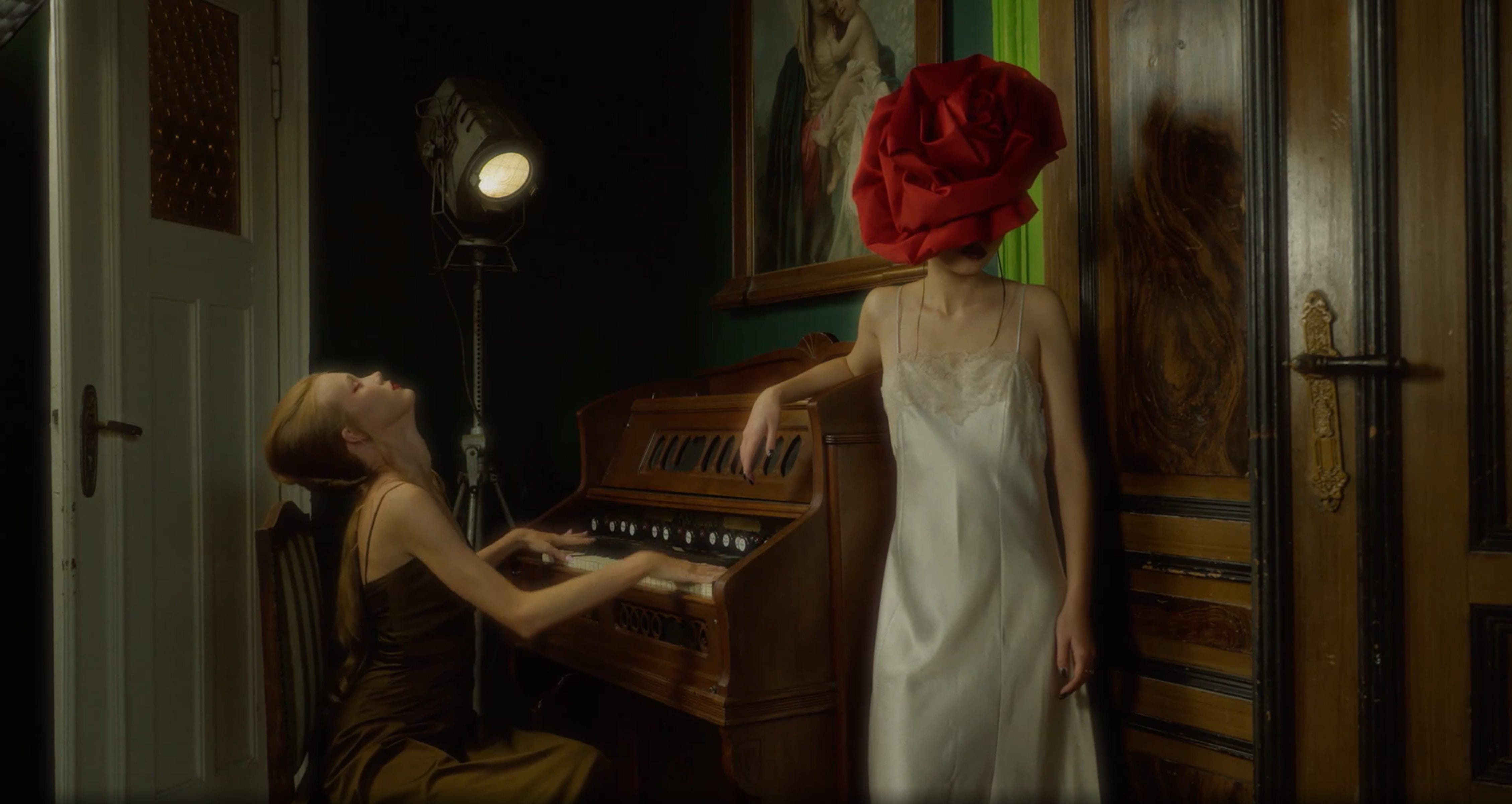 The arthouse films and photography of Anastasiia Marinich rely on minimal and subtle interactions with environments and other actors. Her films contain original handmade props and costumes created by Anastasiia herself or by costume designers. In the films, she has a small crew which assists with hair styling, costumes, and sometimes editing, while the conceptual approach and direction relies on Anastasiia herself. Her works can be regarded as performance art because they are based on conceptual notions rather than concrete narratives. In the film Listening to the Ocean, there contains a performance based on subtly investigating the value of the ocean shore through interactions with rocks, waves, and sand. While a film such as Unwritten Things engages on relationships of women with silent dialogue, haunting music, and body language, as the viewer becomes left to interpret the meaning behind women curled up symmetrically across each other on a sofa in lingerie with flower masks or passionately playing the piano in an ominous interior with a flower-headed spectator.