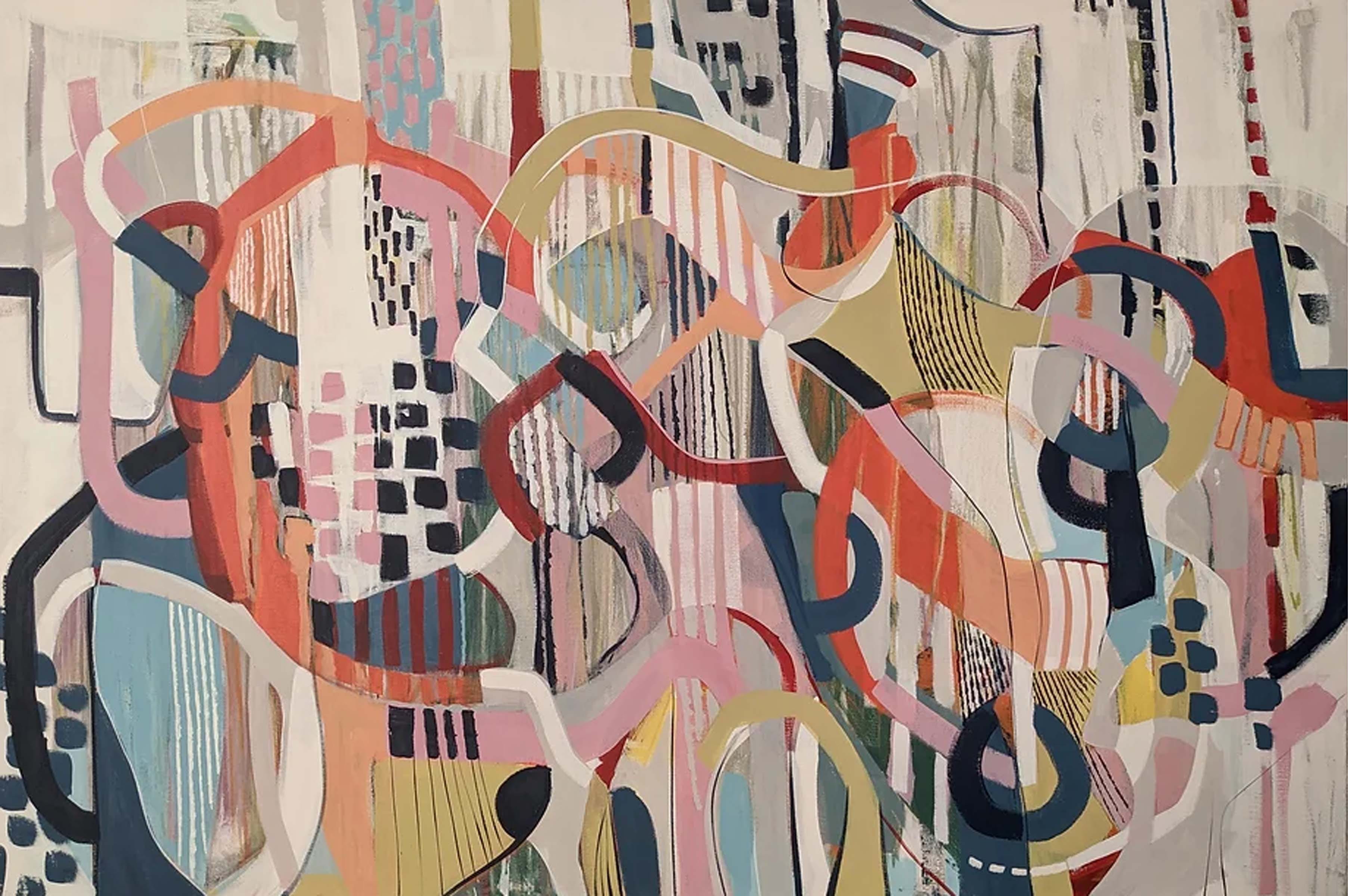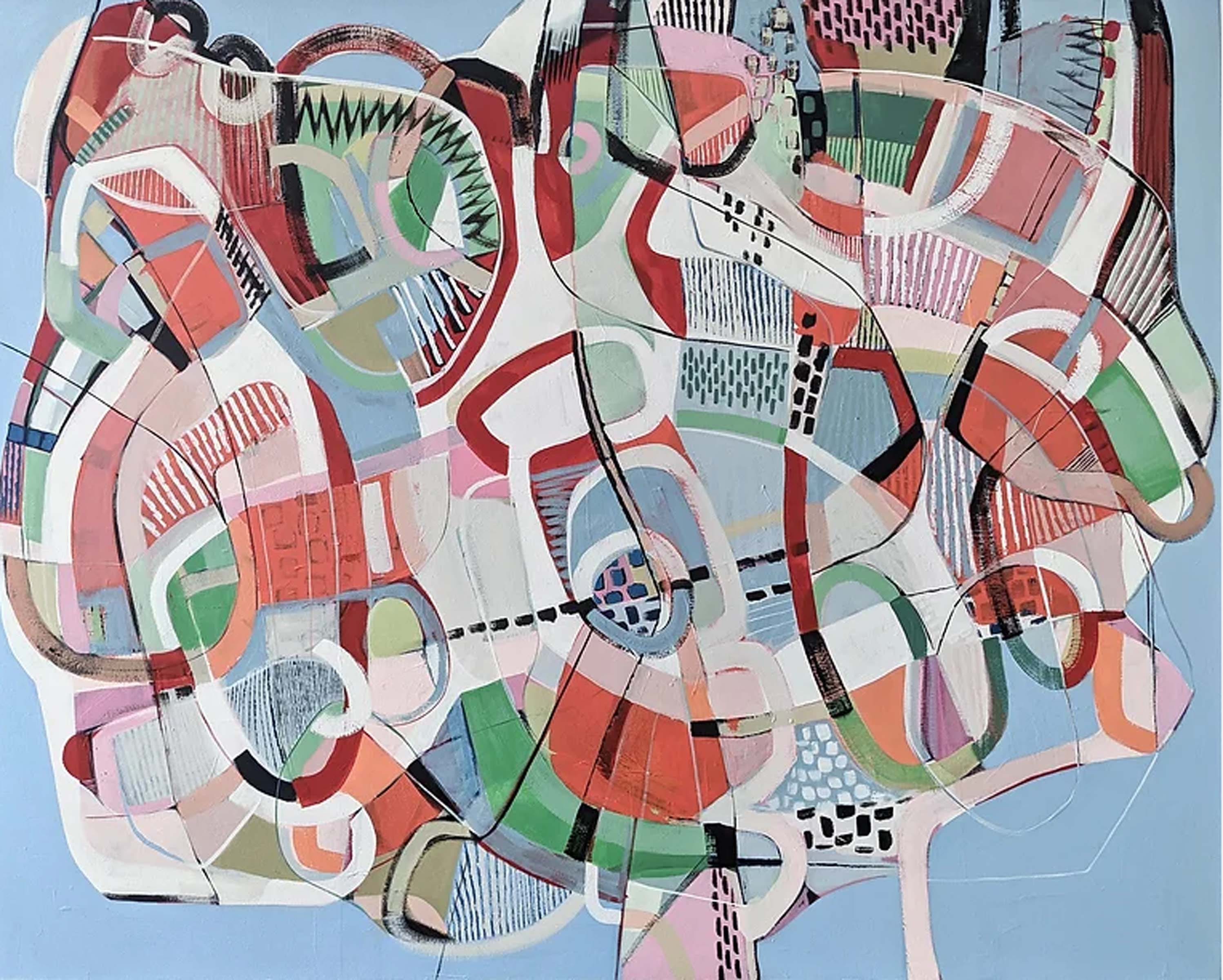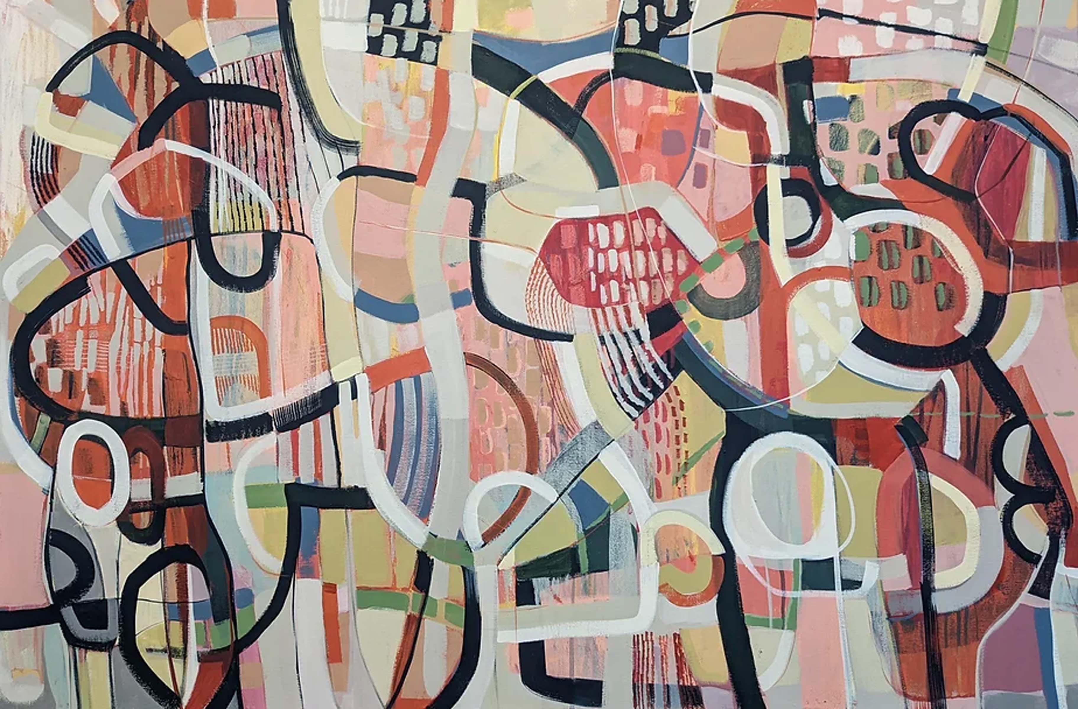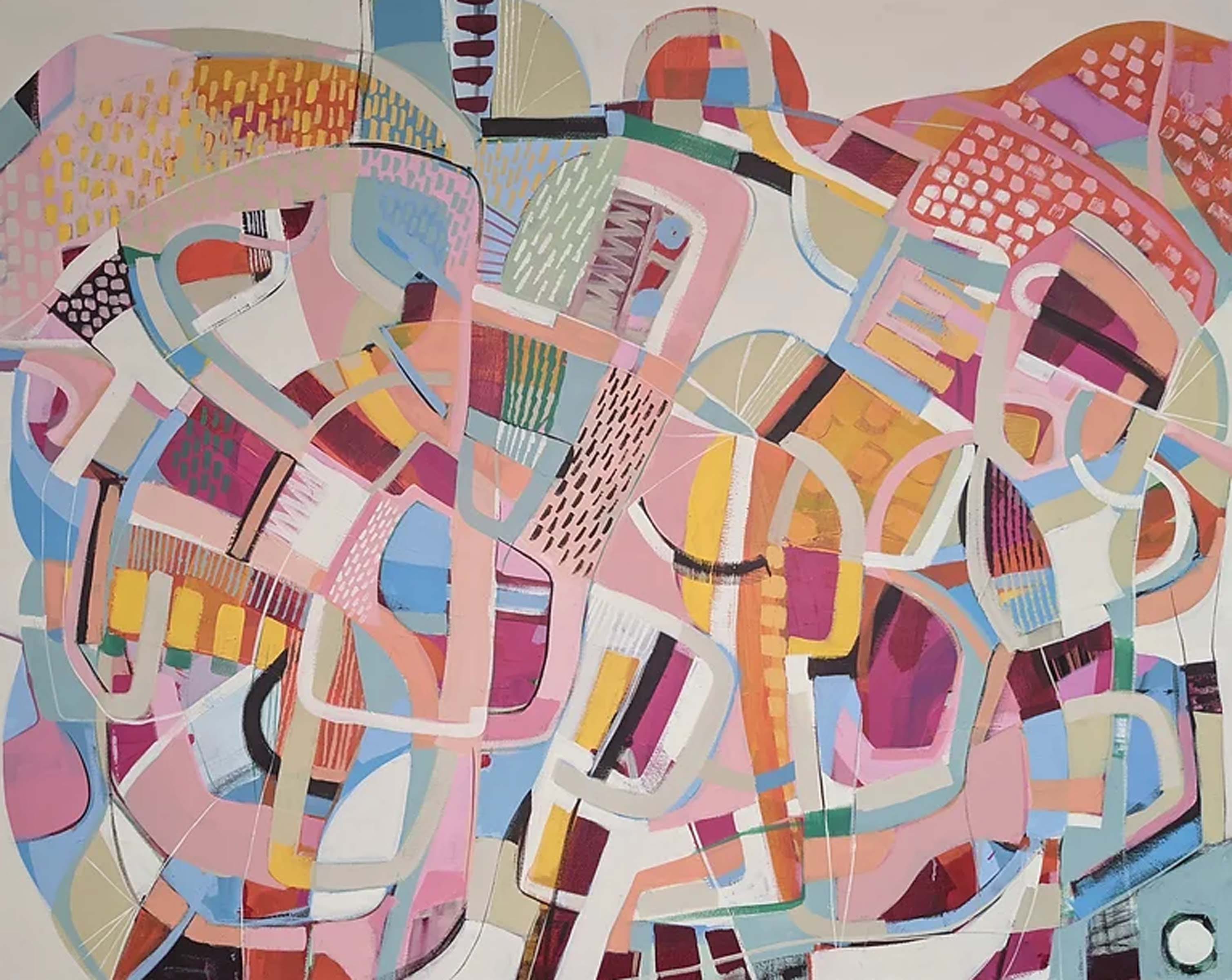 Boldly contrasting abstractions push and pull the viewer between rhythmic order and emotional chaos. Ribbon-like passageways weave through curvilinear shapes in her large-scale canvases, suggesting meandering trails on country maps. Circular motifs sooth frequent directional shifts in her linear markings, and occasionally small painterly moments escape the overarching sweep of her larger strokes. Describing herself as a colorist, Angela’s palette maintains a keen equilibrium between warm and cool hues. Pink and blue geometric designs unflinchingly merge with organic, achromatic figurations. Reminiscent of textiles as well as botanical elements, Angela’s designs do not repeat as much as they echo altered versions of themselves within a single arrangement. Interstices of empty white space provide visual rest in her paintings, and sometimes suggest a more traditional figure-ground relationship through the buildup of larger configurations within compositions.