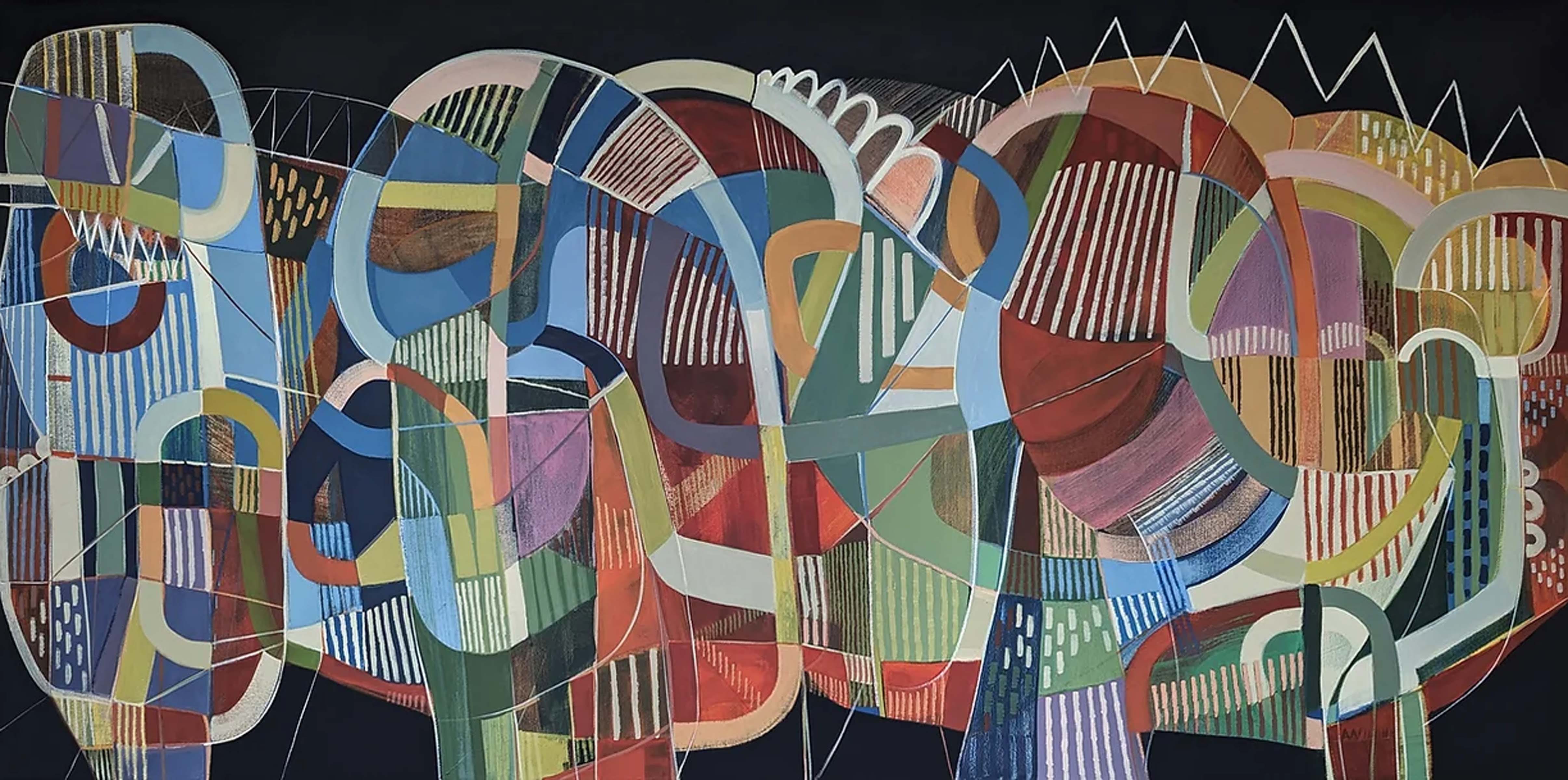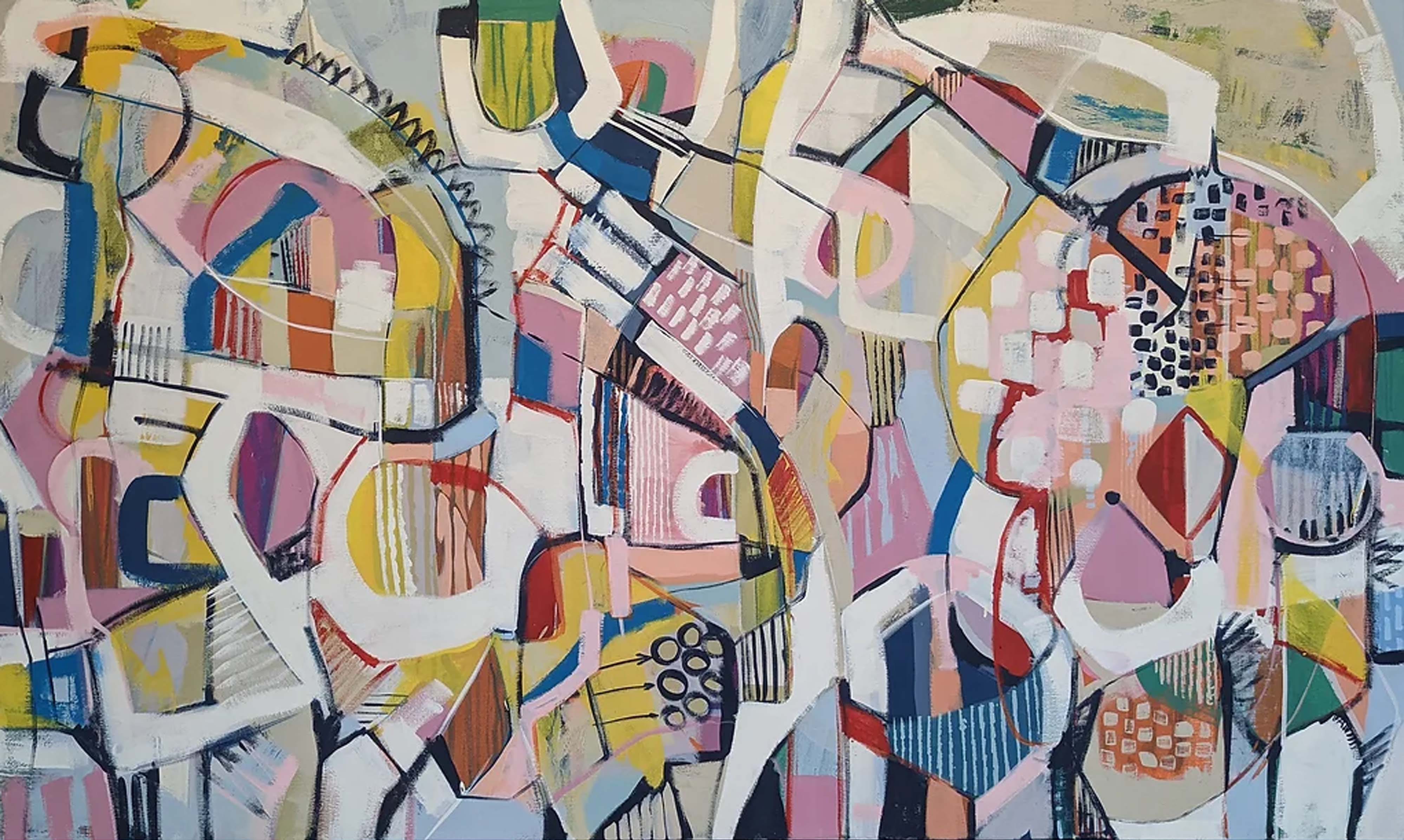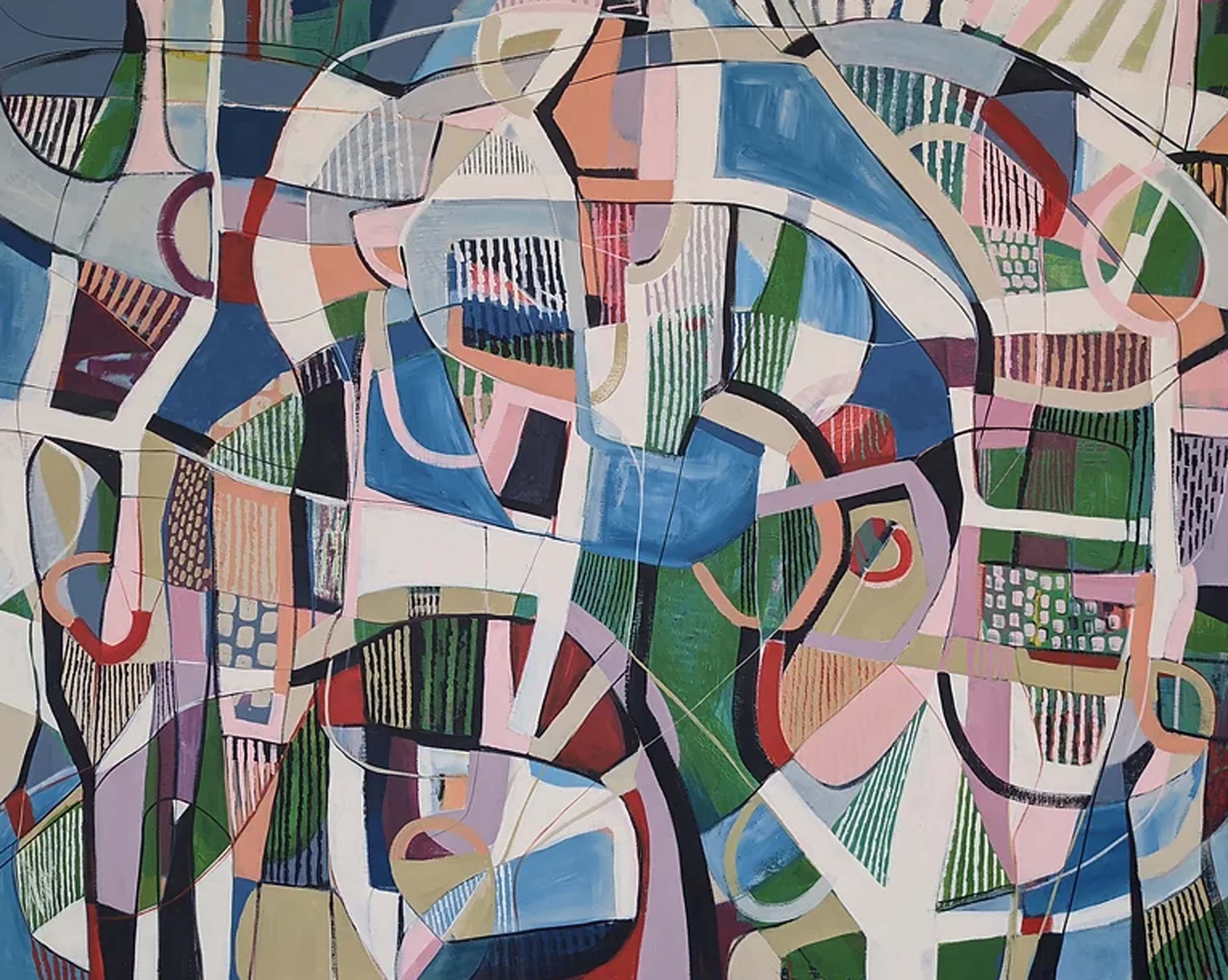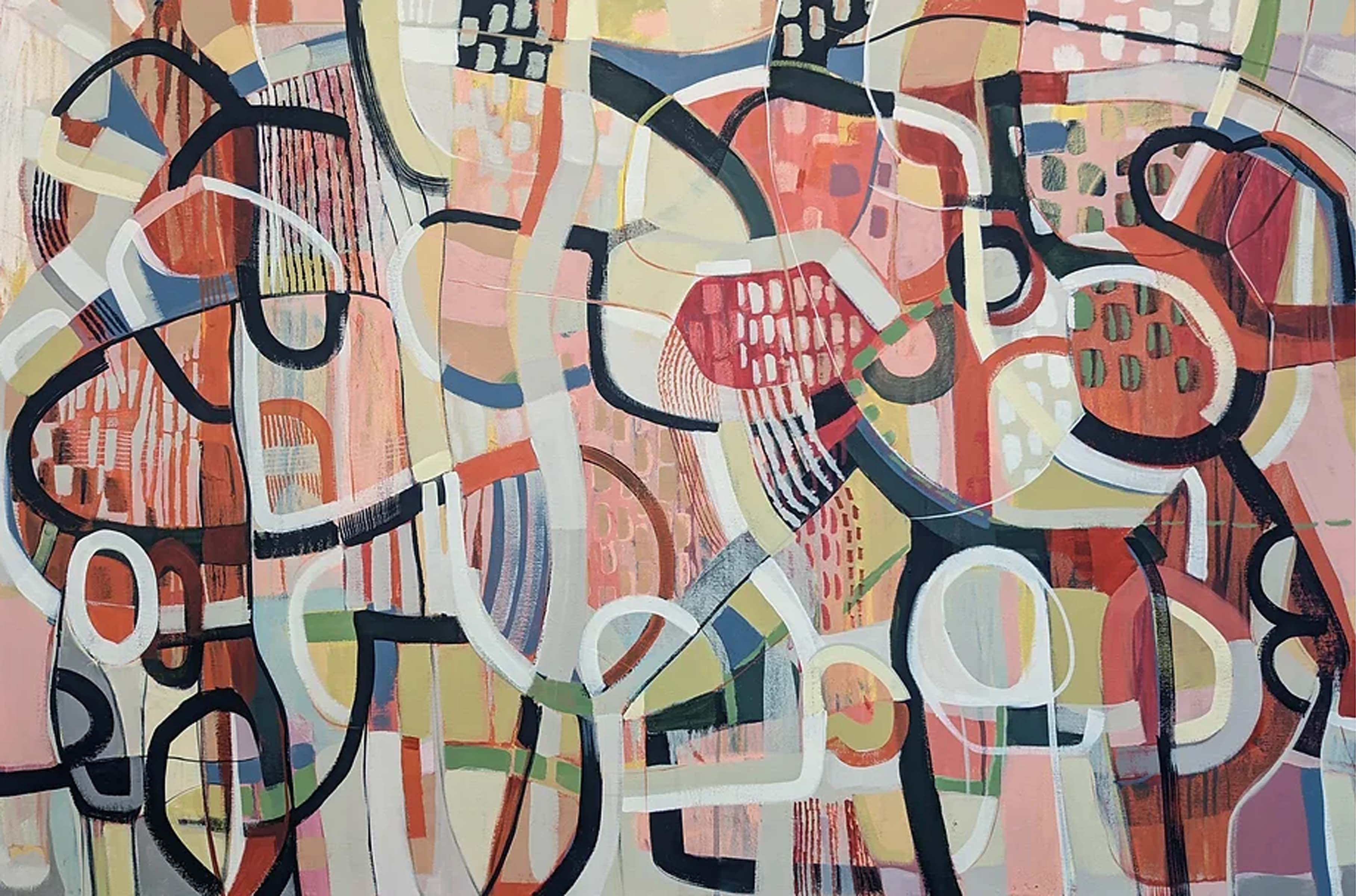 Boldly contrasting abstractions push and pull the viewer between rhythmic order and emotional chaos. Ribbon-like passageways weave through curvilinear shapes in her large-scale canvases, suggesting meandering trails on country maps. Circular motifs sooth frequent directional shifts in her linear markings, and occasionally small painterly moments escape the overarching sweep of her larger strokes. Describing herself as a colorist, Angela’s palette maintains a keen equilibrium between warm and cool hues. Pink and blue geometric designs unflinchingly merge with organic, achromatic figurations. Reminiscent of textiles as well as botanical elements, Angela’s designs do not repeat as much as they echo altered versions of themselves within a single arrangement. Interstices of empty white space provide visual rest in her paintings, and sometimes suggest a more traditional figure-ground relationship through the buildup of larger configurations within compositions.