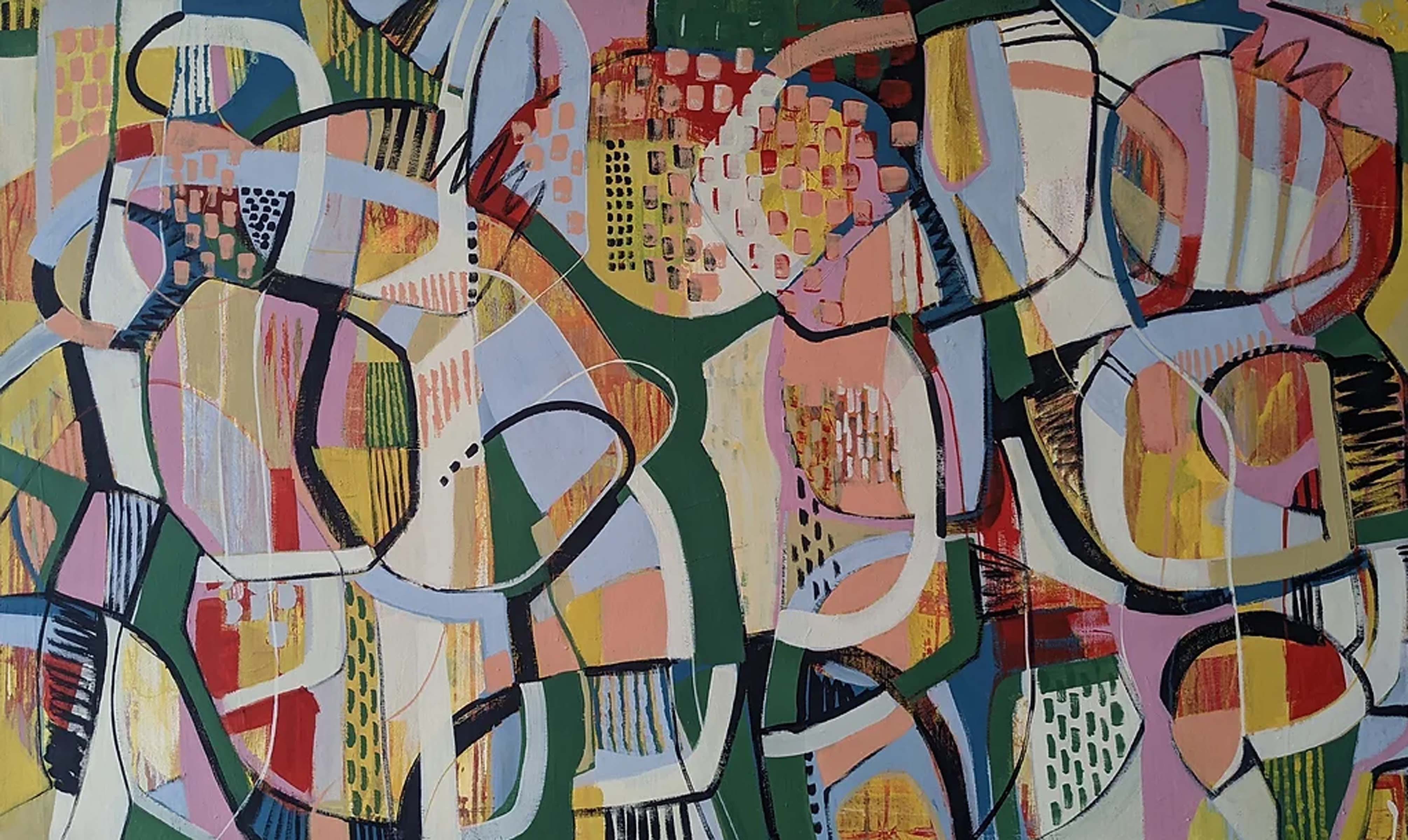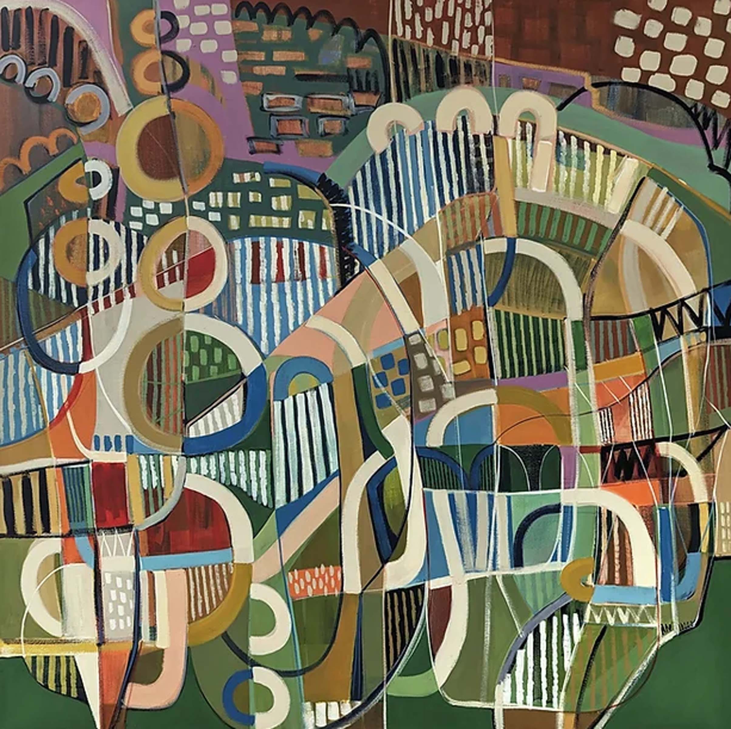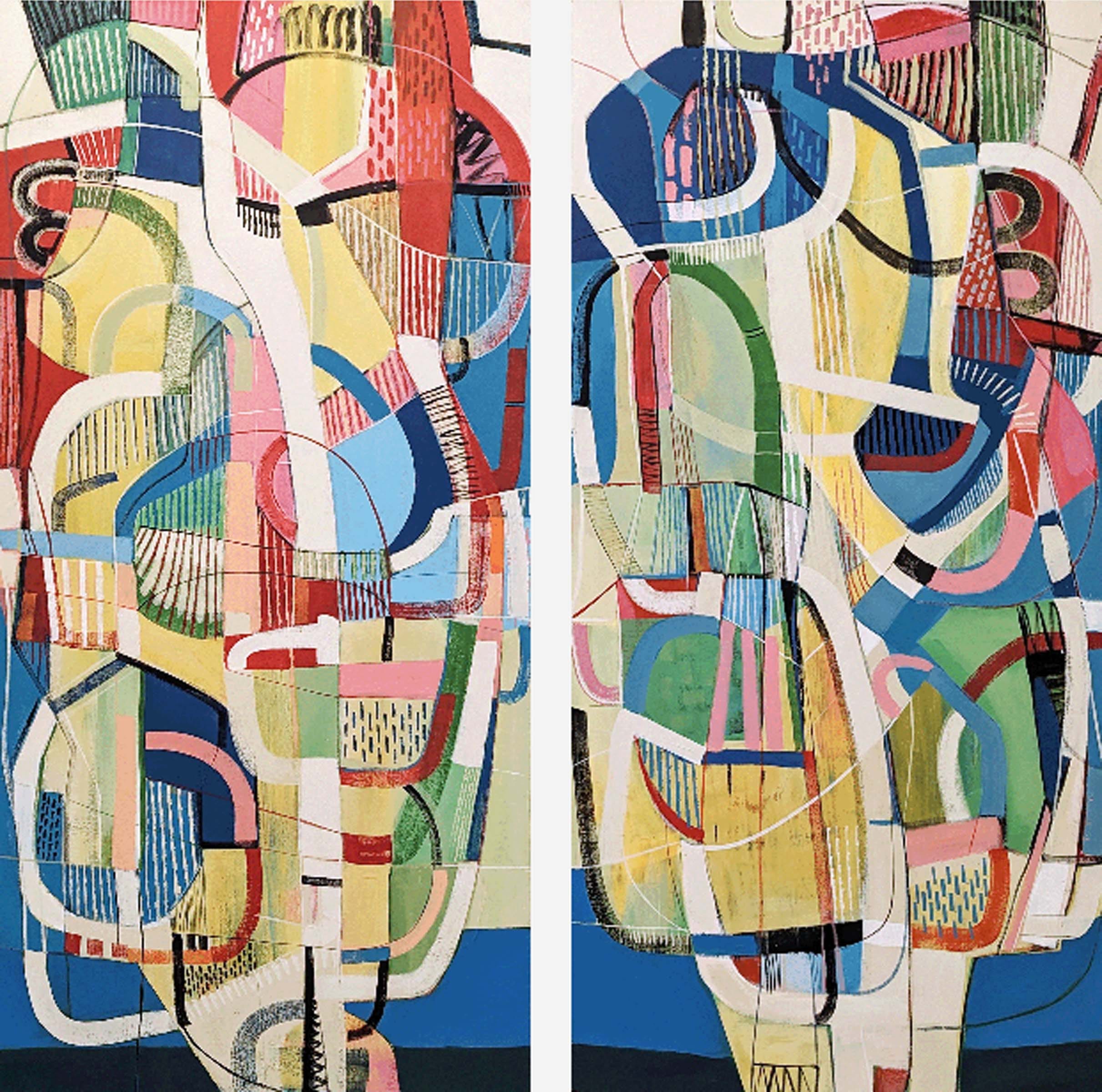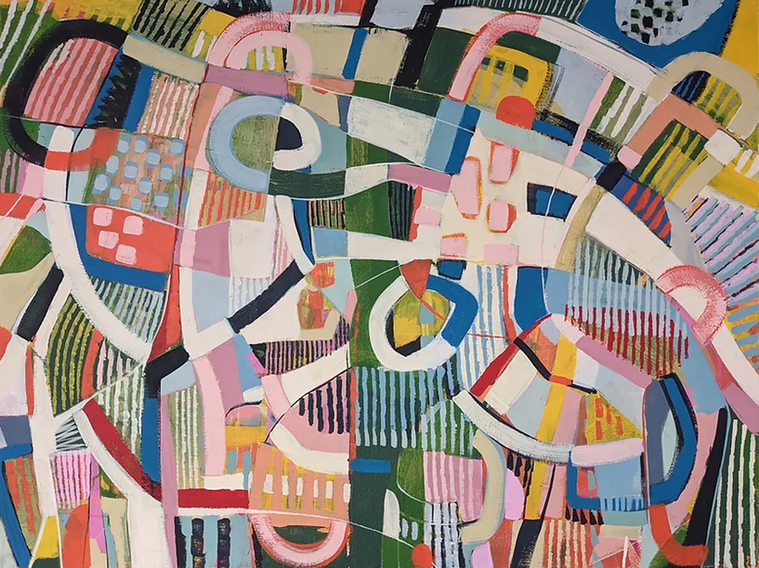 Angela Navarro’s paintings may conjure mental maps and physical pathways. An intrepid, haptic process becomes revealed through the robust physicality of her paint. Clearly, expressions of joy are present in her exuberant works. However, Angela also leaves us with traces of paths not taken in the final visual field. Tubular conduits are crossed over, and lines loop back onto themselves. As in life, courses which once seemed certain are inexorably corrected. Rather than exposing wavering faith in her designs, her edits expose intuitive and conflicting choices left bare. The honesty of her artistic method remains laid out in totality for us, allowing viewers to experience her paintings on the same pure, exploratory level from which they were made.