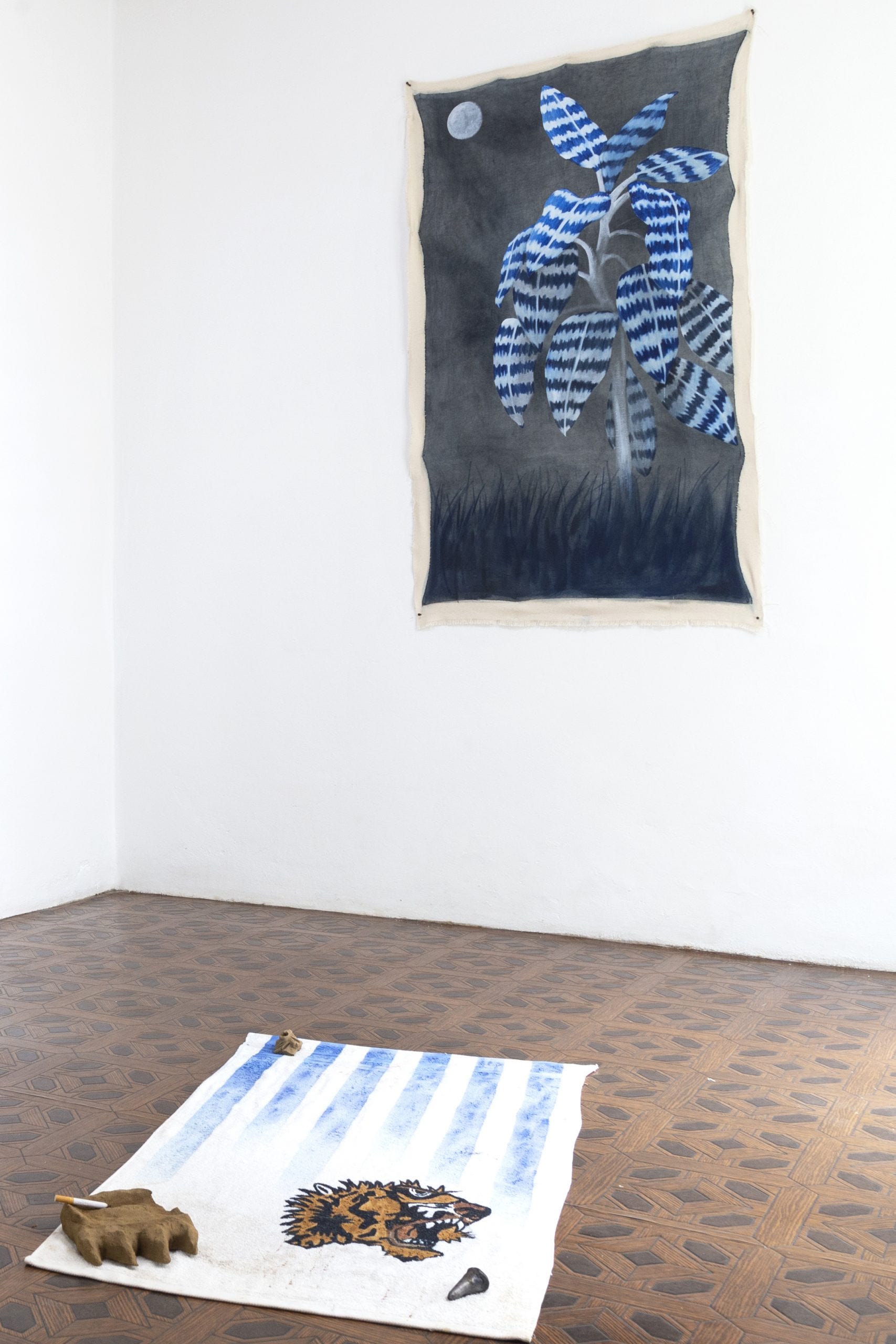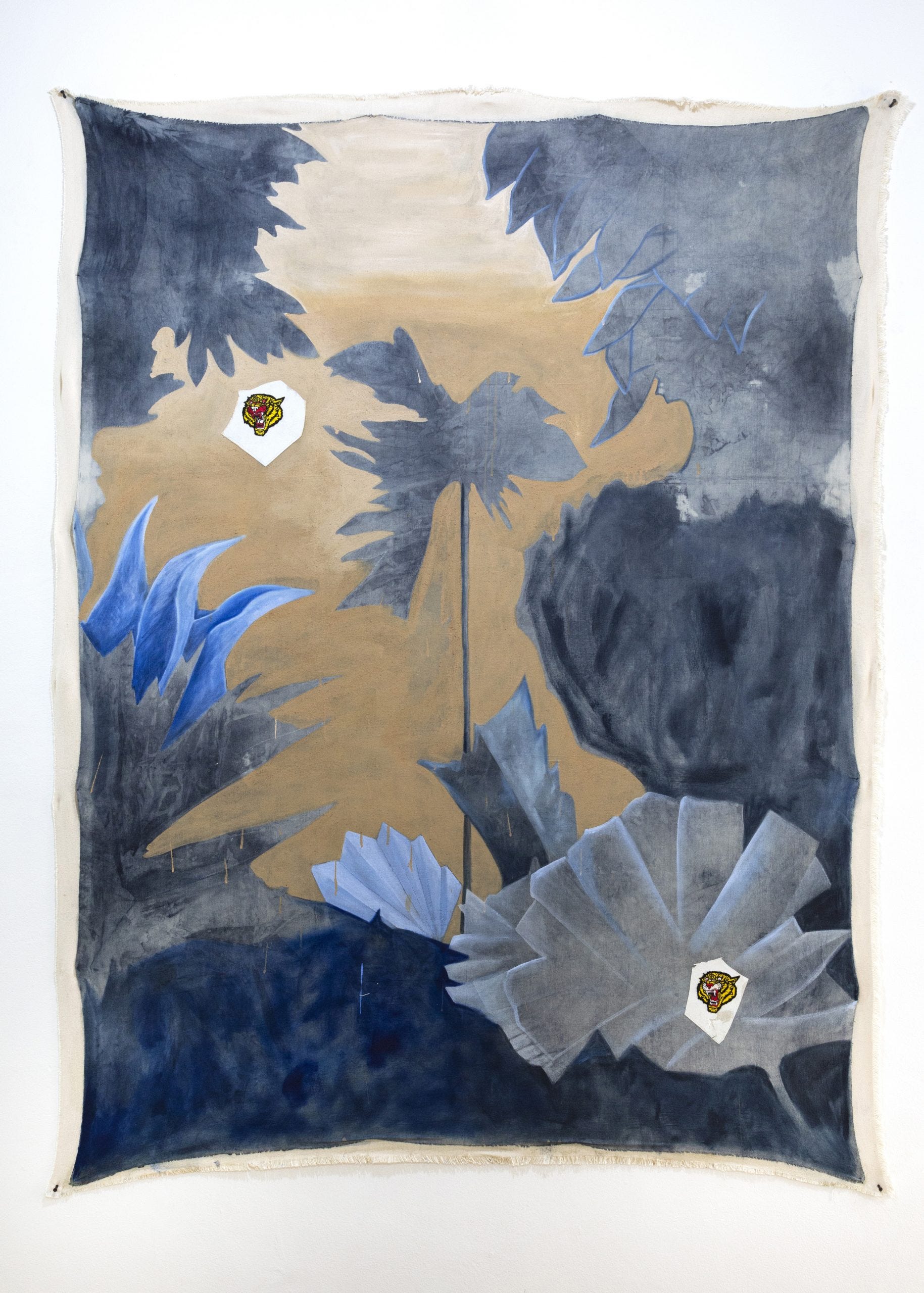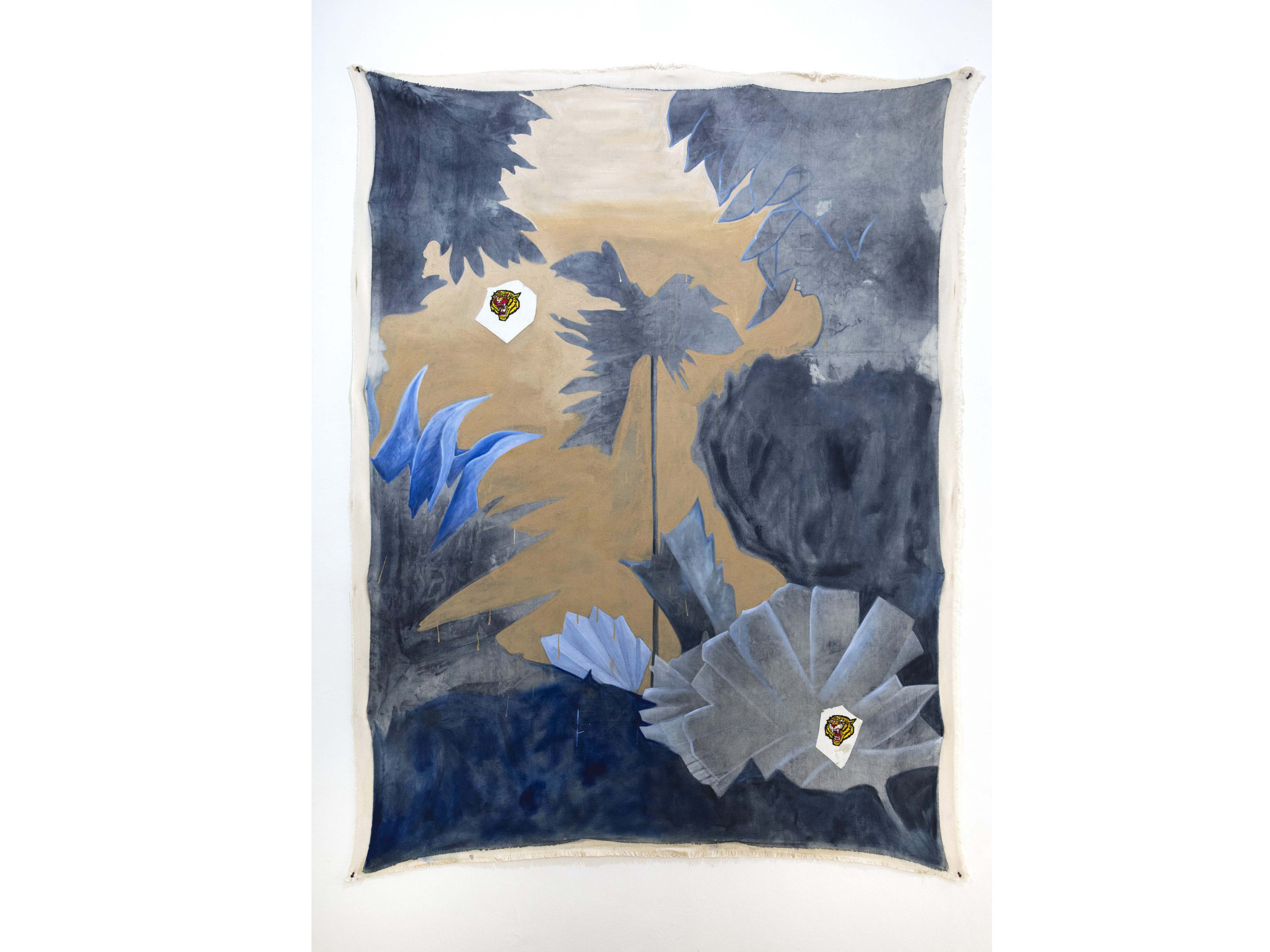 The works, both two- and three dimensional, have a tendency to portray angularity, asymmetry, and negative space. Recurring themes within the works reflect on the representation of tiger mascots and geometric influences from ancient Mesoamerican cultures. There remains a primal and ancestral quality of the works bridging the viewer towards an earlier era rich in representations of surface texture and ferocity. The paintings, sculptures, and installations are usually subdued into neutral and cool tones giving off a therapeutic aesthetic to the veneer. A recurring theme of large cats (which could be tigers or Mesoamerican jaguars) and representations of nature invoke a tribalist and naturalist spirit harkening towards eras and civilizations with spirited, warrior philosophies who have a direct relationship with the land they harvest, hunt, and sow.