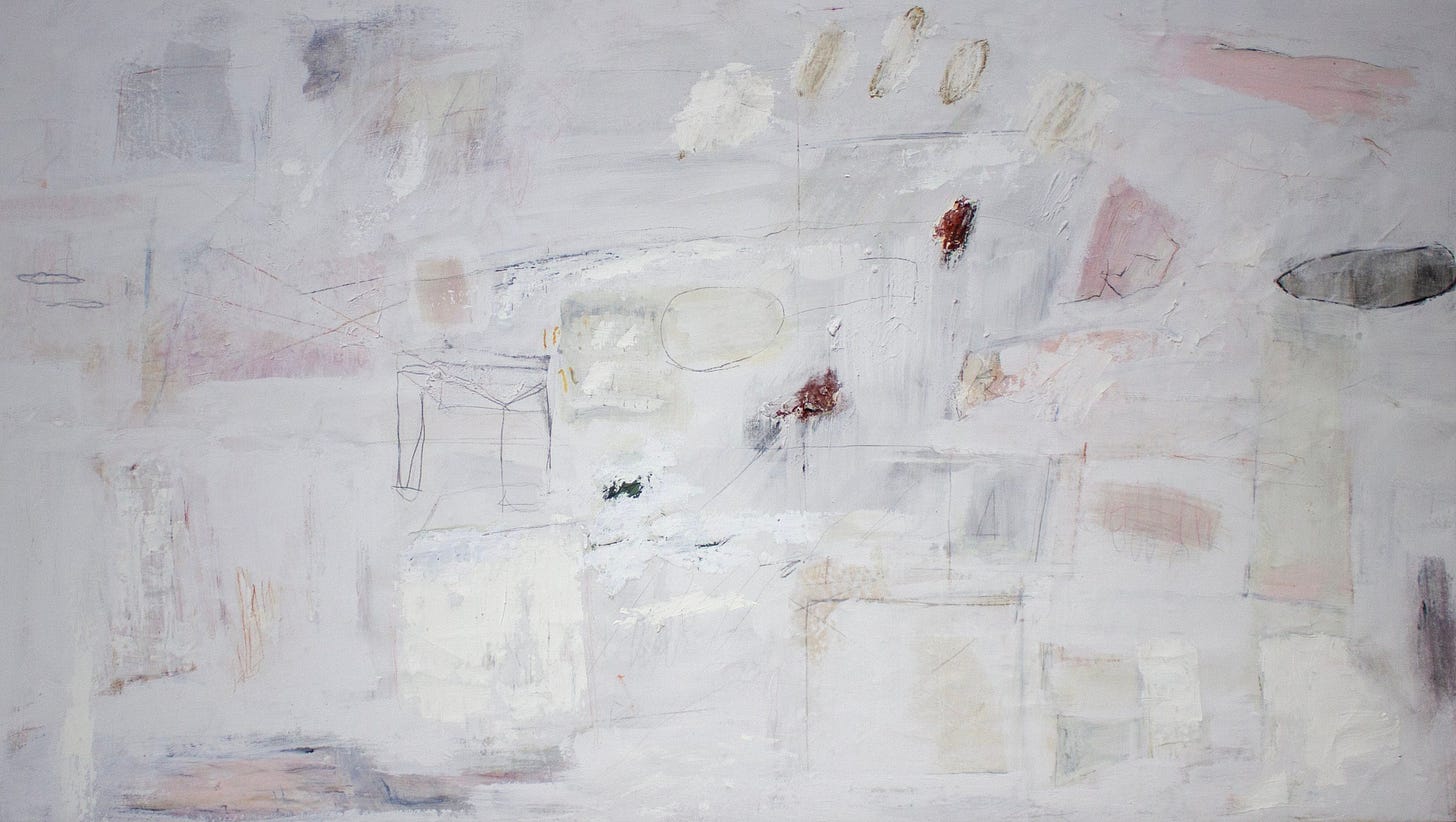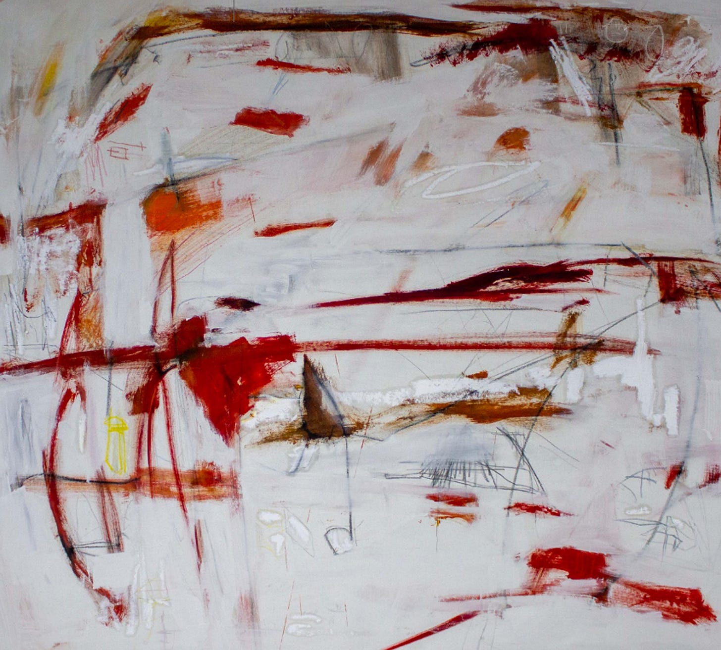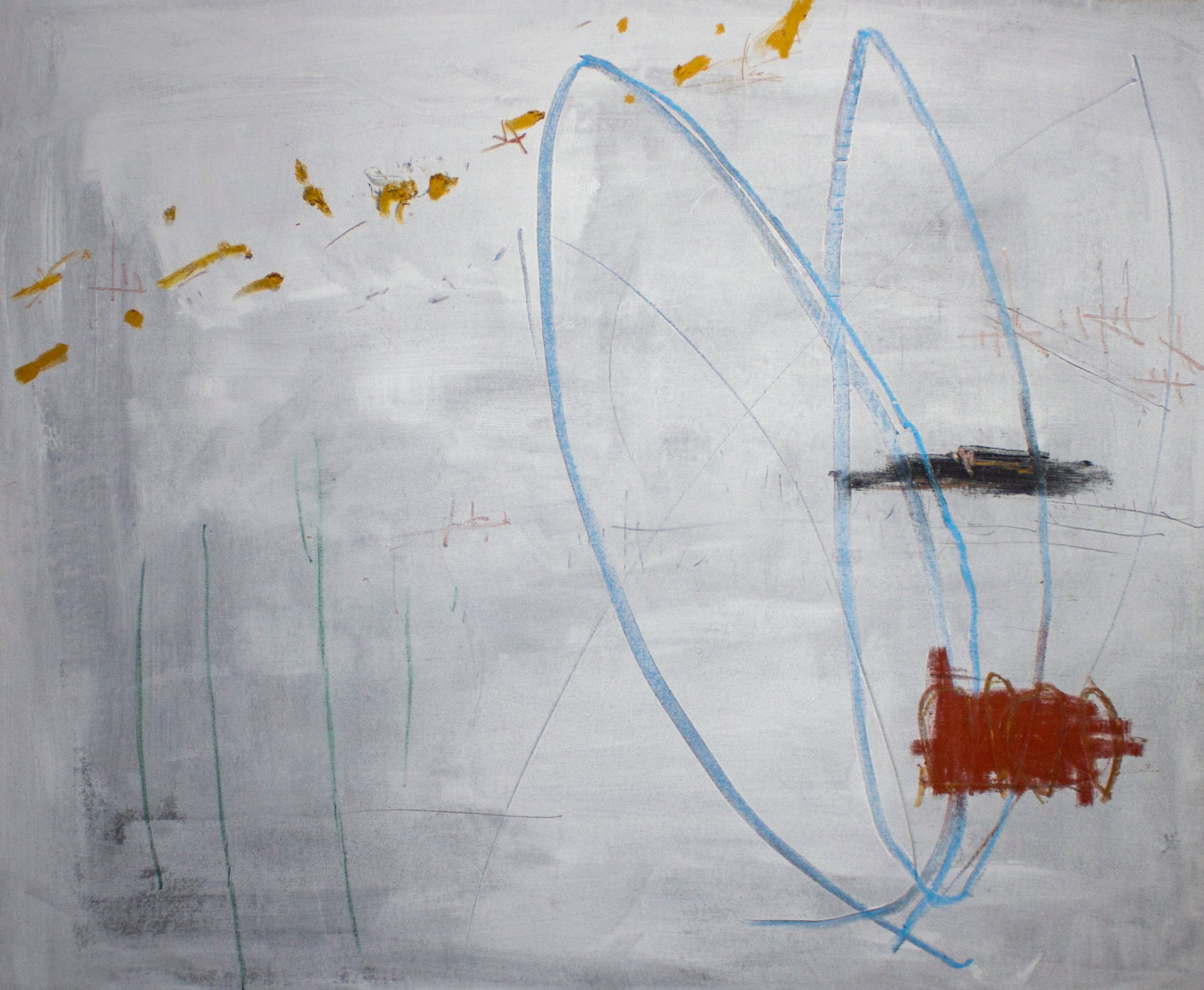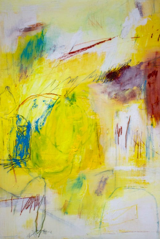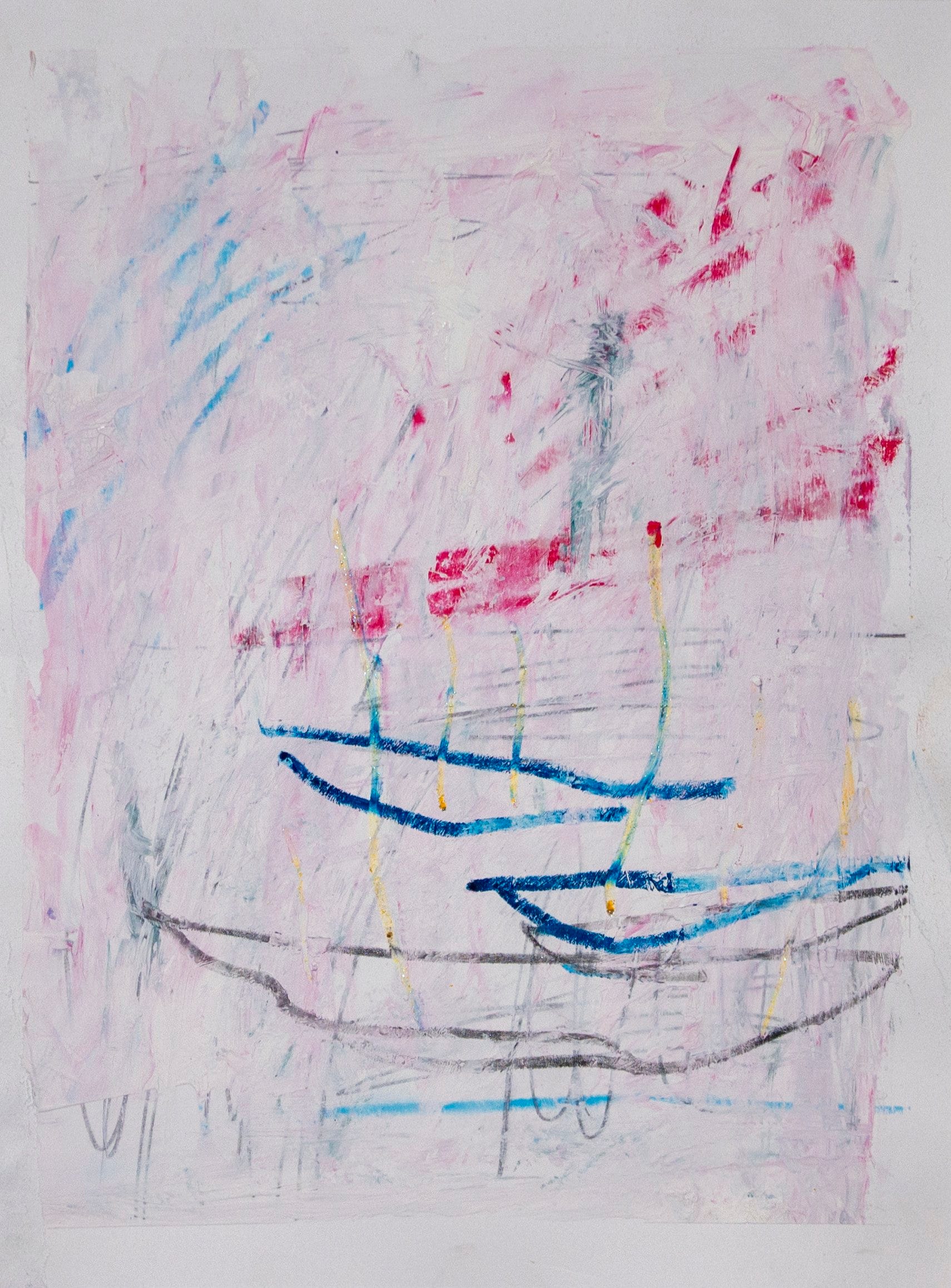 Photophobia (pictured above) is an evocative abstract work which harnesses a vibrant color palette and dynamic composition. The piece is dominated by striking yellows, with bursts of blue, red, and green, creating a sense of visual intensity mirroring an overwhelming nature of photophobia or sensitivity to light. Jerome's use of bold, sweeping brush strokes interspersed with delicate, scribbled lines adds to the chaotic yet harmonious feel of the work. The textured layers and interplay of colors evoke a sense of movement and energy, compelling the viewer to engage deeply with the emotional landscape depicted. It offers a glimpse into his nuanced understanding of abstraction and has potential to convey profound personal and universal themes.