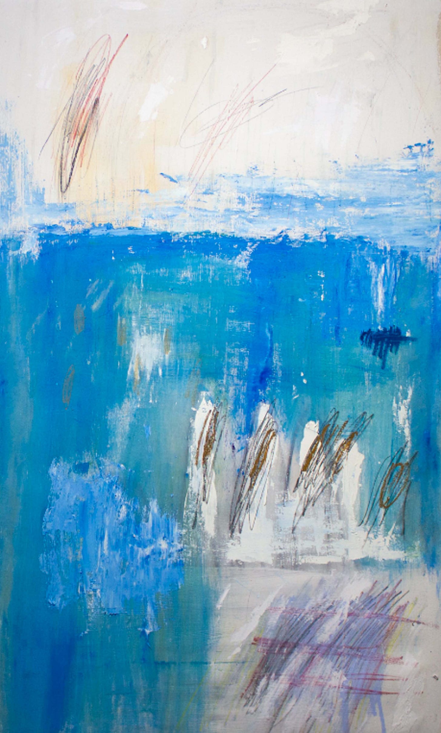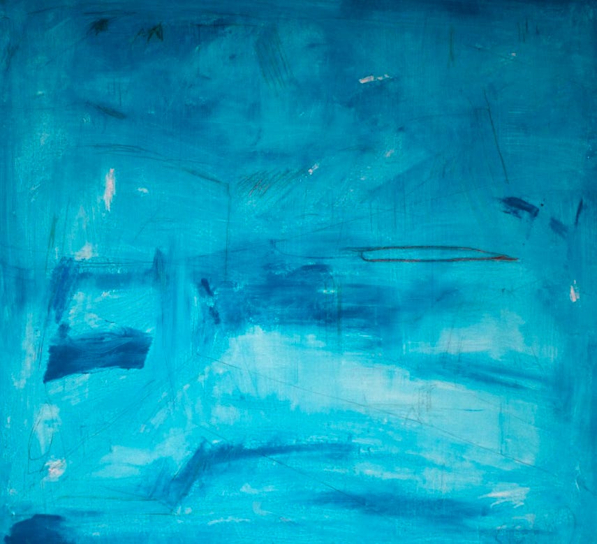 I'm Different and It's Different, but We Are Both the Same (pictured above) is a captivating exploration of abstraction which delves into the complex interplay of color, texture, and form. Dominated by a rich palette of vibrant blues, the piece exudes a sense of depth and movement, inviting viewers to immerse themselves in layered intricacies. At first glance, the painting appears to be a tranquil expanse of blue, reminiscent of the sky or the ocean. However, a closer inspection reveals subtle variations in hue and texture, achieved through Jerome's masterful use of mixed media. Broad and delicate brushstrokes create a dynamic surface which remains soothing and intriguing. A presence of darker and lighter shades of blue and occasional hints of other colors adds to the painting's complexity and depth. The work's title suggests a narrative of duality and unity, reflecting the artist's journey and to communicate difficult-to-articulate experiences. The painting's composition, seemingly random yet carefully considered marks and shapes, mirrors the chaos and order inherent in life. Such a tactile element, combined with the vibrant color scheme, evokes emotions, from calmness to introspection.