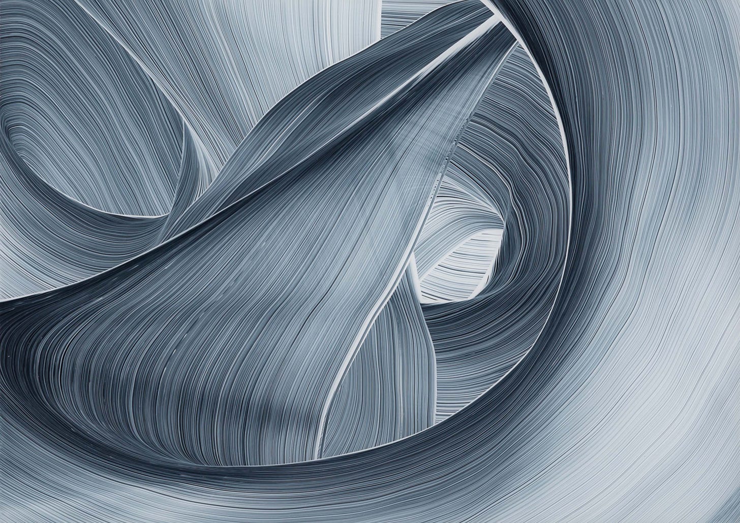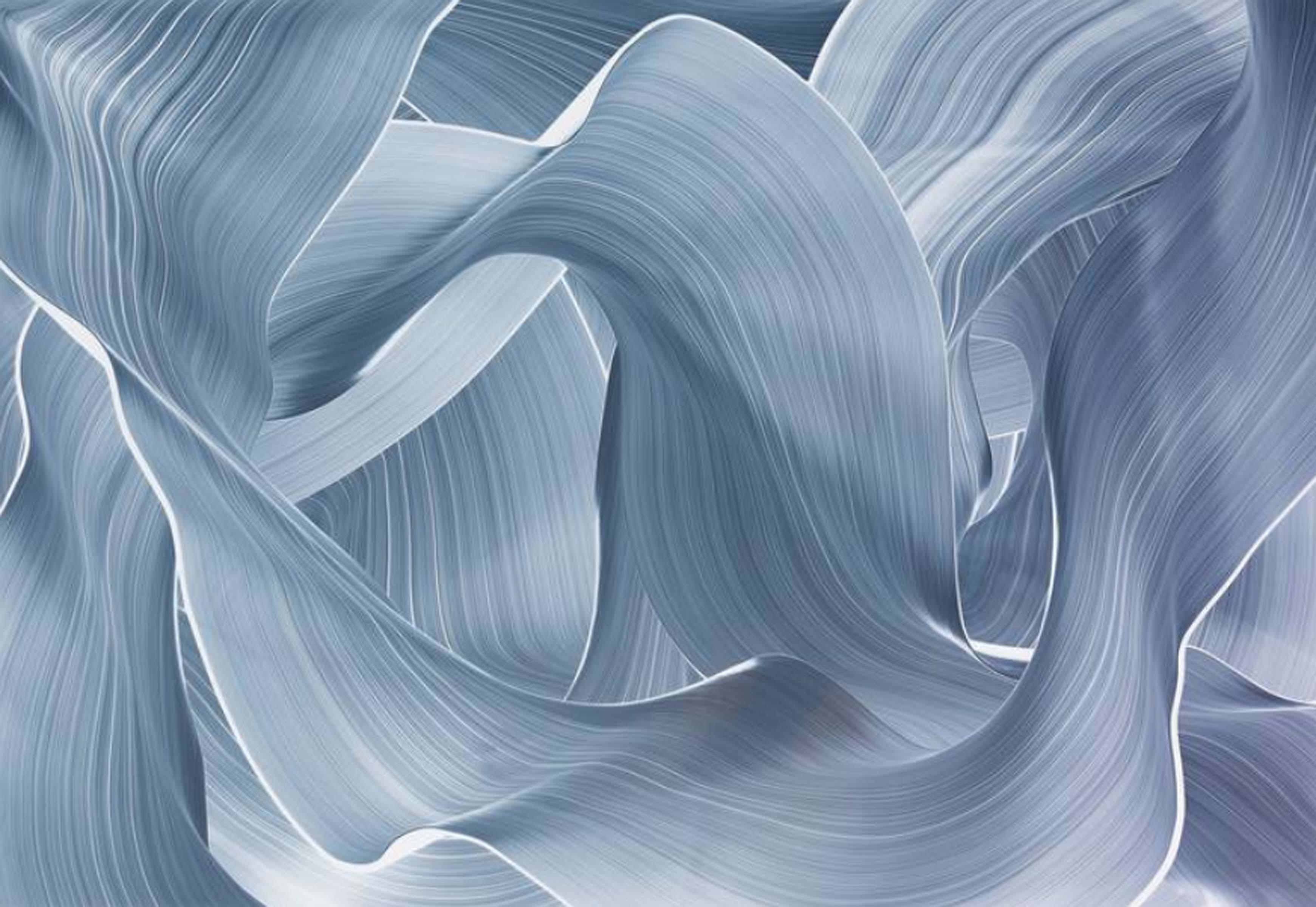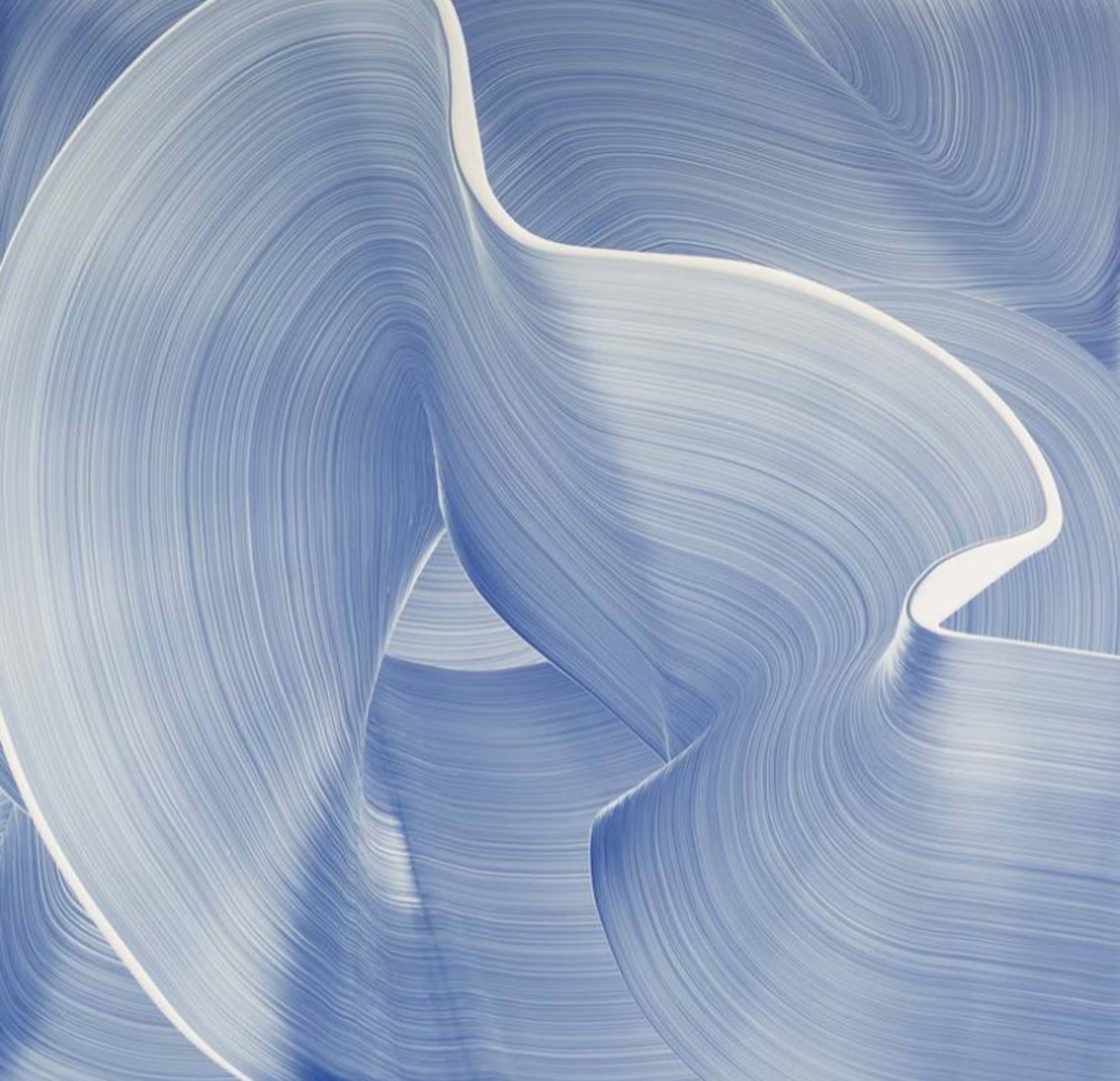 These monochromatic compositions are soothing in their consistent cool grayish-blues and off-whites revealing tapestry-inspired shapes which lay with asymmetrical harmony across the surface. Although the works are totally abstract, they are not executed with improvisation or compulsion, but rather through careful composure and direct precision of the brush. The brush strokes within the paintings represent movement and flow of the paint rather than of direct expression.