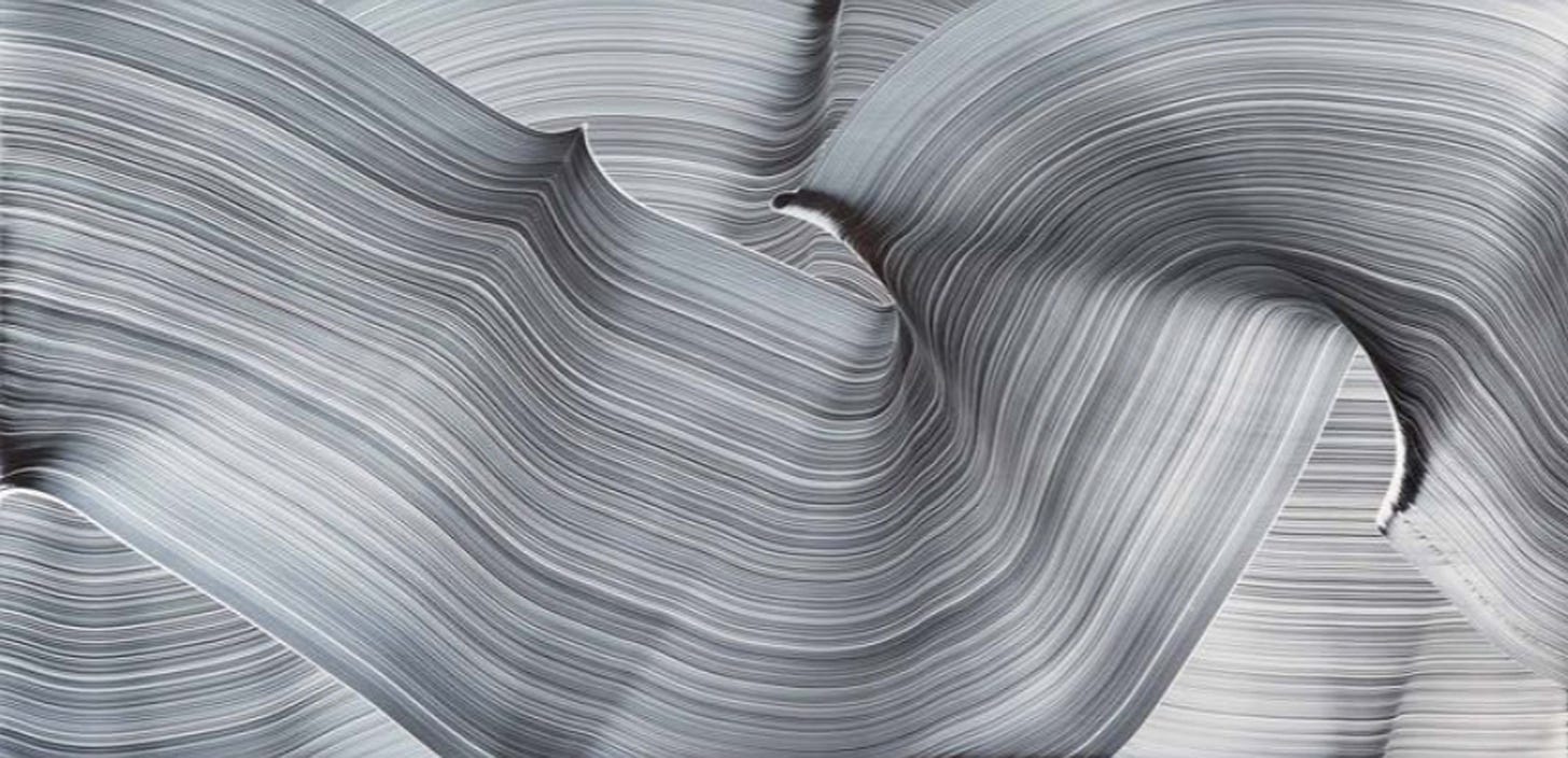Untitled ( pictured above) contains an oil on glass paintings with pristine form and finish one would find on a fine piece of machinery such as a brand new kitchen appliance. The metallic representation folds with minimal elegance and composure. A fine work which represents the clockwork precision tuning of perfected form elegantly flowing across the surface, much like how the foam of the sea caresses the sands of the shore.
