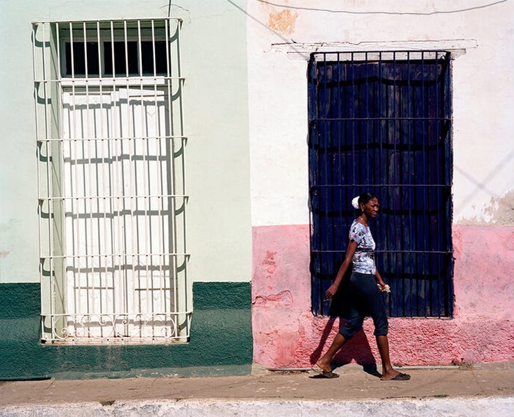 Cuba # 4 (pictured above) depicts a stylish man in his rugged Western attire walking past a colorful building with decorative security bars on the windows and doors. Although stylish, his attire appears humble and worn, rather than new. The figure walks down the street with his head down as if to lay low and walks among the contradictions of a glamorized clay building with a heightened sense of elegant security. The piece evokes the repudiations of Cuba with feelings of distinct cultural identity yet deep underlying economic and safety concerns.