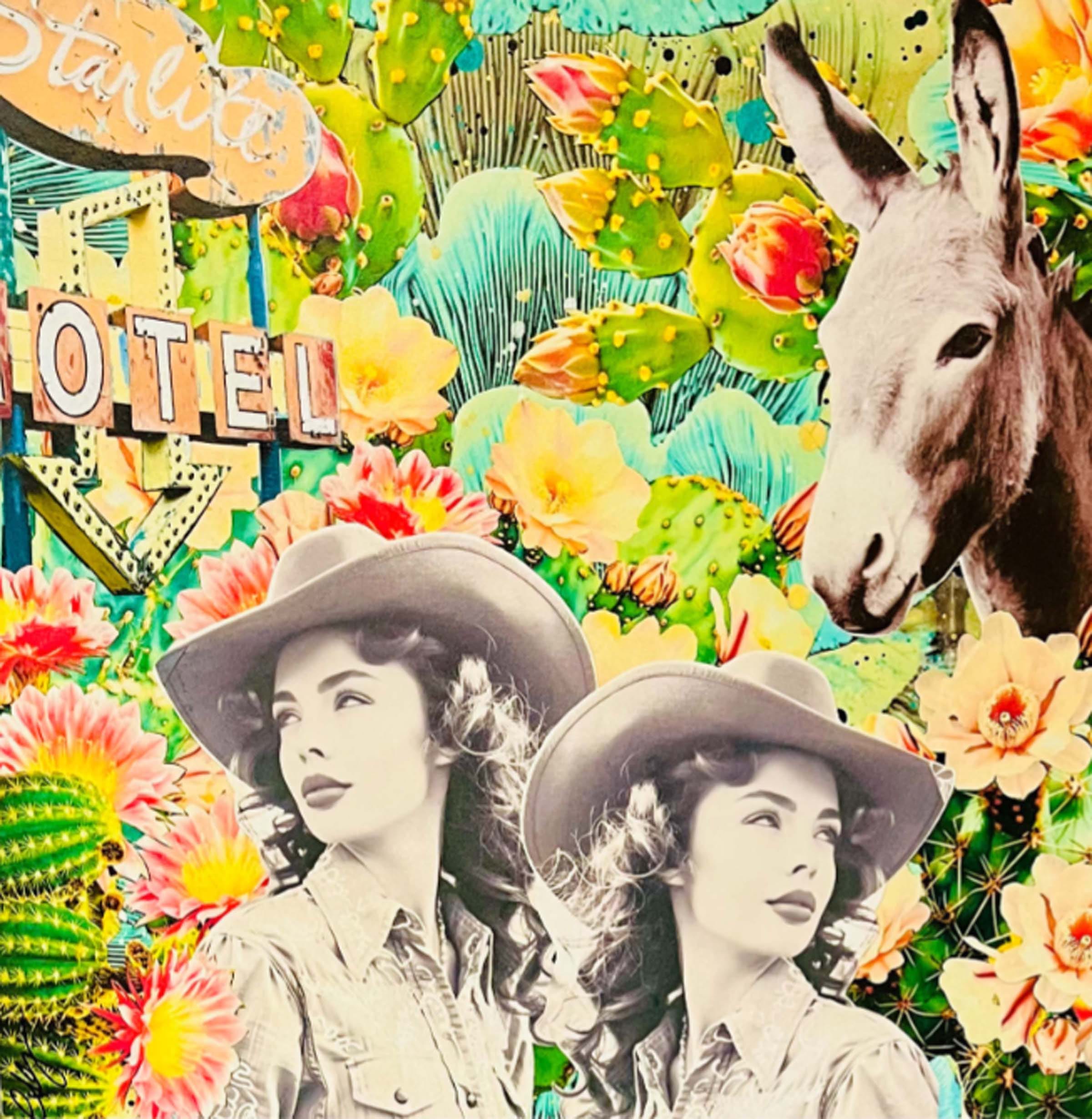 Cowgirls (pictured above) reminisces towards California-Western aesthetics through both modern imagery of a vintage motel along with 19th century attire and a donkey to symbolize labor. The various cacti and florals within the composition invokes the beating sun of the Mojave desert. Cristina shows mirror images of the figure as if they were twins but upon closer inspection will see the picture becomes shown as inverted. She looks upon her surroundings while being smothered by cacti and florals with confidence and a western grit.