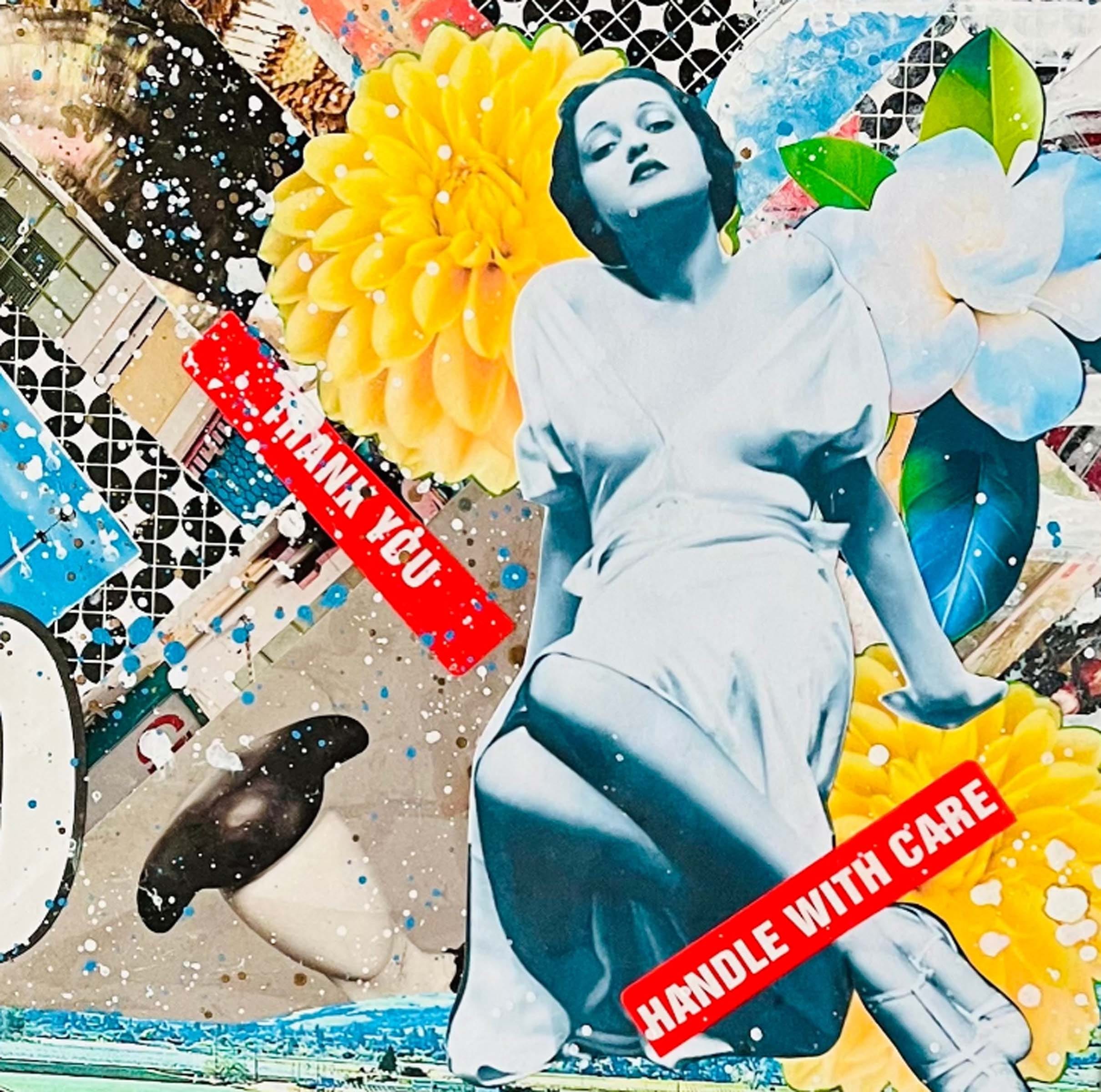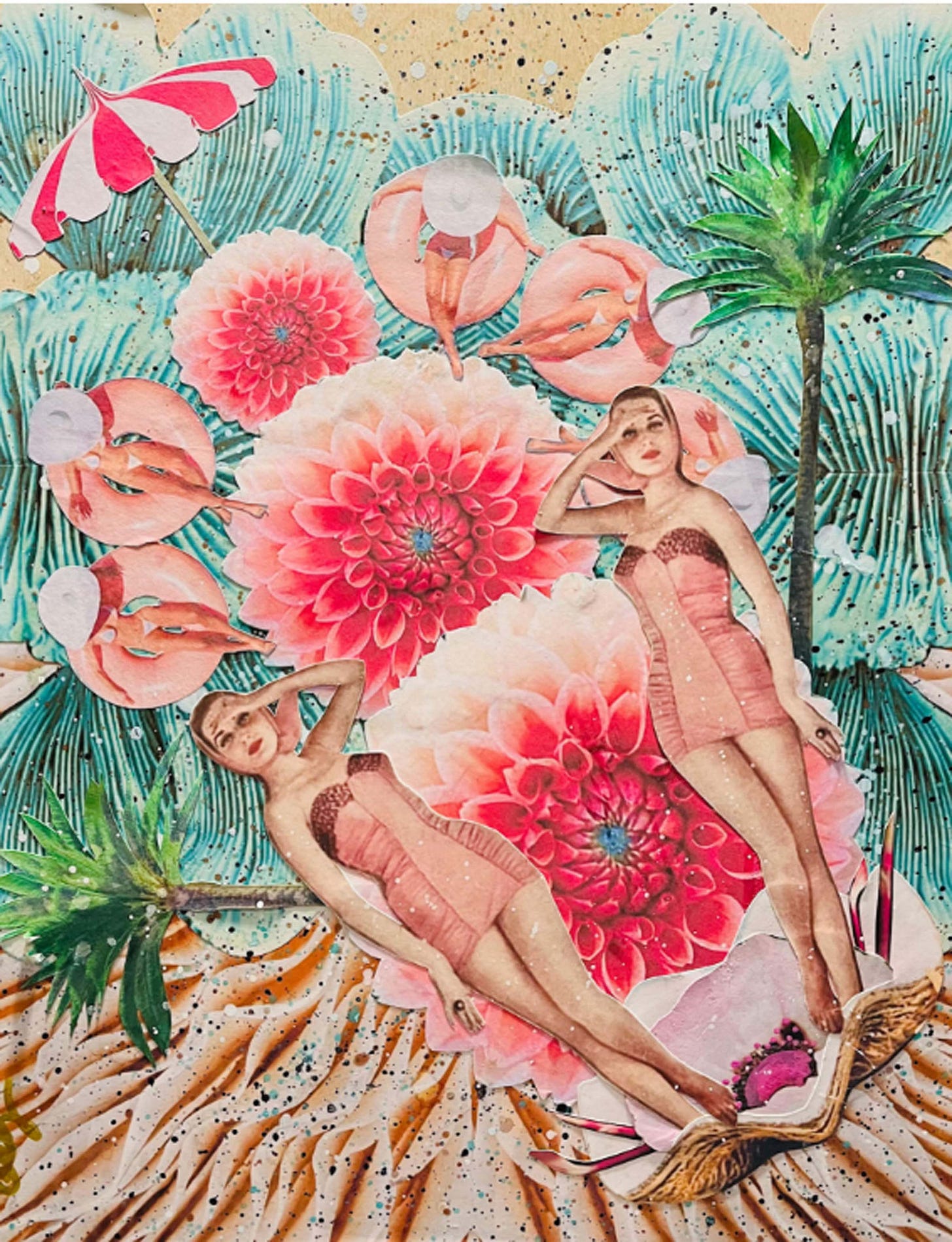 Through grand theatrics and pop art aesthetics, Cristina Sayers collage works are practices in recreating symbolism similarly to the tune of a Broadway musical. Her subjects sing and dance while the contrast between neutral and bright, bold colors creates production values which invoke visual motion, guiding the eye towards the focal point of the figure or animals contained within. Through clever choice of imagery and a grand composure, Cristina creates adventurous works which harken the viewer to relate contemporary imagery with those of the mid-20th century.