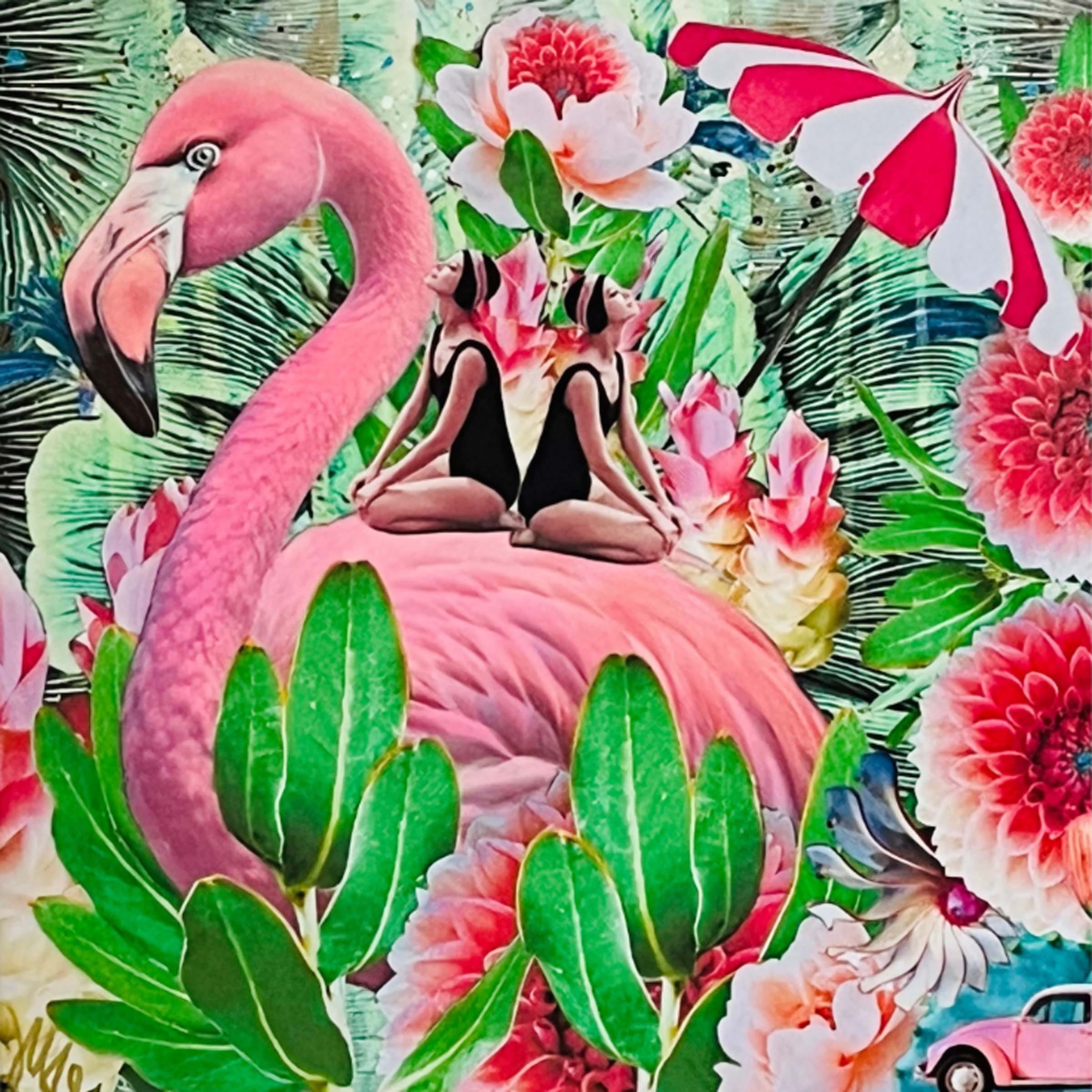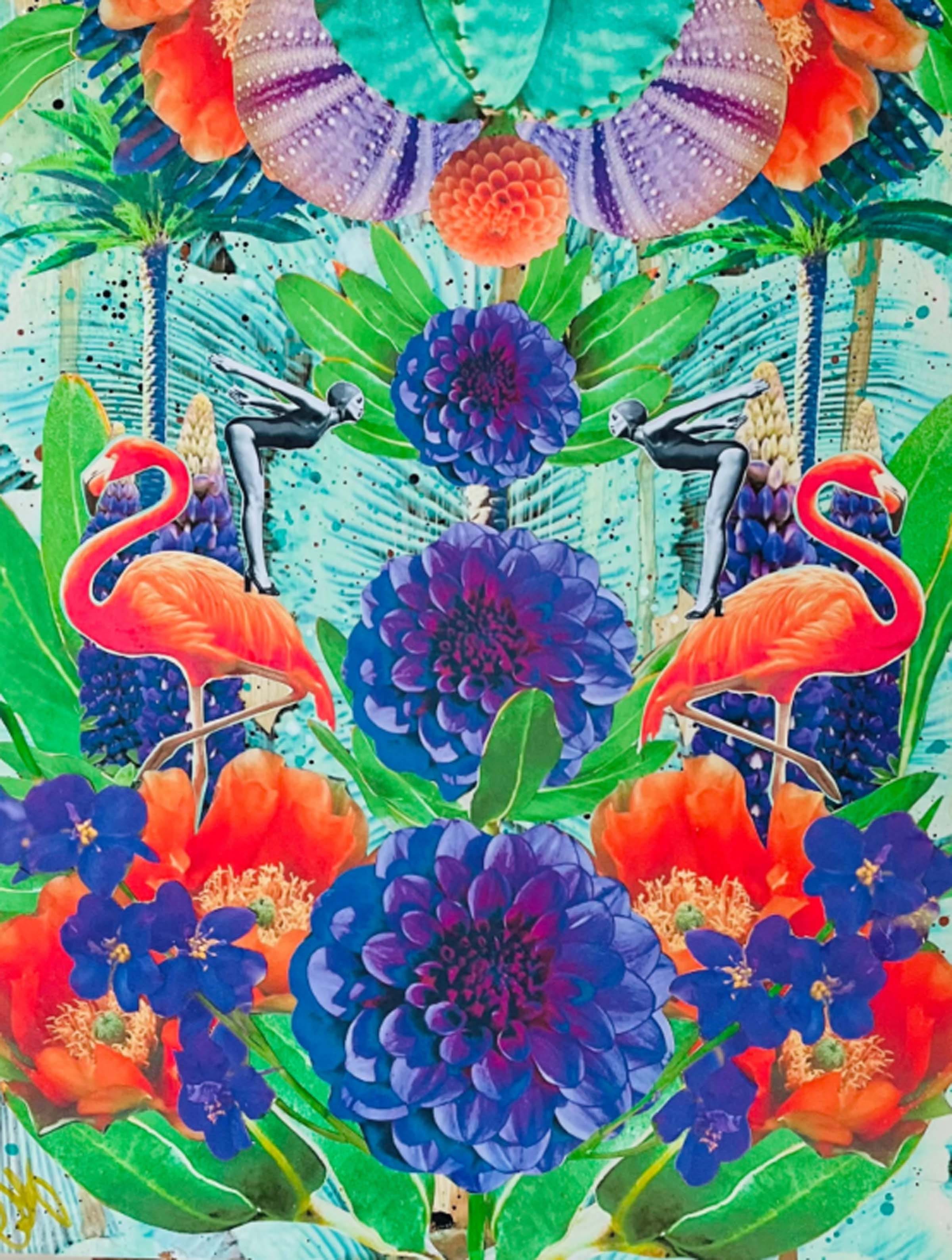 Collage remains an interesting medium because the structure usually entails the use of borrowed imagery and then restructured to become the artist’s own creation. Through the use of vintage, retro cut-outs, Cristina lays upon the surface compositions which communicate advanced pop art aesthetics. Usually constructed with analogue collage, but sometimes also incorporating digital mirrored construction techniques or acrylic paint, Cristina’s subjects of women and animals play upon the surface as if performing at a grand circus.