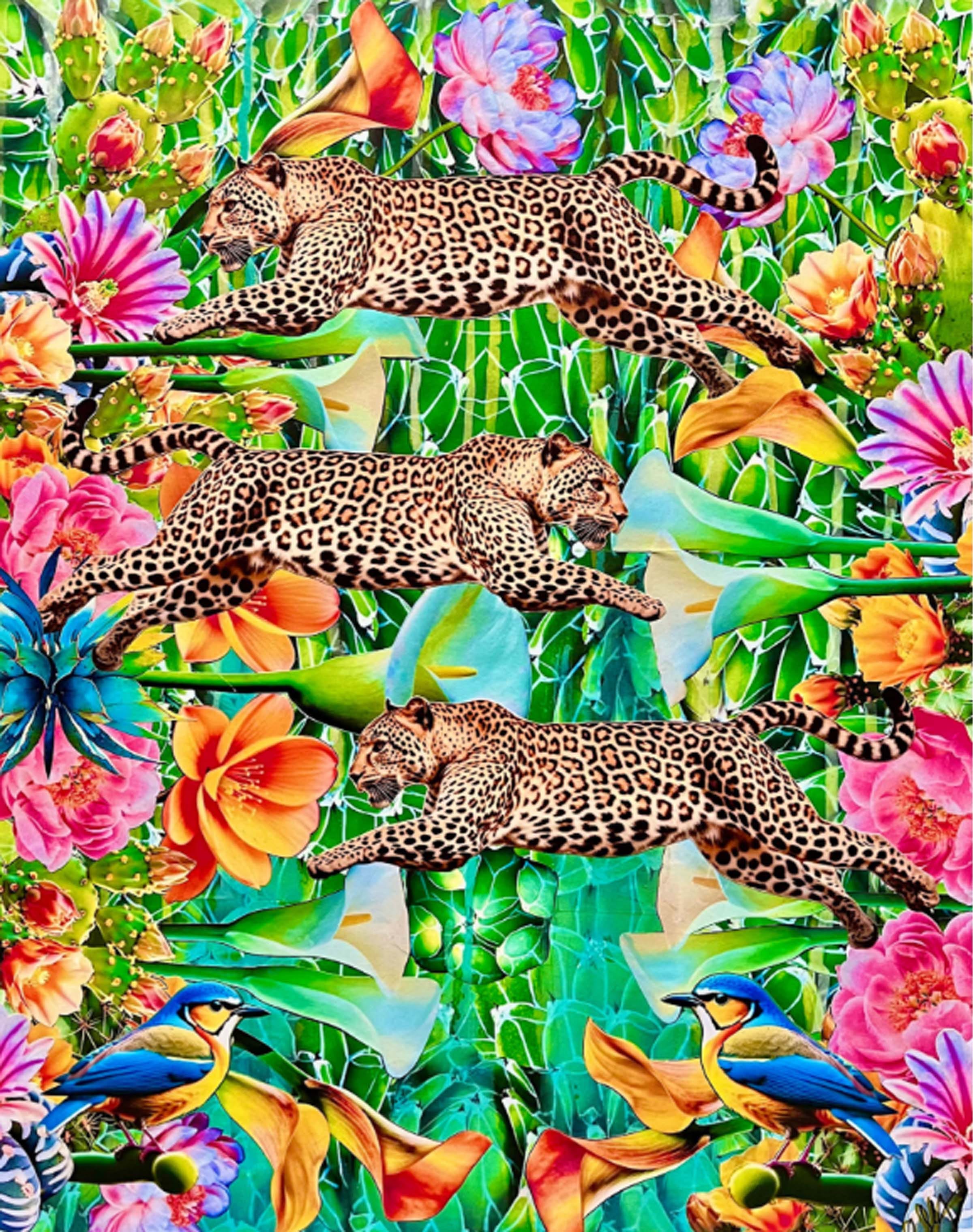 These collages are performative art pieces where the figurative subjects engage with florals, birds, and beasts which invoke qualities similar to a film or theatre production. The backgrounds typically contain bright colors which variably ‘explode’ upon the surface, spreading out and revealing the focal point figures or animals, typically in neutral tones or black and white. Cristina creates a statement about the passage of time and memory. Through these retro images and composed in a manner to elicit excitement through symmetrical compositions, similar to the design of a poster, she takes unusual and forgotten imagery and gives these subjects new life by restructuring their positions within a theatrical or circus-like presentation.