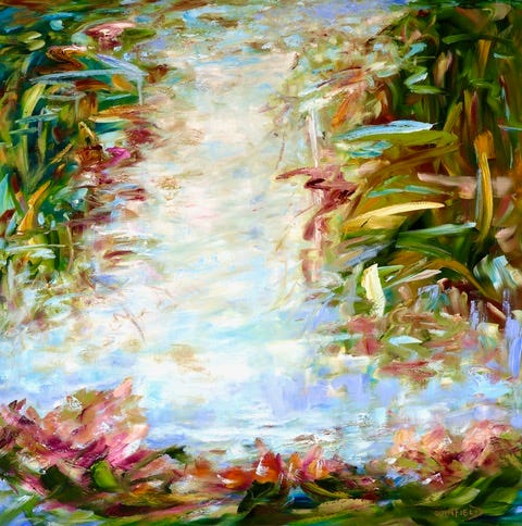 Darlene Winfield's art may be found in numerous private collections around the globe including Canada, the United States, Holland, Scotland, China, and Germany. Living abroad internationally in Mexico and Indonesia has helped Winfield develop her unique palette. She works and resides in Peterborough, Ontario Canada with representation by several notable galleries. The series of works represent a diversity usually focusing on cropped landscape scenery. The pond series for example blurs the lines between abstraction and impressionism with intense focus on a loose application of color and dynamic compositions.