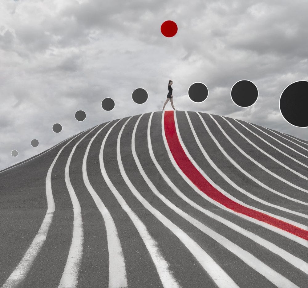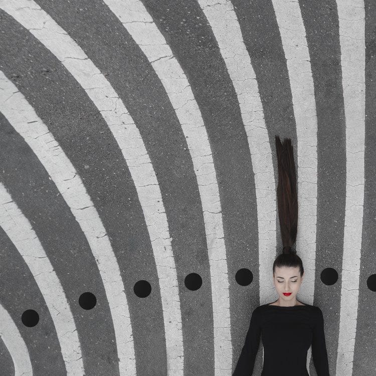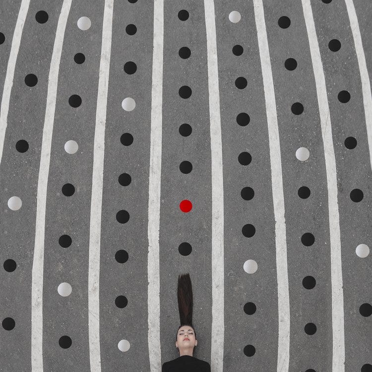 Blood Moon (pictured above), a captivating piece by Dasha, delves into themes of isolation and journey. The photograph features a solitary figure traversing a path that ascends upward, marked by bold, sweeping lines and a vivid red moon. The lines instill a sense of movement and direction, guiding the viewer's gaze toward the figure and the celestial body. The color palette, dominated by black, white, and red, heightens the dramatic and surreal ambiance. ‘Blood Moon’ encapsulates a moment of introspection, urging viewers to contemplate the journey and the destination.