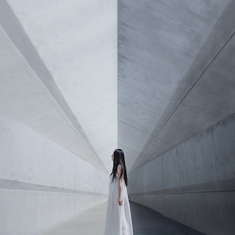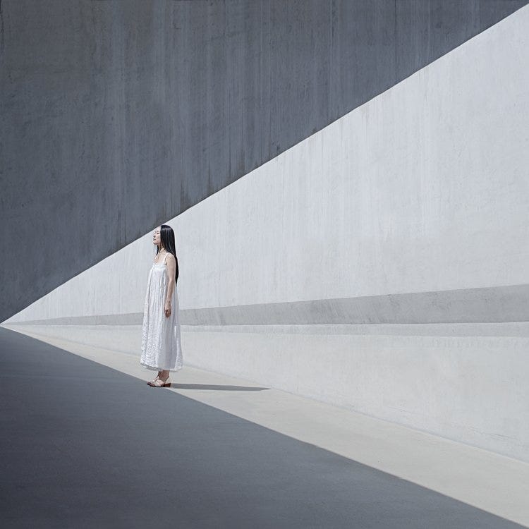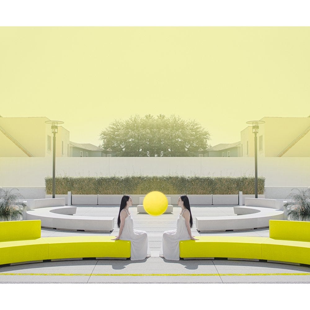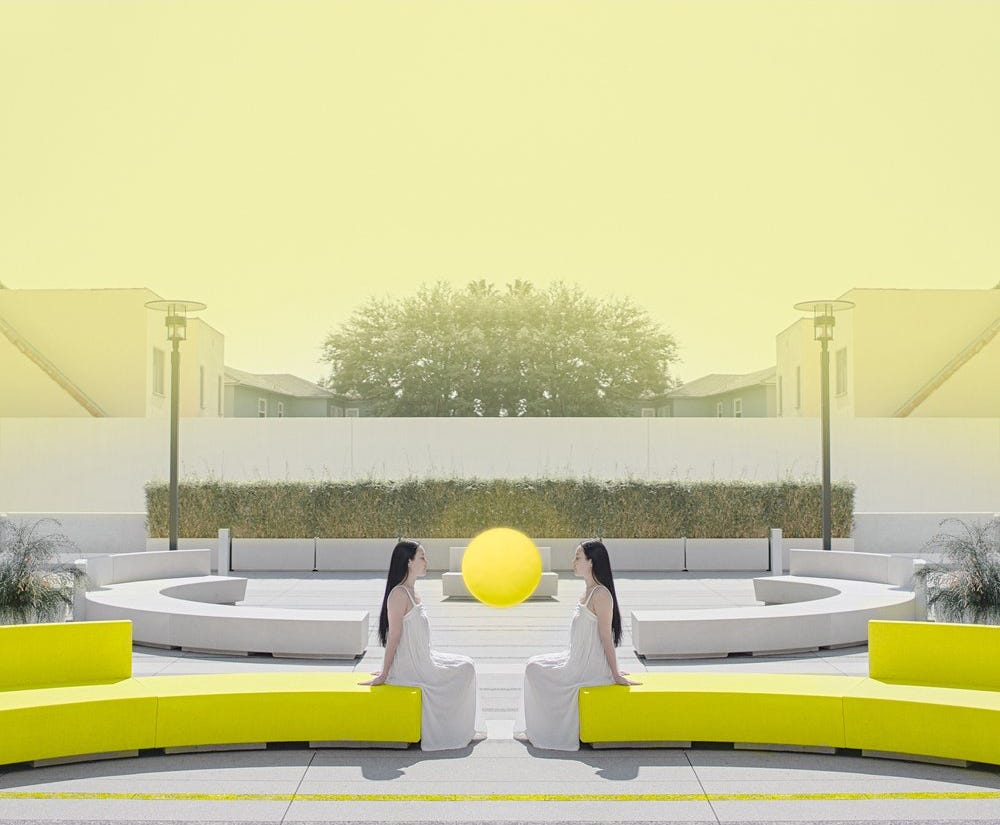 In Pool (pictured above), Dasha showcases her theatrical approach with a minimalist yet powerful composition. Pool depicts a figure reclining on a curved bench, arms outstretched, facing a monumental yellow orb. The setting is characterized by clean lines and a harmonious color palette of white and yellow. The orb, reminiscent of the sun, casts a symbolic light on the scene, suggesting themes of enlightenment, tranquility, and cosmic connection. Symmetry and balance in the composition highlight Dasha's meticulous attention to detail, creating a serene and contemplative visual experience.