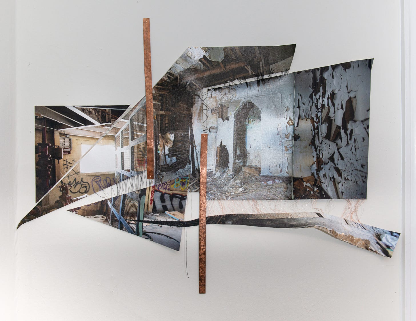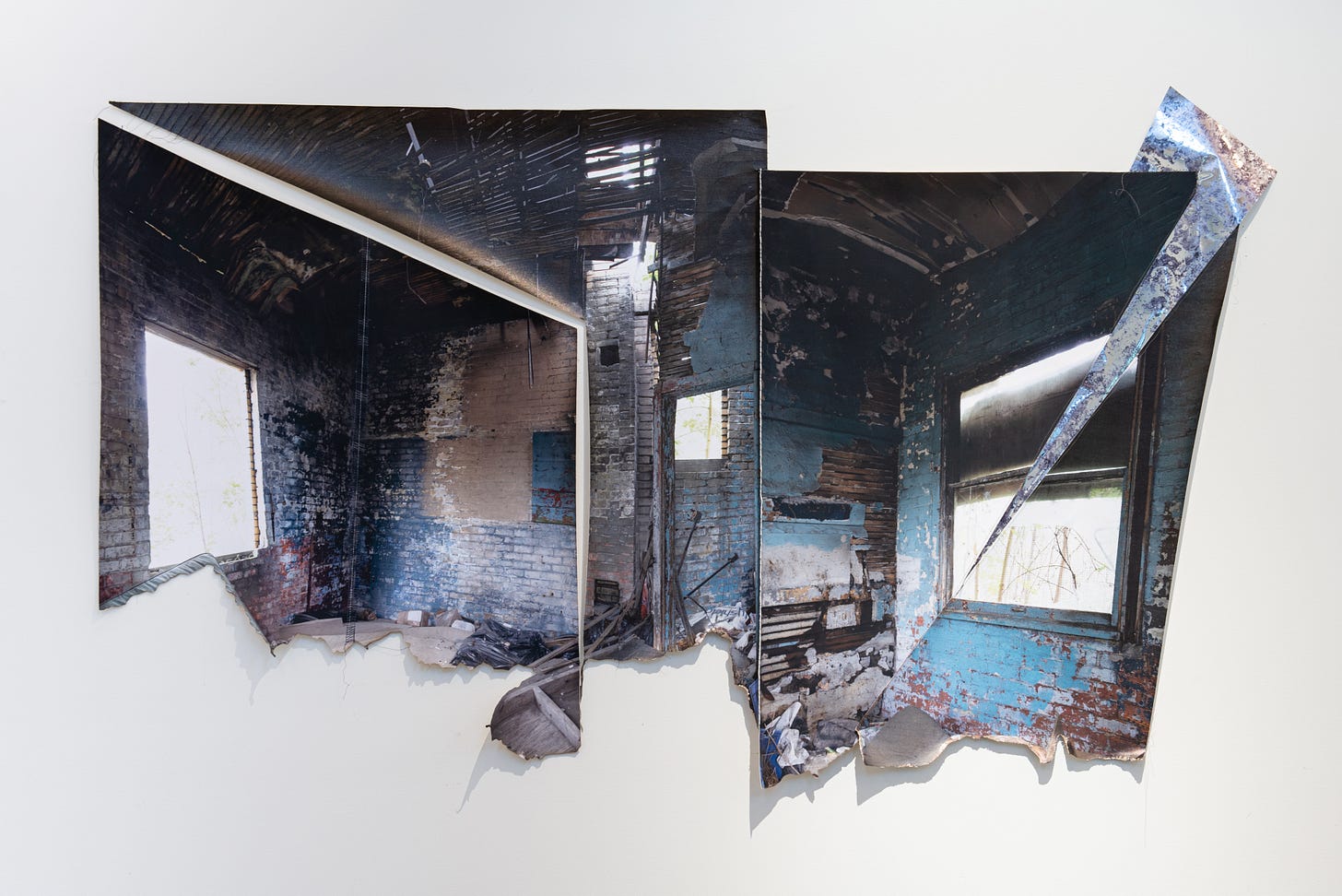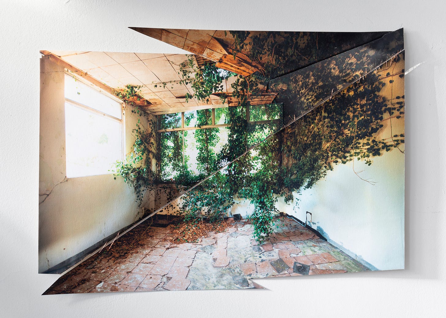 The installations are photographs molded and shaped into three-dimensional relief sculptures created by cutting, stitching, puzzling, burning, crumbling, and tearing. Some of the works contain fiber elements, as they are pieced together through threading. Diana’s photographs depict dilapidated interiors and architecture, often overgrown with mold, foliage, or left-over debris. These revealing settings convey a narrative about destructive elements of abandonment and neglect, emphasized through the power of erosion and material decay. Although, some pieces reflect delicate landscapes being molded by the form of sculpturally-altered photography, creating a shifting and disillusioned aesthetic.