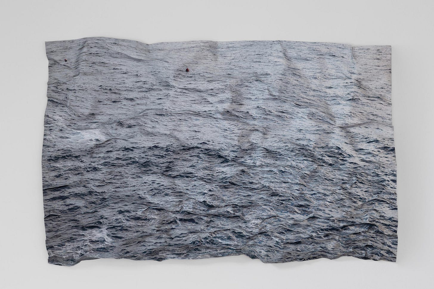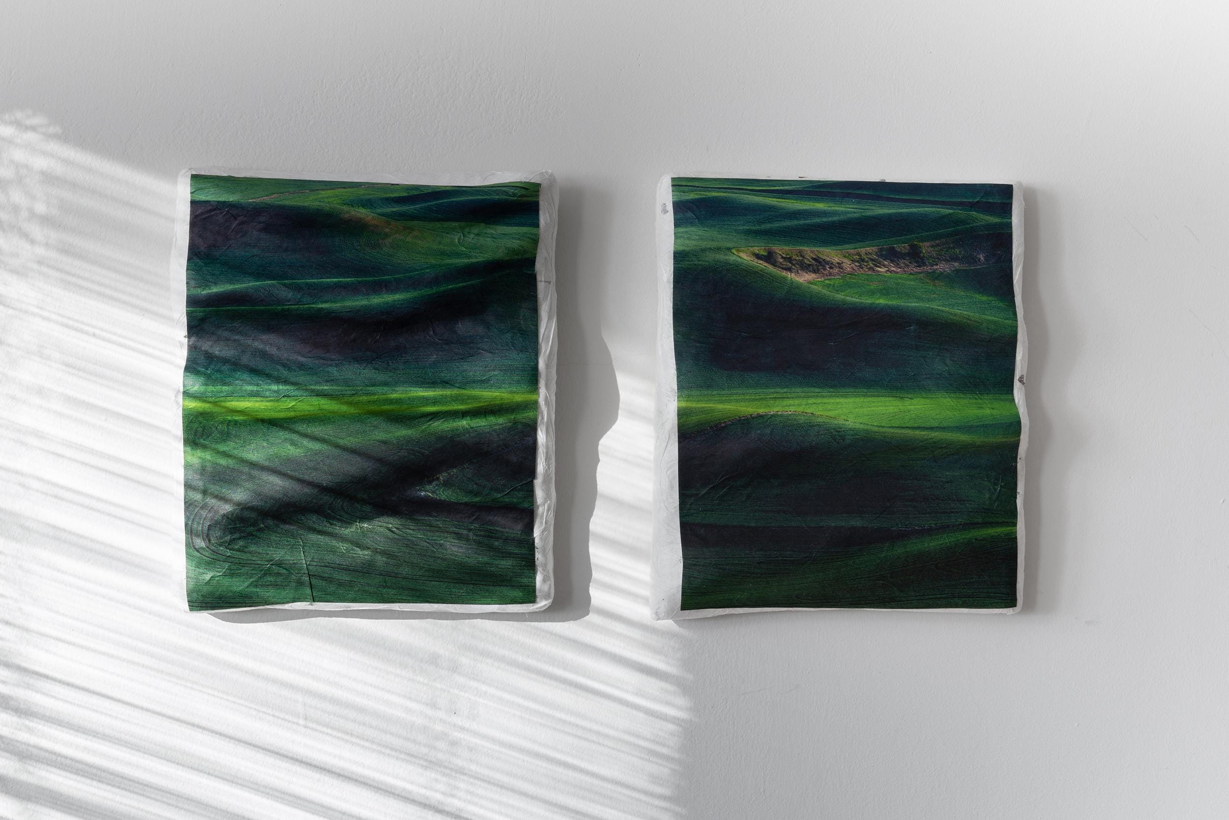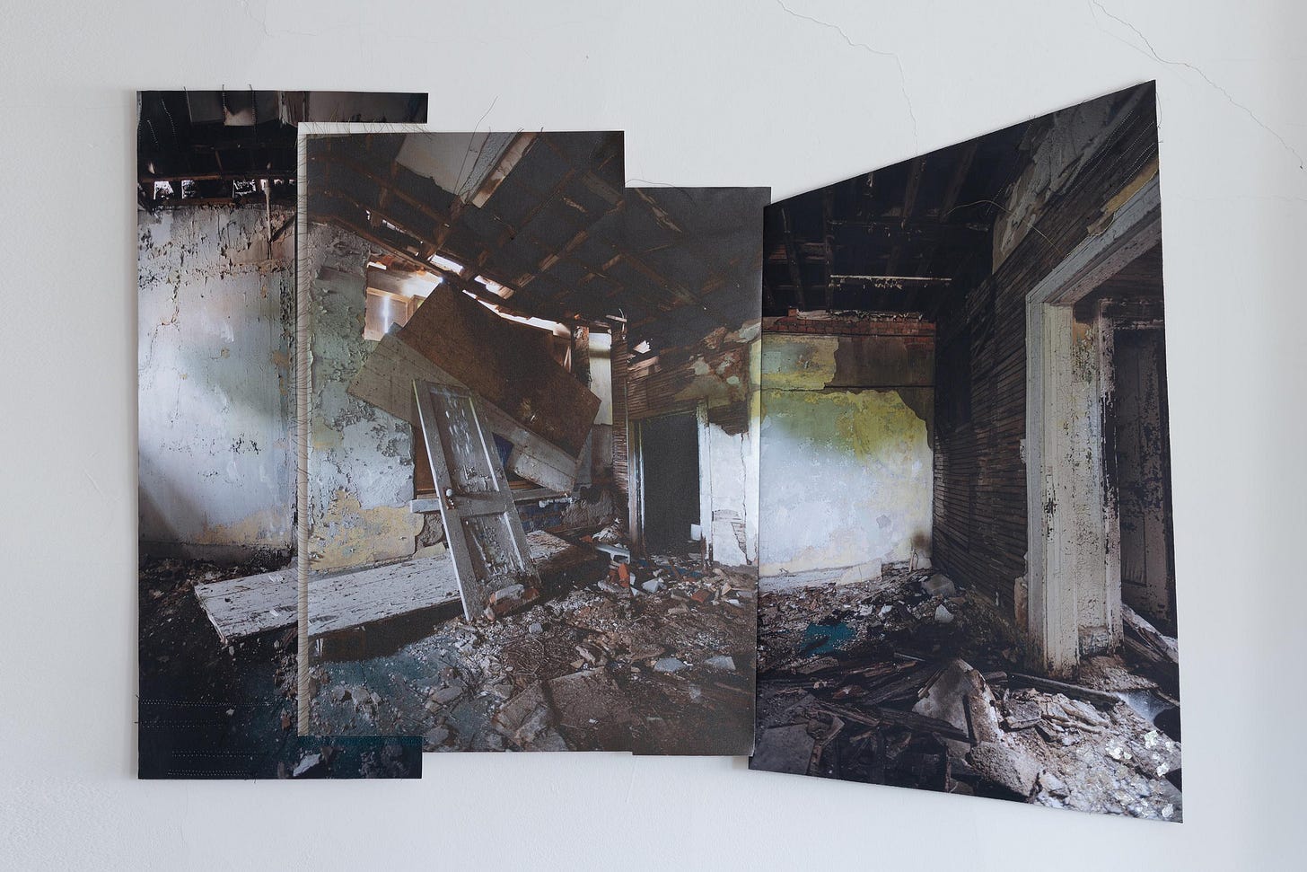 The installations are photographs molded and shaped into three-dimensional relief sculptures created by cutting, stitching, puzzling, burning, crumbling, and tearing. Some of the works contain fiber elements, as they are pieced together through threading. Diana’s photographs depict dilapidated interiors and architecture, often overgrown with mold, foliage, or left-over debris. These revealing settings convey a narrative about destructive elements of abandonment and neglect, emphasized through the power of erosion and material decay. Although, some pieces reflect delicate landscapes being molded by the form of sculpturally-altered photography, creating a shifting and disillusioned aesthetic.