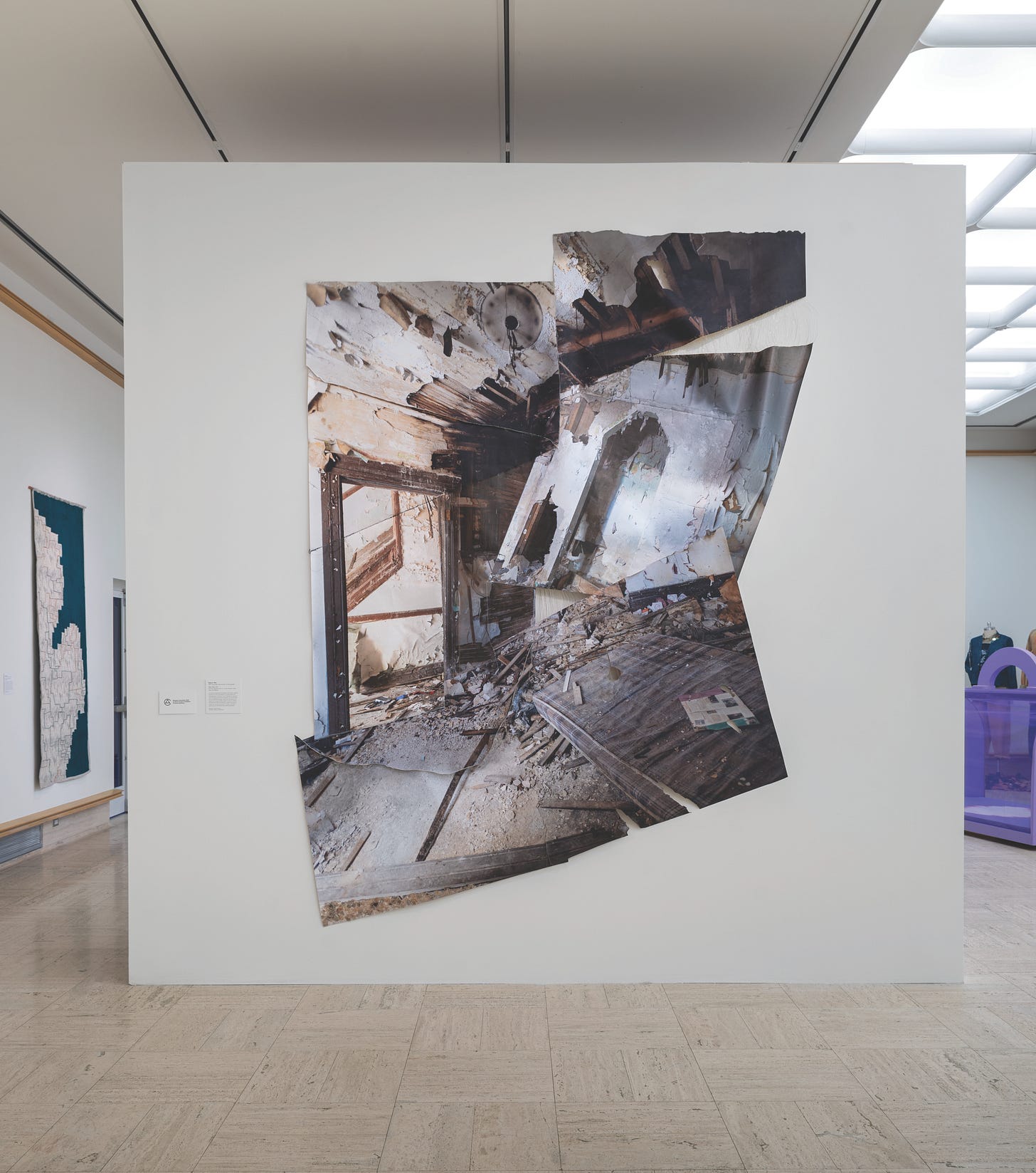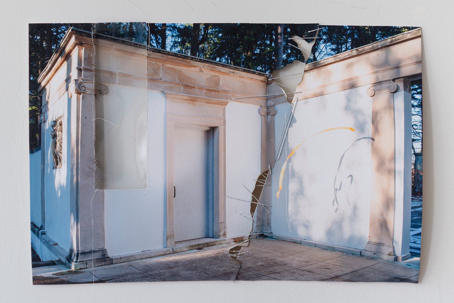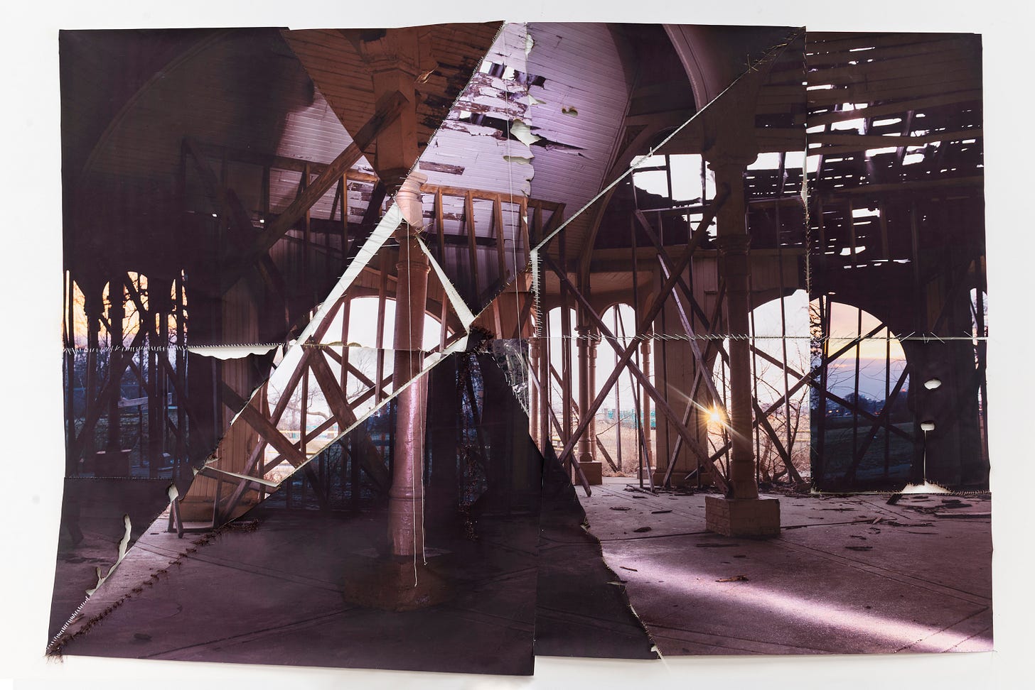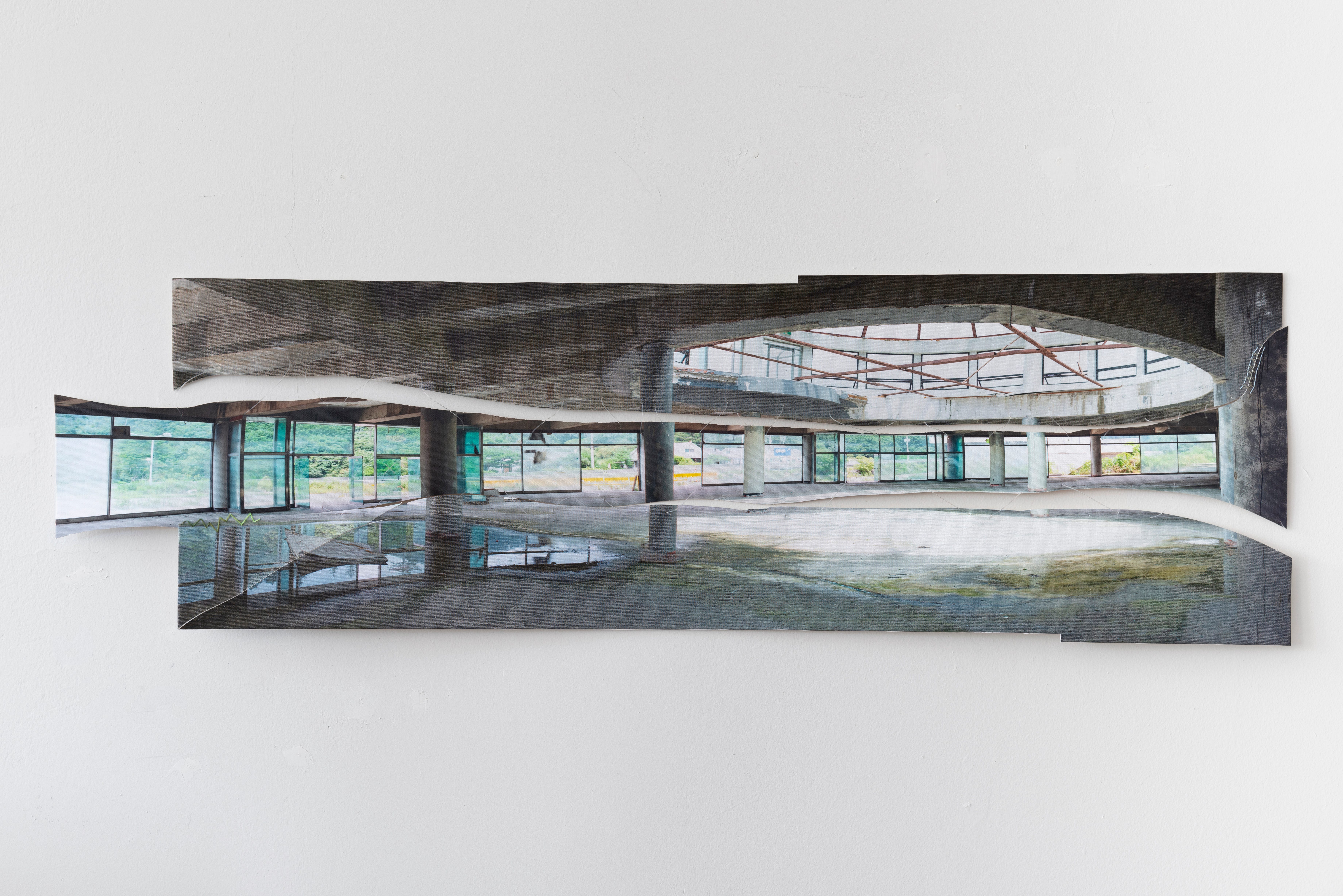 Diana Noh expresses clever use of collage, fiber, and sculptural techniques by disassembling and reassembling her own photography in playful junctions with notions of limitations. Finite confrontations of abandoned creations, represented in the forms of interiors, interact with the elements of nature. Diana’s sense of restorative qualities as an artist represents a deep inclination to repair not only our surroundings, but metaphorically with our relationships with others. In a world heavily divided amongst every ideological line, further enhanced by the confrontational enablement of digital media, her work offers reprieve for those looking to build rather than destroy.