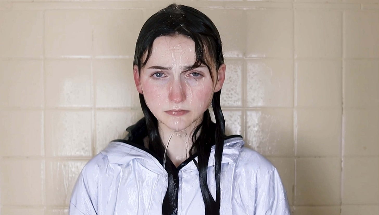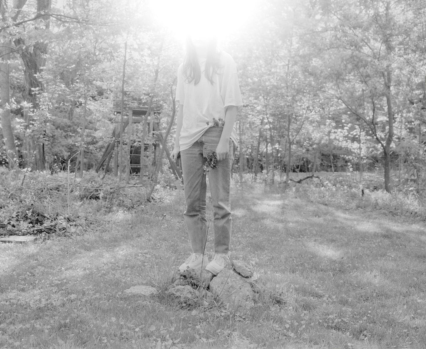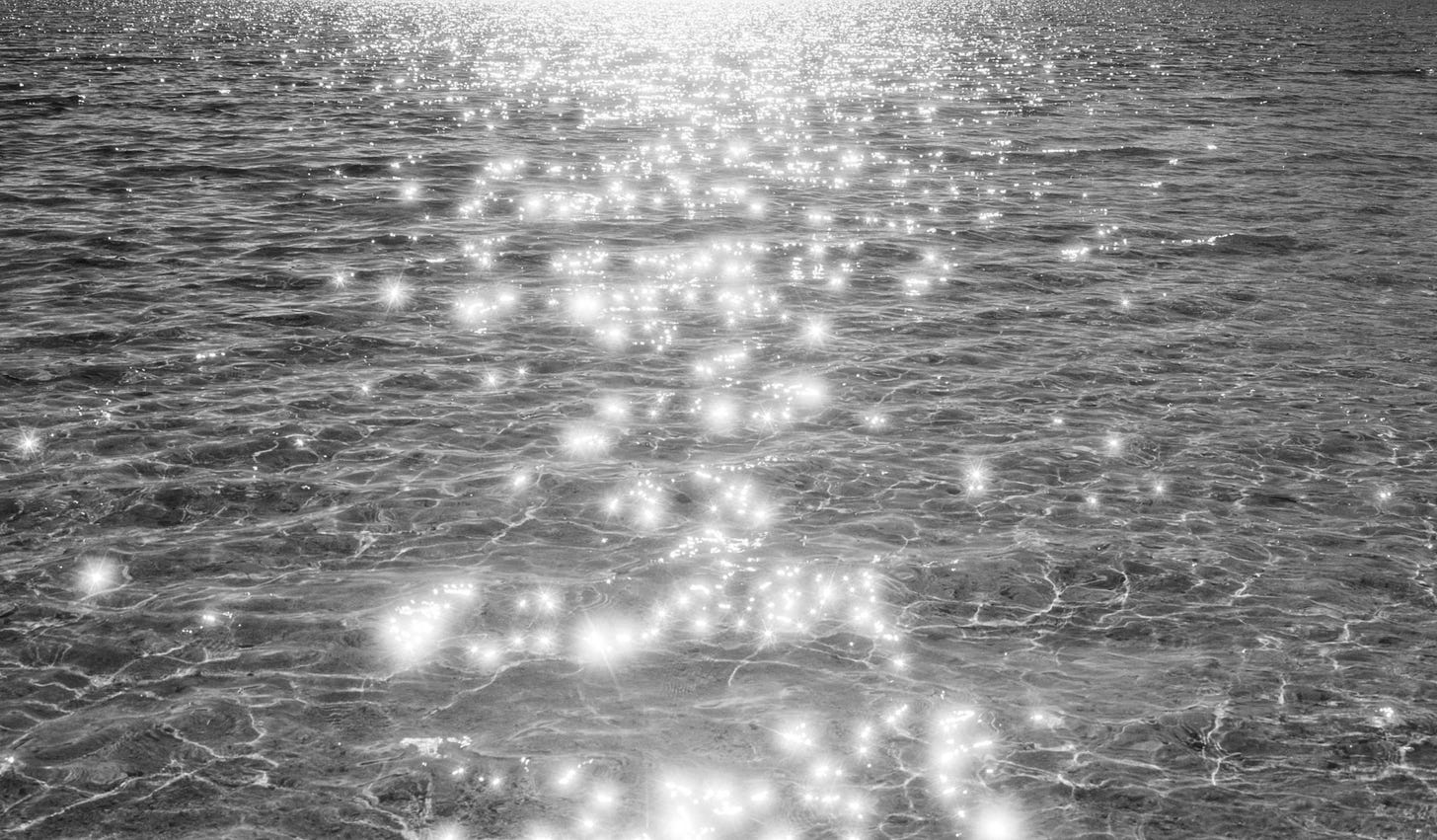 Often cropped and containing low contrast, Emmaline’s photography ranges in subject matter from fields of grass, close up textures of the ocean or concrete, and figures drenched in various reflections of light which sometimes contain visual distortions. The figurative visual interferences usually depict the subjects as if blending in with their backgrounds or being blotted out by natural elements such as light and water. With low saturation, the photography reveals an atmospheric uniformity which almost reflects a sfumato or fog within the compositions. Despite the dark undertones, Emmaline’s photographs can be described as quite beautiful and serene in their subtle capturing of luminosity and texture. Through sparkling or transparent reflections or soft, gradient shadows, her quiet scenes induce meditative qualities which can be interpreted as either steeped in sorrow or contemplation.