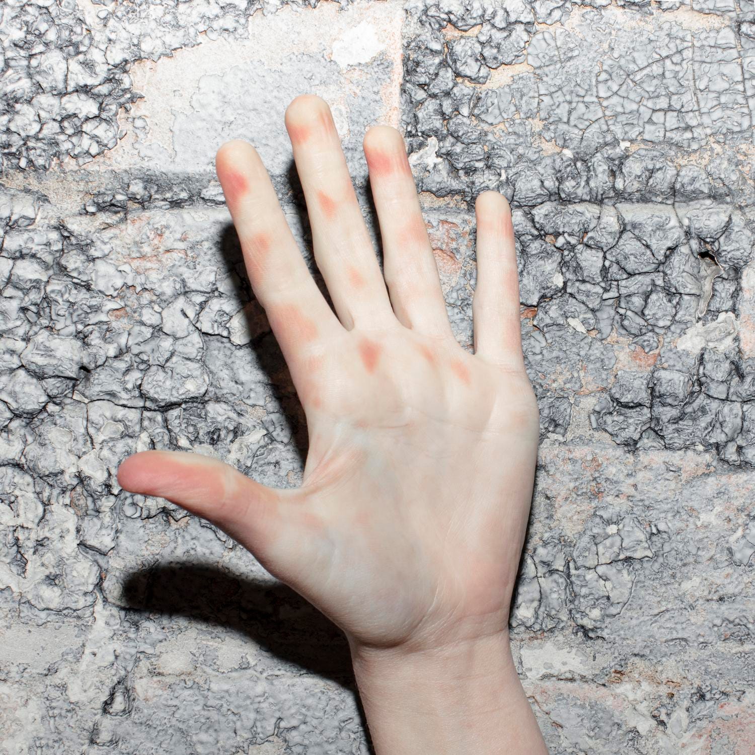 One piece from the I Thought I Saw It in the Earth and in the Open Sky series (pictured above) contains the depiction of a delicate hand contrasting against the harsh texture of aged concrete. What remains unusual about the piece would be for the viewer to notice the fingertips are depicted as bright white, unlike the pinkish tone throughout the rest of her hand. As if the model’s hands were pressed upon a surface for a sustained amount of time, the pale fingertips are displayed upon as in an inflamed status similar to the raw texture of the concrete.