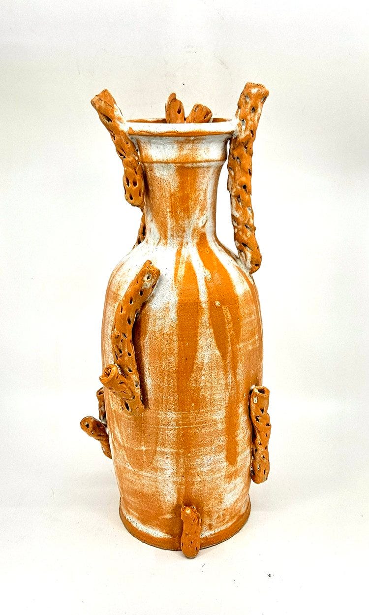 Chollo Bottle, Cone 6 (pictured above) appears like a sculptural installation with minimalist-style application of color and slabs of vine strips asymmetricaly and randomly apportioned throughout the surface, Standing tall and confident, the vessel contains a long but sturdy neck followed by a stretched out slim body. The glaze on the piece almost appears as if applied with sandpaper and several slabs of vertical brushstrokes. Crude, yet elegant, refined yet ancient and brutish, the vessel communicates dichotomies of contradictions.