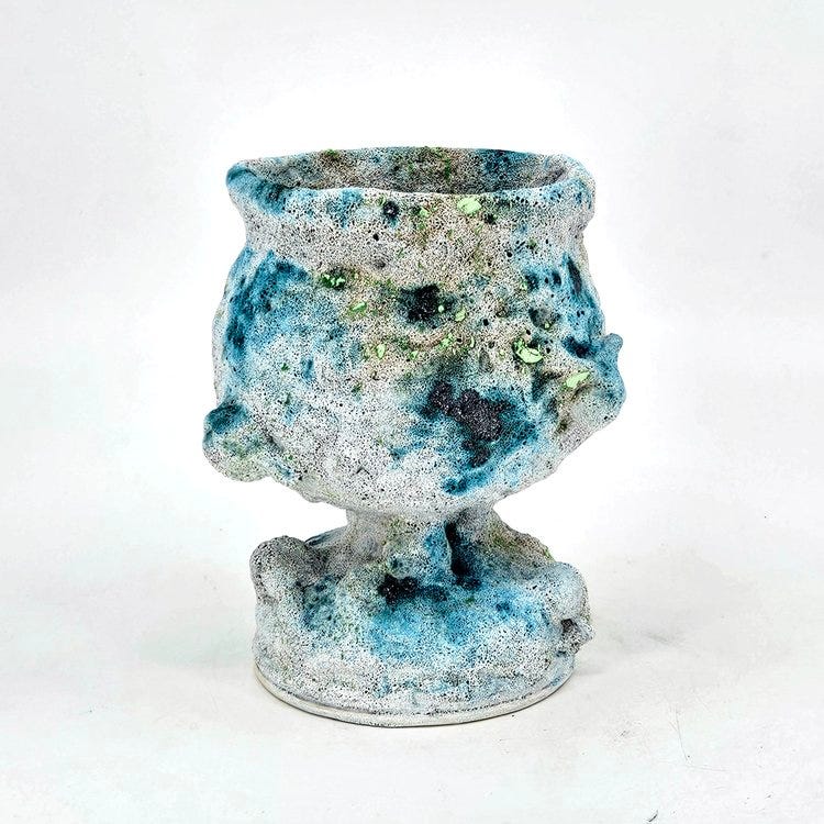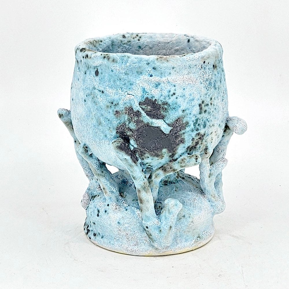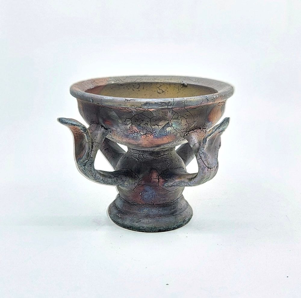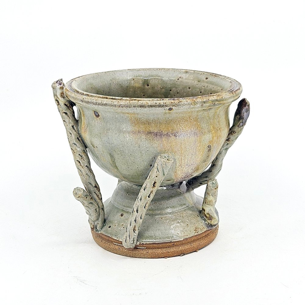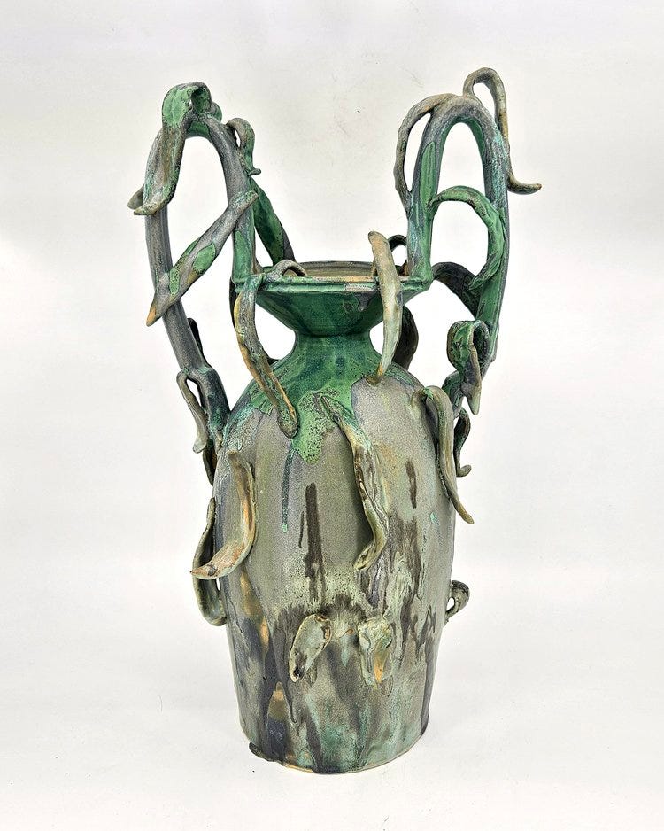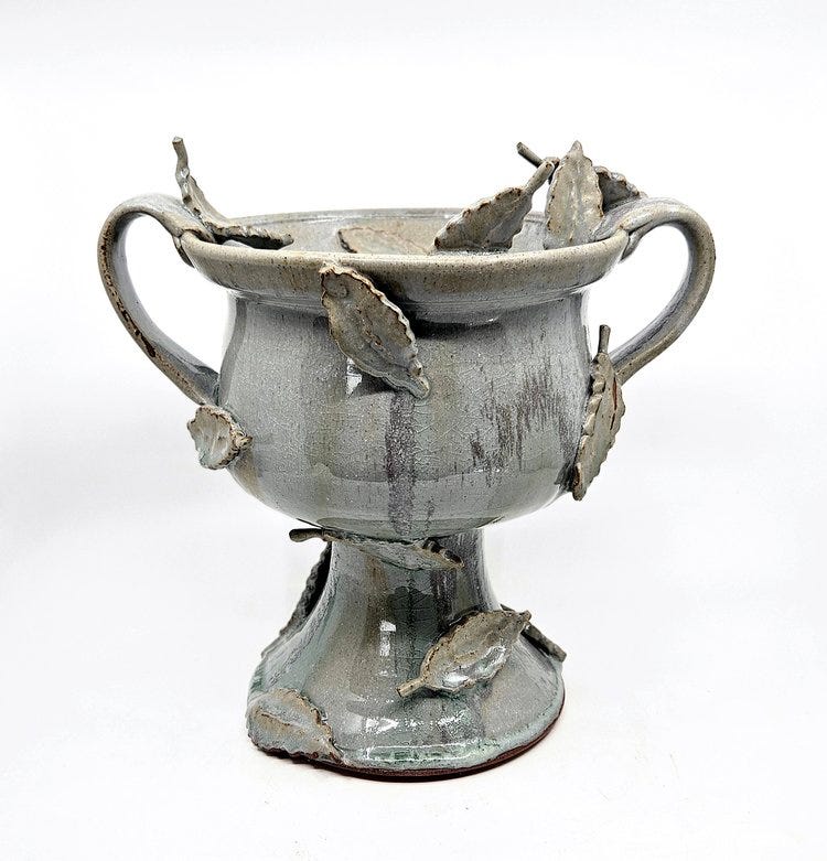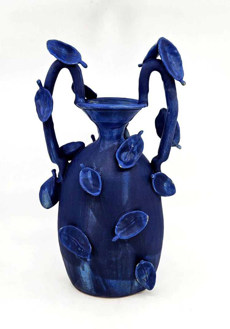 The vessels within H.P. Bloomer’s bodies of work are either stoneware or porcelain, which means they are fired at high temperatures giving them a stone-like appearance. These pieces of ceramics have an epic, mythological appearance, as if they were the personal vessels of the titan Prometheus, god of fire and earth. With an ancient and aged stone or bronze-like appearance, the vessels usually incorporate various slabs of foliage designs based on local Texan plants which H.P. has observed in the field.