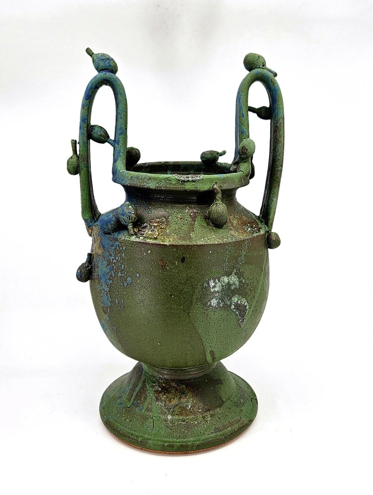 Typically containing neutral hues or bright colored glazes, the vessels are carefully toned with inconsistent yet mostly monochromatic colors which smear or spackle across the surface texture. These vessels appear ancient, similar to the appearance of Roman pottery but with contemporary design elements such as asymmetrically placed foliage slabs. Reminiscent of French Rococo painting and furniture design, the various strips of foliage and plant life are portrayed in intricate, stylized patterns, but placed unpredictably throughout the vessel's surface.