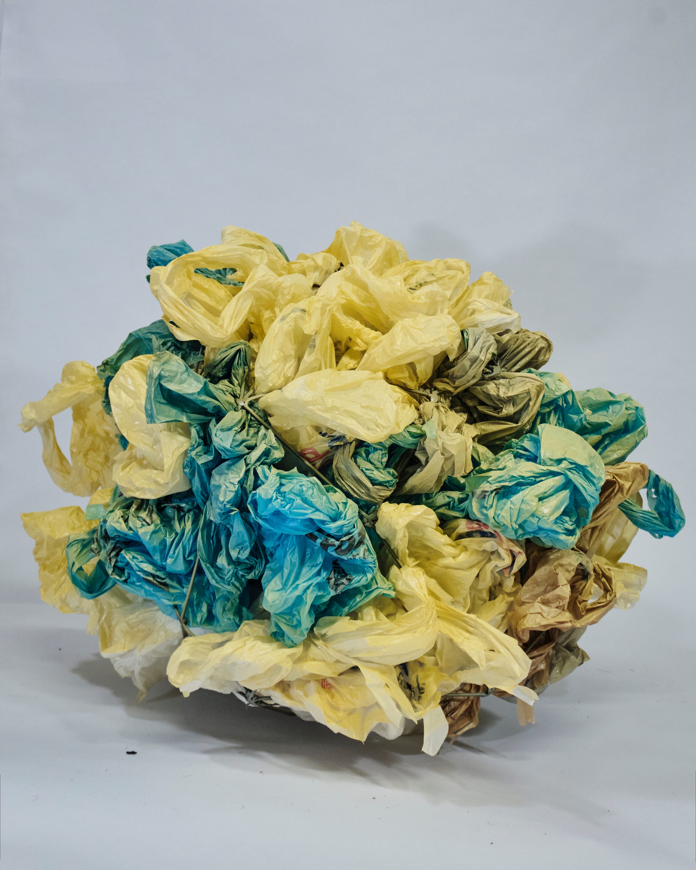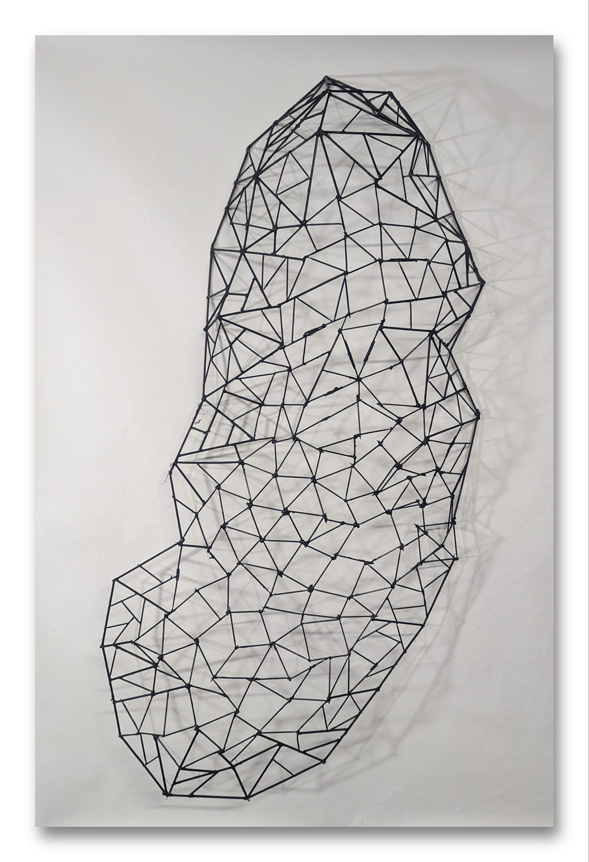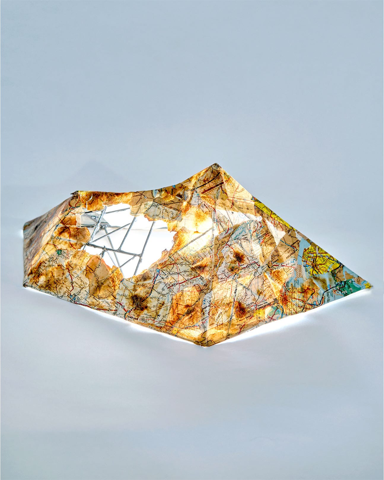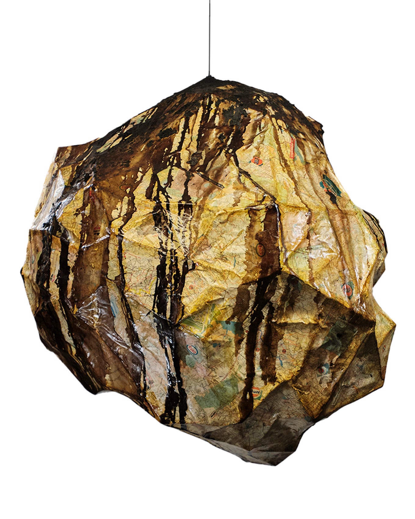 Moving on to Jeremy’s sculptures, A World of Plastic and Metal (top of article) remains a non-objective piece in the shape of an exoskeleton. The plastic, which could be tarp, plastic bags, or both, remains confined and contained within a circular cage of steel. Although coming off as painted, upon closer inspection the tones on the sculpture are the natural manufactured coloring of the plastic and materials. The sculpture almost comes off as crumpled up tissue paper crushed into a ball. An aesthetically pleasing work with bright colors which differs from the more direct and confrontational industrial pieces. His sculptures sometimes have a sociological context such as in the case of When Humans Used Fossil Fuels, They Transformed The Earth (pictured below). The three-dimensional piece depicts tar crudely dripped onto an asymmetrical exterior form made of gas station maps suspended from the air. An allegory towards dependency on fossil fuels and aging technologies.