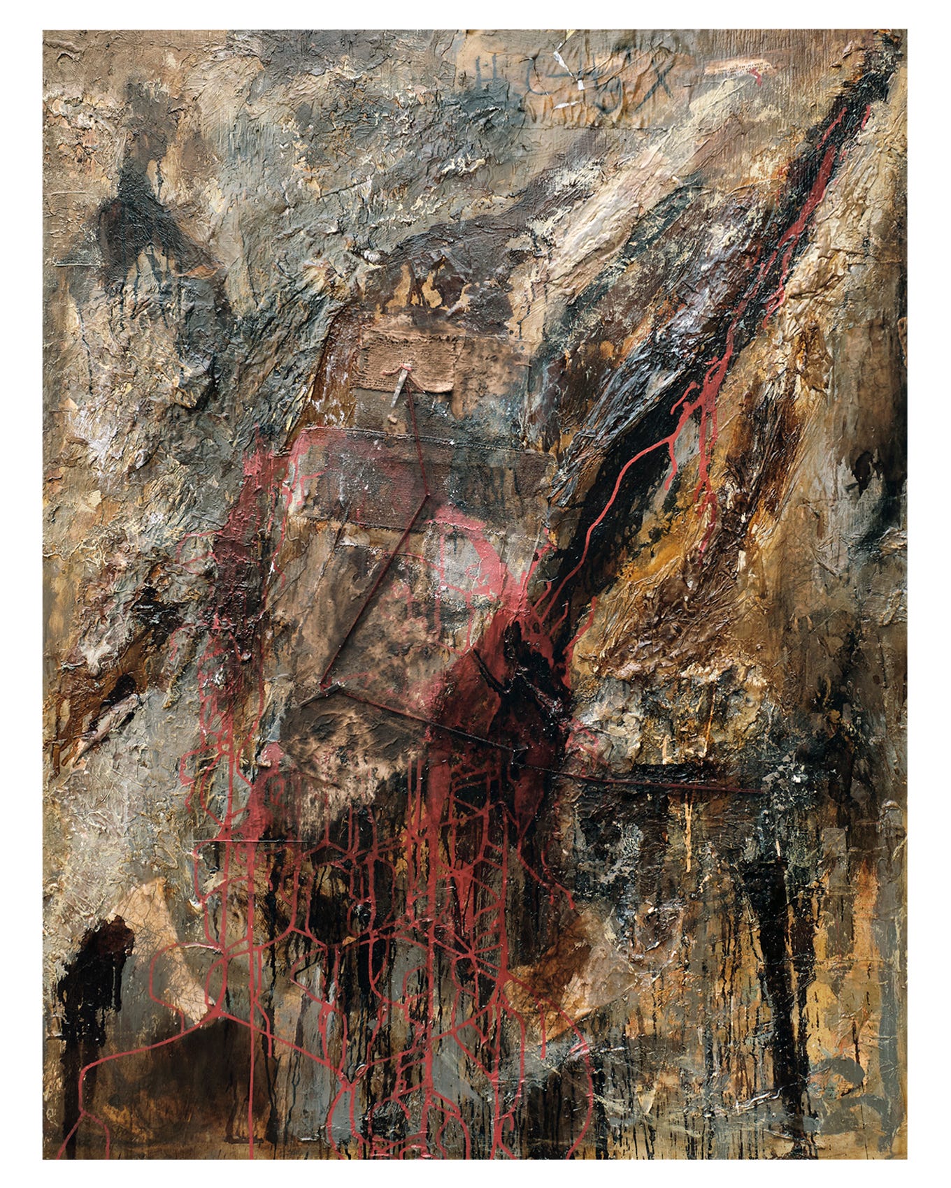 The works tend to portray rough and even crude surfaces. He incorporates strange industrial materials such as tar and joint compound and varnishes his works with shellac, an insect-secretion clear coat substance. The art seems to be influenced by geological, geographic, and topographic surfaces, Jeremy even has a series of works which are digital alterations of captured satellite images which reflect similar patterns to his purely abstract paintings. His sculptures can range from elegantly structured to crude and barbaric containing drips of tar or rough strips of material dangling from the surface.