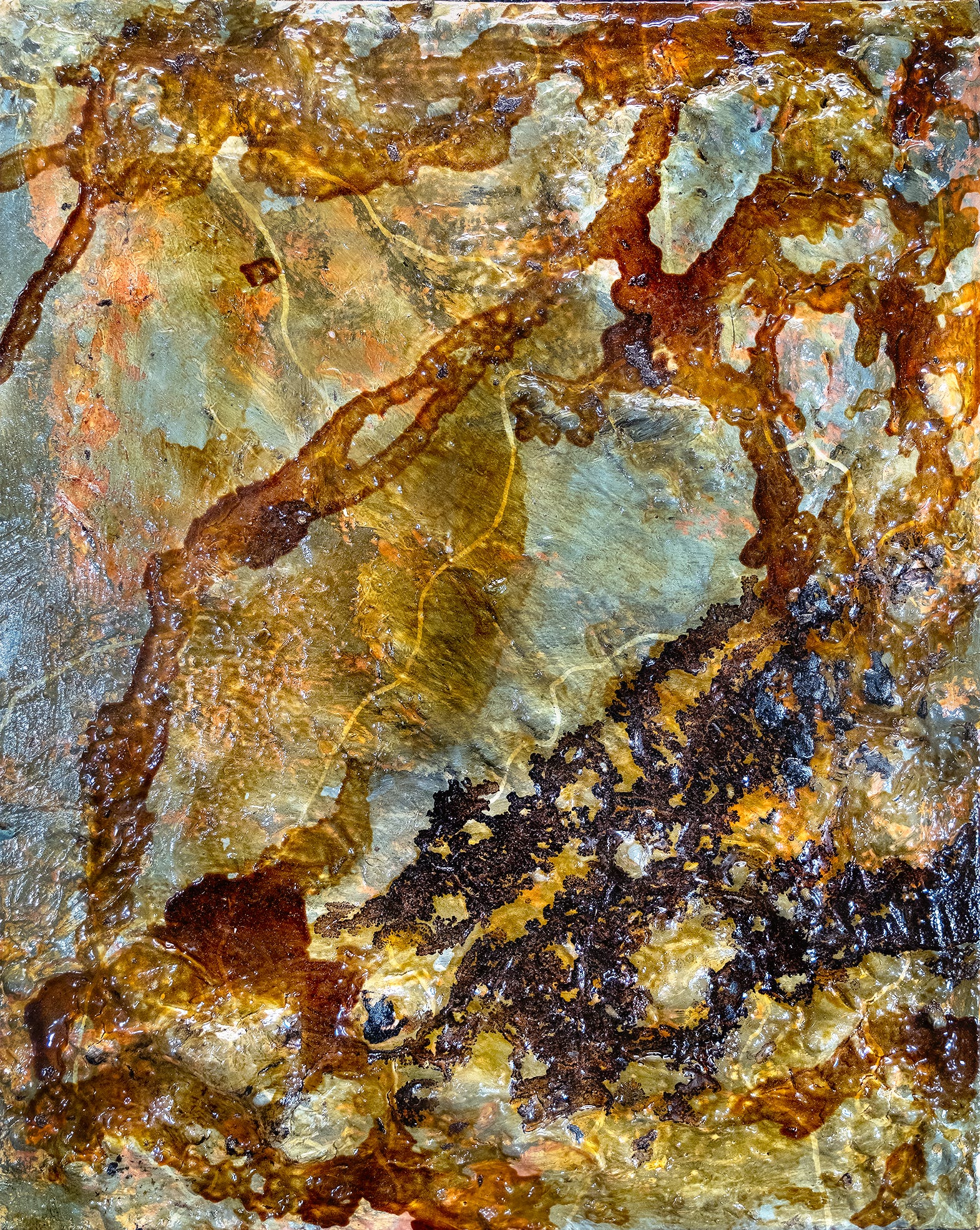 You Make A Map (pictured above) remains one of Jeremy’s most brutish works. The painting may come off as a total abstraction however in fact remains a depiction of the Shenandoah Valley in Virginia. Coming across as rustic and metallic, the painting appears smeared upon with intricate variations of texture. Ranging from metallic blues to rustic earthy tones, the work represents a sense of metallic sheen. If the viewer did not know the work was a painting, the audience could mistaken the art as a rustic sheet of metal pulled off an aged vehicle or large appliance. The junkyard, industrial aesthetic of the painting imposes pure grit and removes our comfort zones.