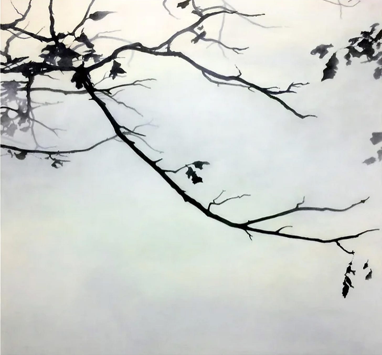 These realistic landscapes and portrayals of foliage and branches reflect deep connotations with solitude and reflection. We discover the actualized nature of the American countryside through the documentative approach of the artist. Jo breathes life onto these compositions, not by adding color, but by recreating a composure, an orchestra of variation in tone with deep contrast and subtle application of her tool. The viewer will explore the grand open landscape or the scenery above our heads as leaves and twigs fall into our line of vision. With a sense of line of sight and deep observation, Jo reveals an aspect of the rawness of nature through monochromatic purity and detailed portrayal.