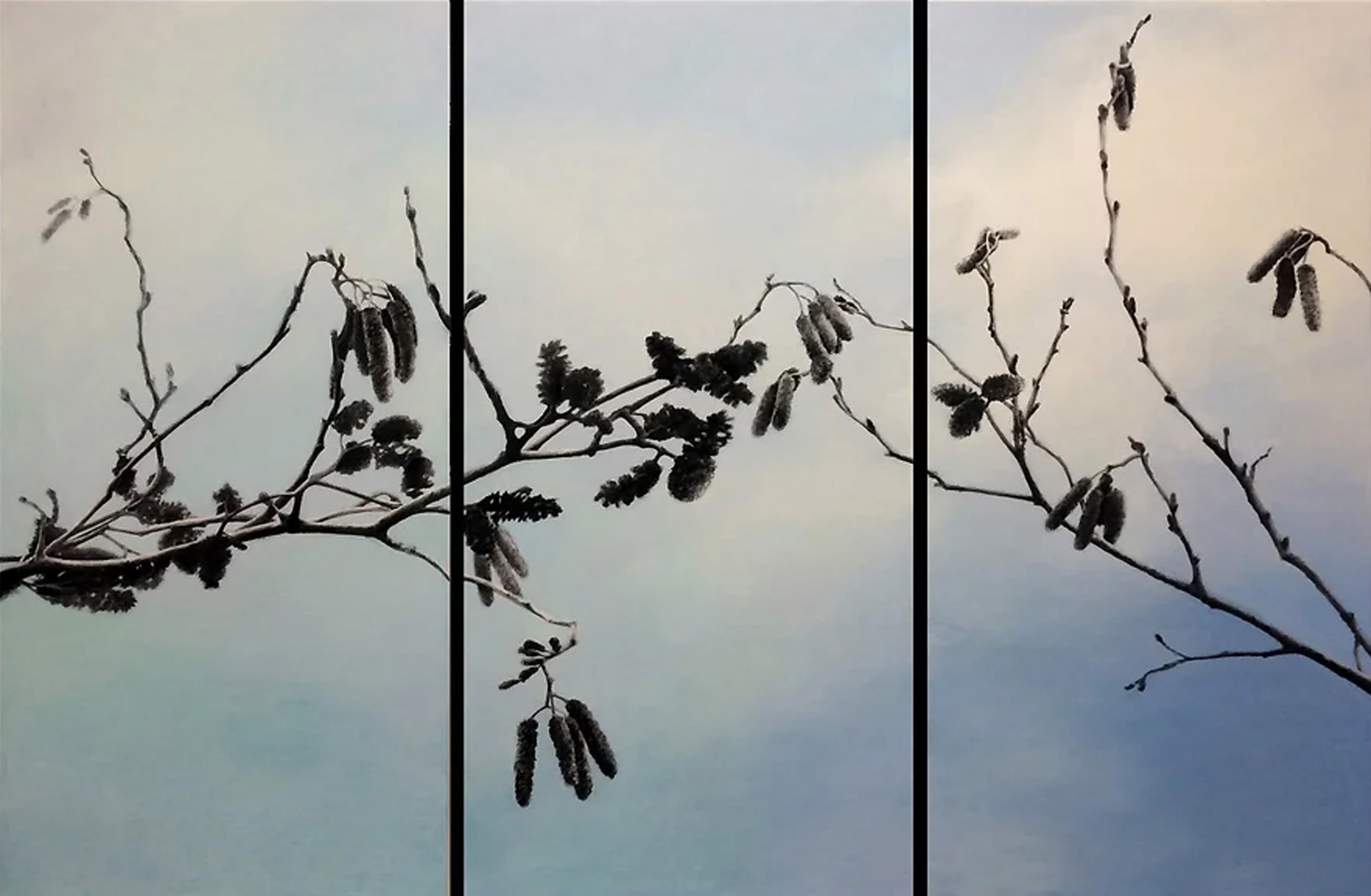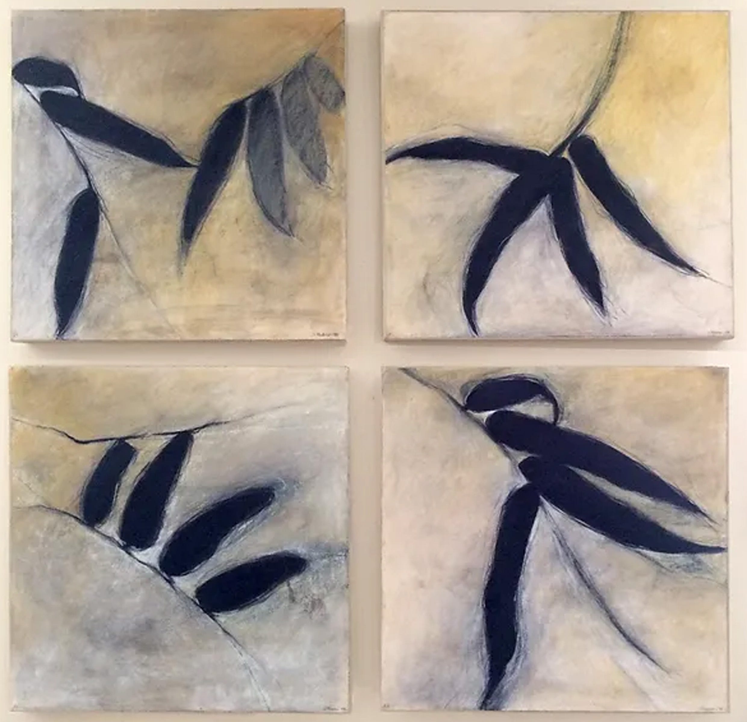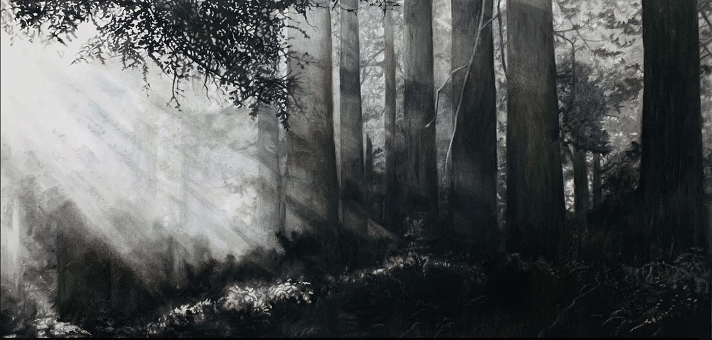 Jo Peterson reveals the inner character of herself and the landscape she portrays. The works have a life of their own, despite their monochromatic tendencies. These black and white drawing depictions with careful glazes of acrylic represent variations of realism which range from the photographic, design-based, and reflecting compositional purity. With an eye for detail and deep inclination to explore her surroundings to find the perfect opus for her compositions, Jo Peterson reveals a draftswoman deeply dedicated to her craft to reflect nature in poetic terms which enhance the inner characteristics of self-reflection as well as the meaning beyond depictions of nature beyond color and openness. Jo’s closed and isolated compositions could be described as the defining characteristics of her works, as she fine-tunes the viewers focus on the relevant nature of her selective scenery. She guides us to her vision of nature through creative cropping, monochromatic application, en plein air studies, and integrative techniques which rely on a variety of mediums to enhance her drawings.