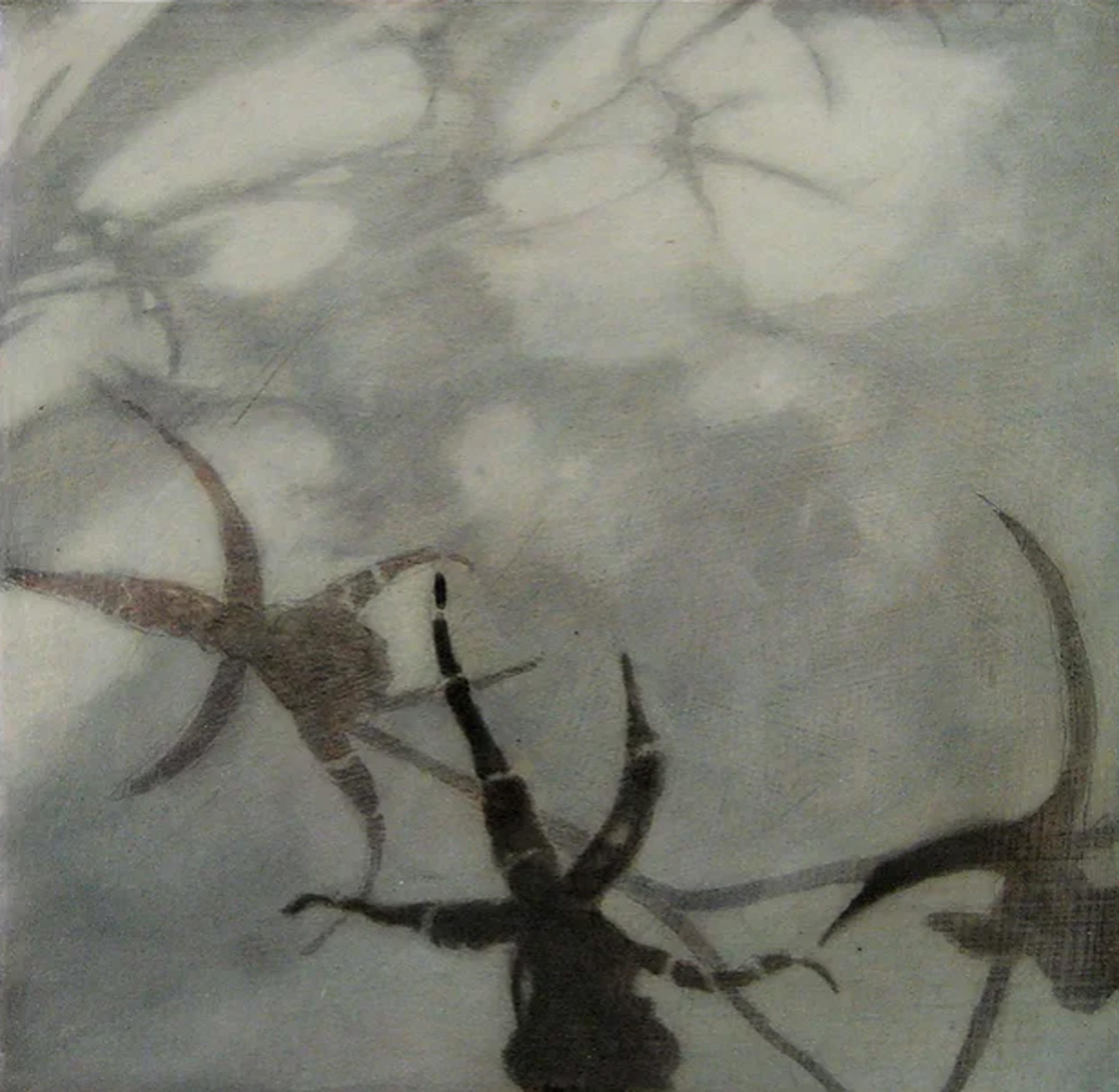 Using complex and varied techniques, Jo will create her drawings by either basing them free-hand from sketches and photography she takes in the field, over digitally-manipulated photographed prints, or by tracing the outline through a projector. She applies acrylic glazes over intricate charcoal and graphite drawings of foliage and landscapes. These poetically monochromatic works have deep inclinations with respecting the realism of the form yet abstracted structure of the compositional outline of strategically placed foliage and fauna.