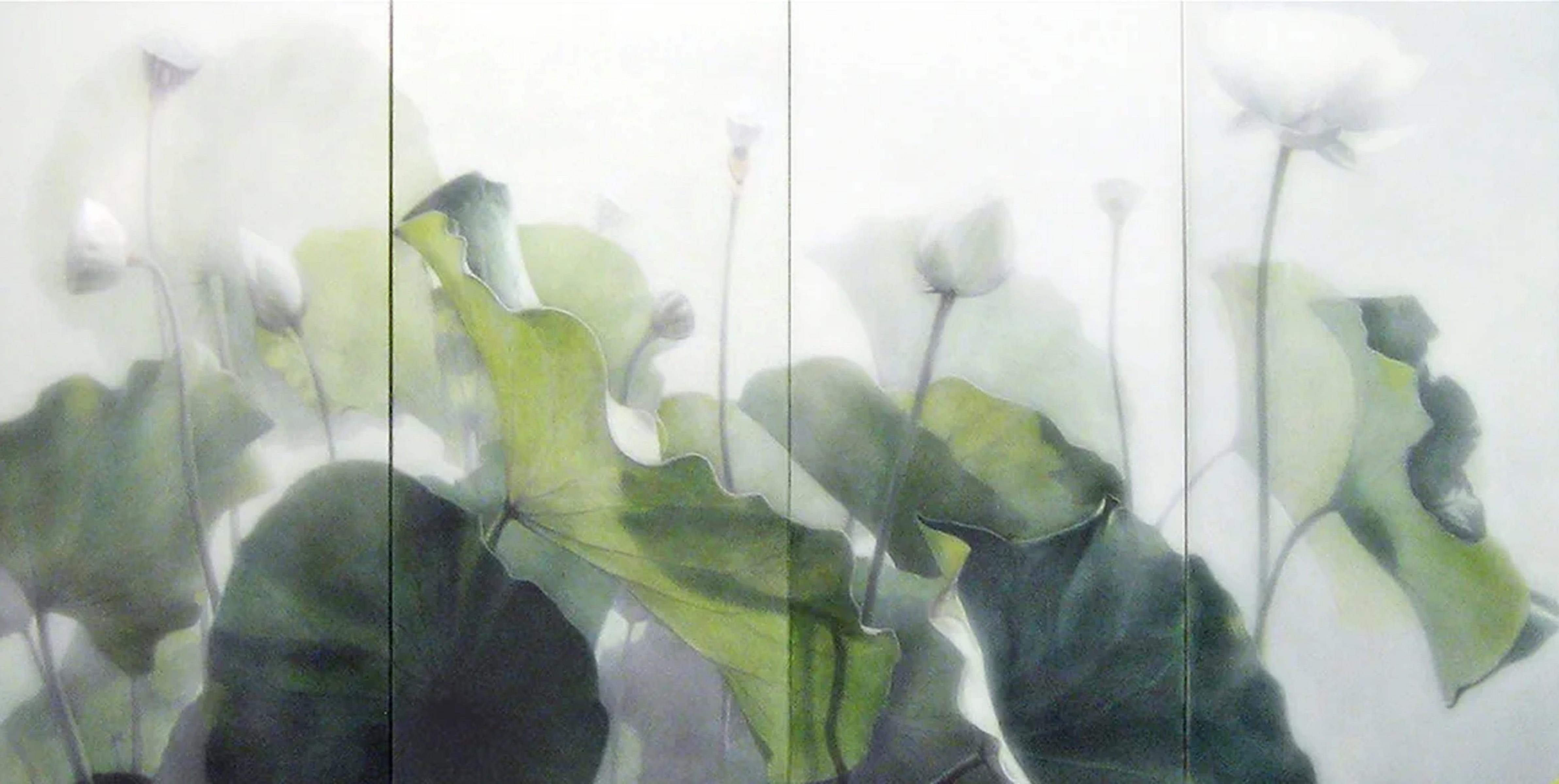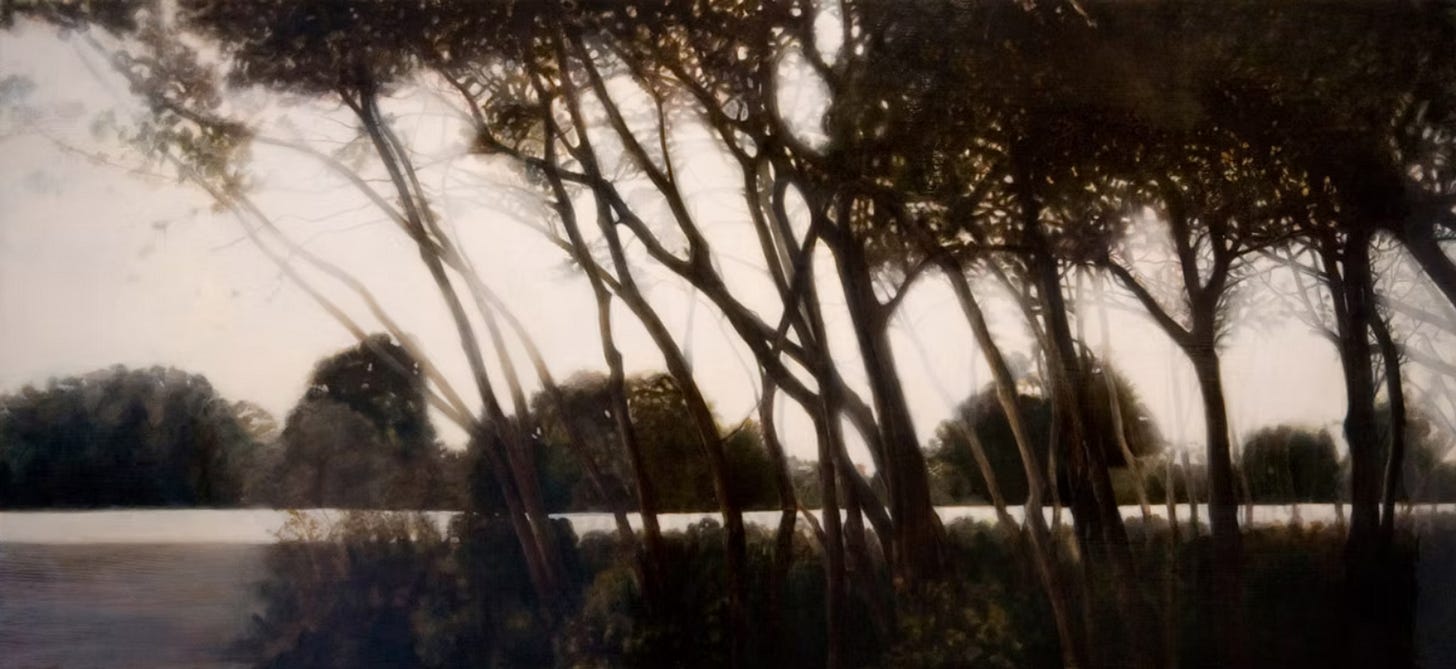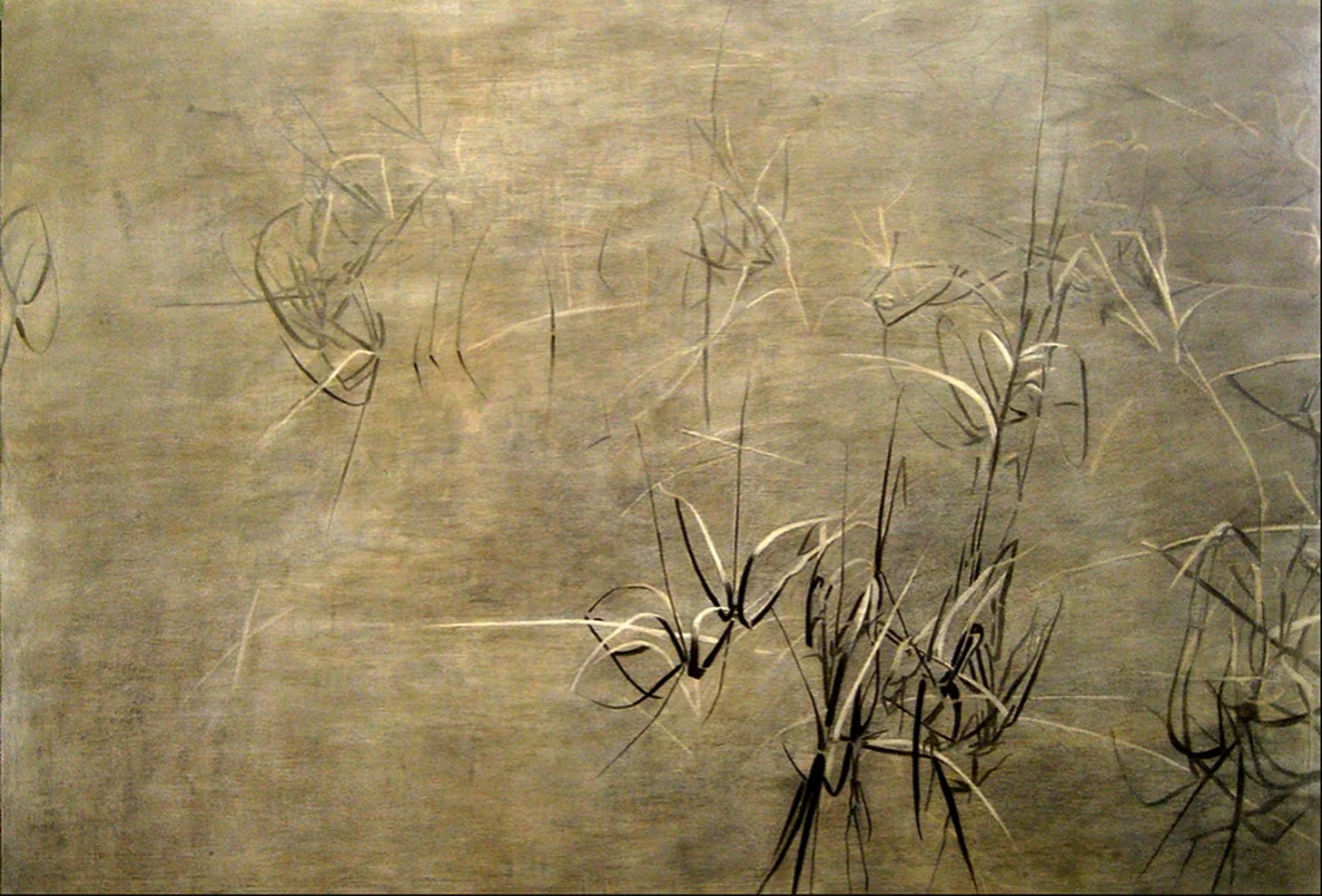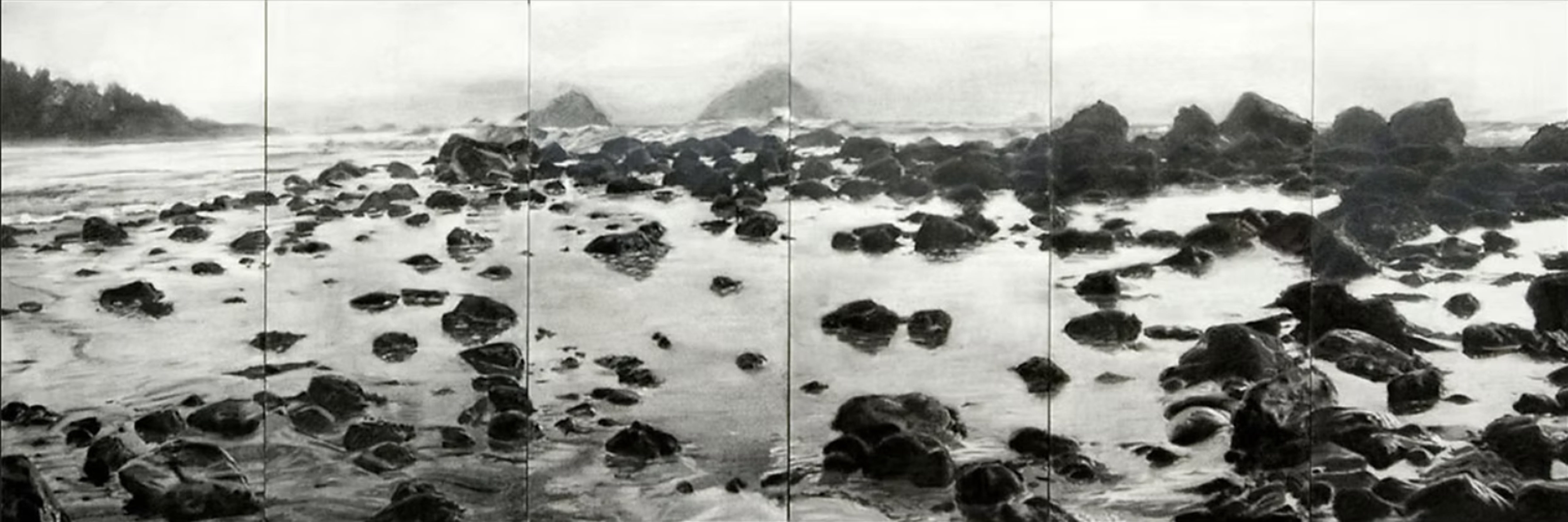 Klamath Cove (pictured above) based on a landscape from Northern California, represents a deep realization of sfumato and mood. Such a theatrical and poetic display of the ocean bay reveals stones which accentuate the composition, contrast, and water. The landscape represented in a grand panoramic view conveys an openness and rare sense of freedom of form through monochromatic purity and expression.