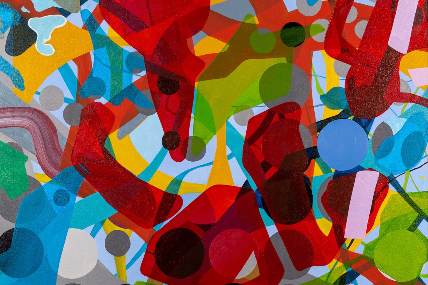Viewers instinctively recognize Joe Camoosa makes art informed by a cacophony of sights and sounds through his forms, reinforced by titles. He works towards finding harmony in the dissonance. His paintings generate aesthetic syncopation in the truest sense, as he distills his environment into the most basically understood elements of design. He has said he aspires to create visual images which function “like a song you don't want to end”. While his individual pieces can be read as singular visual melodies and musical phrases about life and art, an overarching interplay of color, line and texture creates a continuous, and boundless sound.